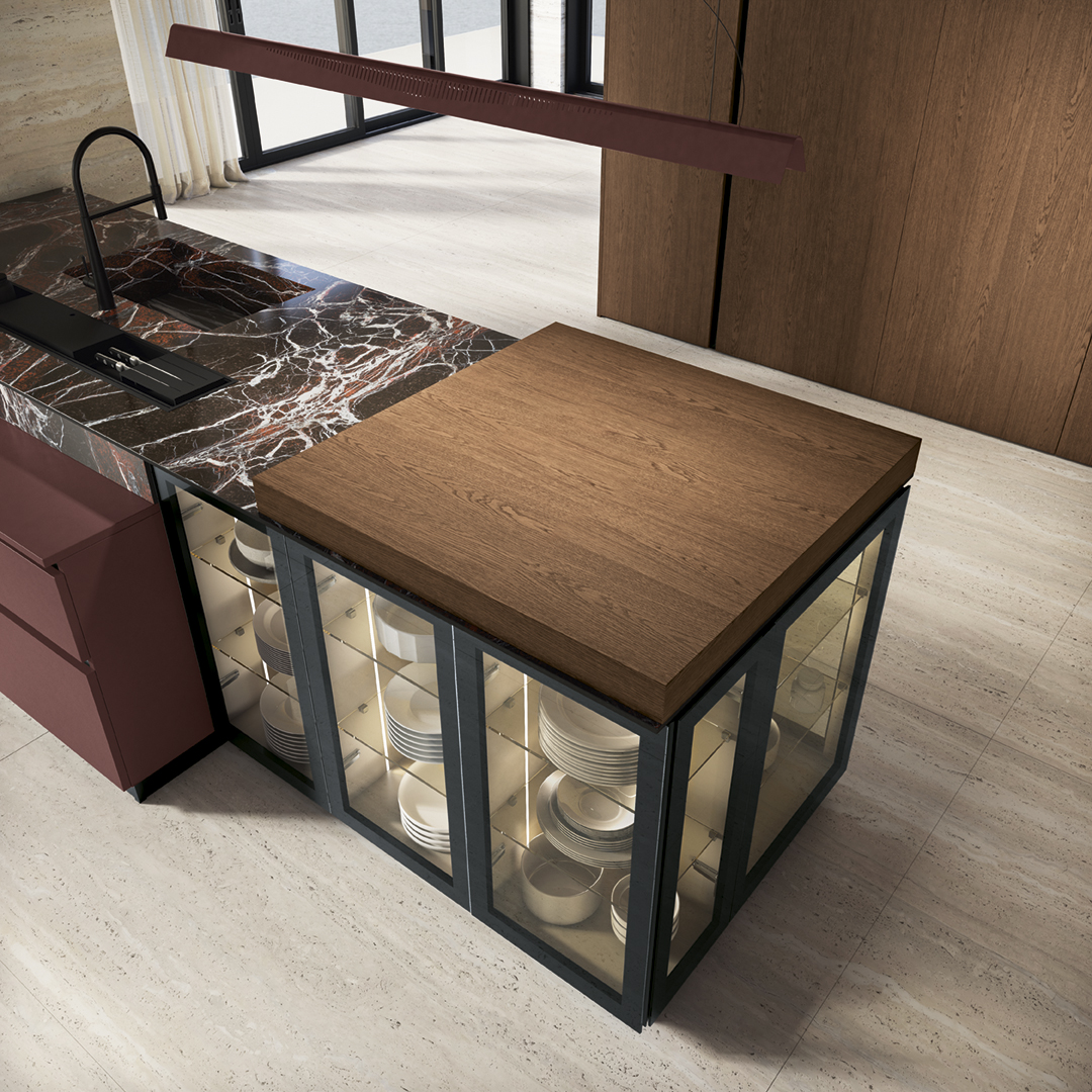 Cuore della composizione è l’isola centrale che assume un ruolo operativo ma nello stesso tempo conviviale.