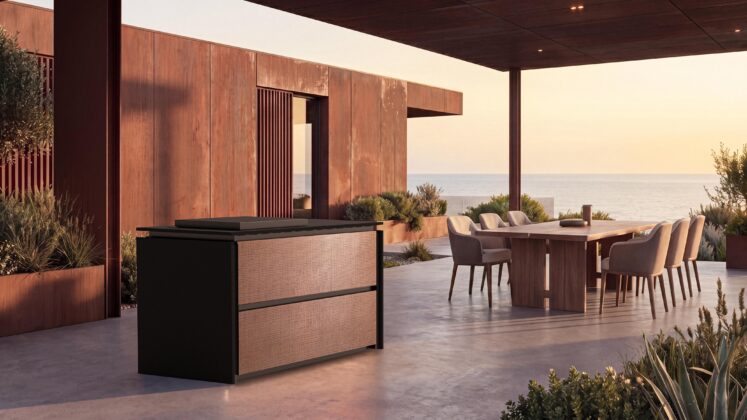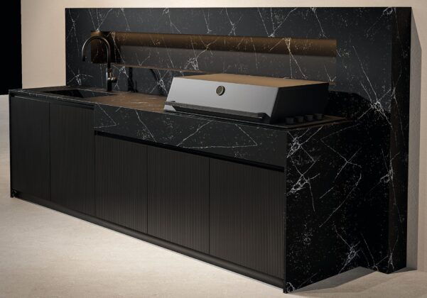 Nello stand di Eurocucina, Arrex ha presenta nuova proposta per outdoor, pensata per chi non ama compromessi tra prestazioni tecniche e ricerca stilistica. Il segreto della durabilità estrema del modello risiede nella scocca interamente realizzata in alluminio, che garantisce una resistenza totale agli agenti atmosferici, alla salsedine e alle escursioni termiche, eliminando rischi di ossidazione o deformazione nel tempo. La struttura è completata da una gola a "L" e da uno zoccolo alto 8 cm in metallo laccato Nero RAL 9005. Protagonisti estetici del modello sono il vetro cannettato Wave nero delle ante e il Quarzo Ecotone New Era nella finitura Crono Tatum, impiegato per il top e il lavello integrato, le fiancate e lo schienale. La speciale tecnologia Ecotone utilizza componenti riciclati e resine di nuova generazione a bassissimo contenuto di silice realizzando una superficie dalla matericità profonda e creando un effetto monolitico elegante.