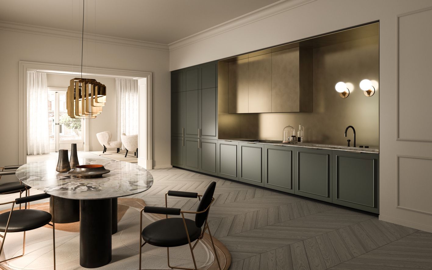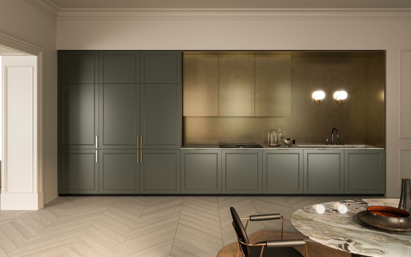 Cuvèe di Key Cucine con nate laccate color Wood Green e pensili e boiserie in laccato metallizzato ossidato