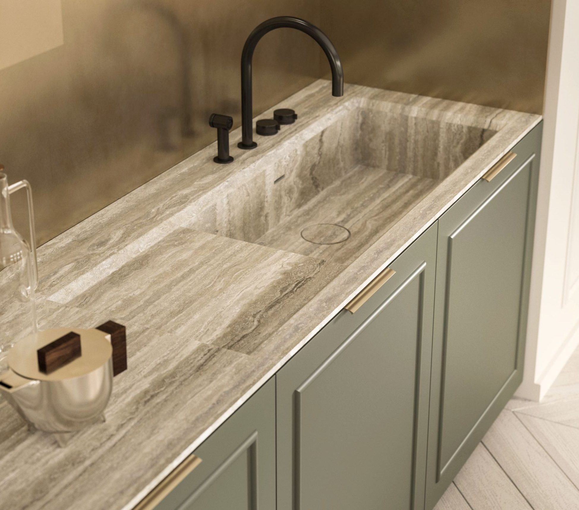 Key Cucine, modello Cuvée: il travertino impiegato per top e lavello integrato