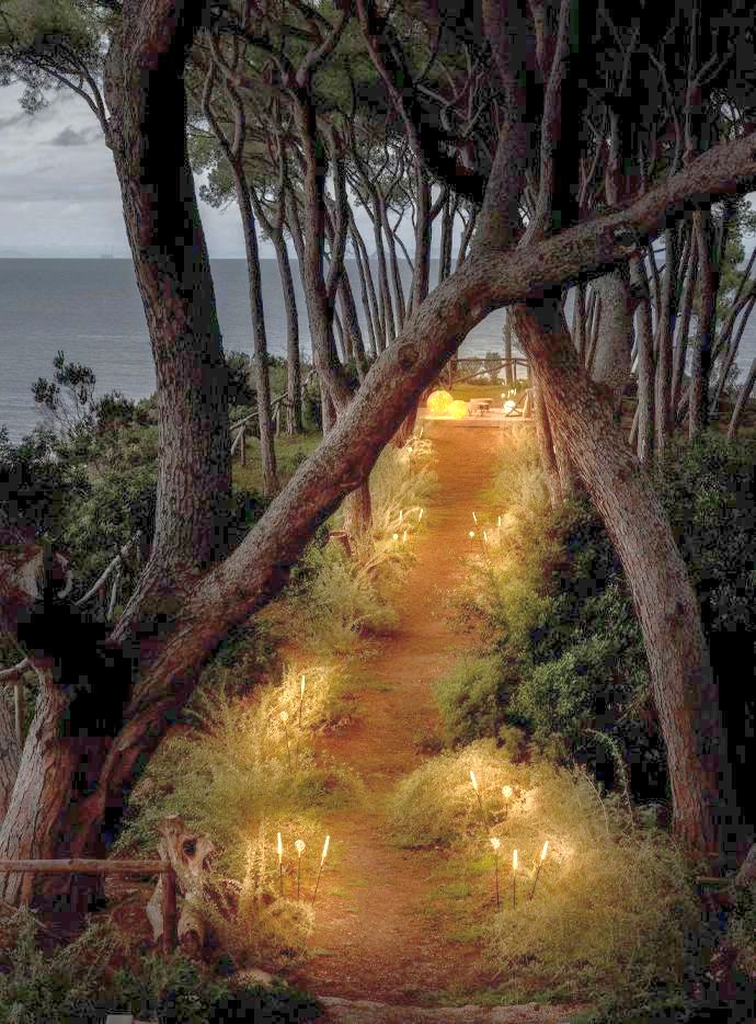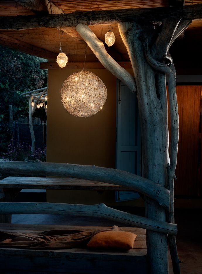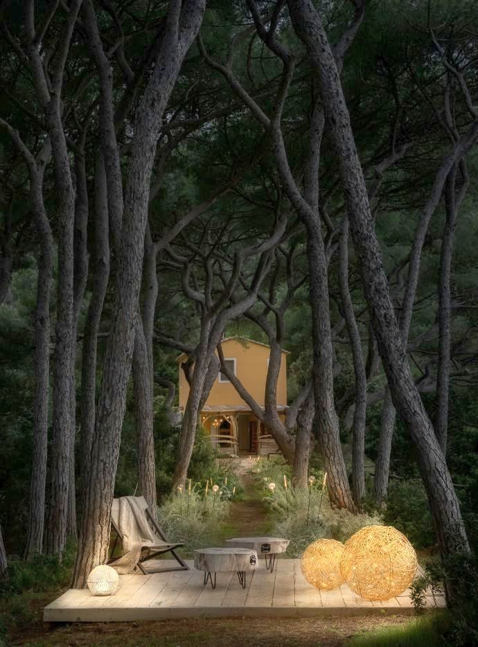 Nell’Isola d’Elba, collocata su un piccolo promontorio affacciato sul Mar Tirreno, Villa Calanova (FOTO IN APERTURA) è un rifugio "magico" immerso in parco di pini marittimi e dominato dalla quiete. Dentro la villa - attualizzata dal restyling del fotografo e interior designer Adriano Bacchella - i materiali naturali interpretano arredi dal sapore rustico, mentre il design contemporaneo delle lampade di Catellani & Smith accende gli spazi della pineta e della casa. Tra gli alberi, sulla pedana a terra, sono posate le preziose sfere Fil de Fer in finitura oro (modello impiegato anche per la zona pranzo outdoor) e la lampada Medousê, mentre tra la vegetazione affiorano le delicate lampade a stelo Syphasera, Syphasfera e Syphaduepassi.