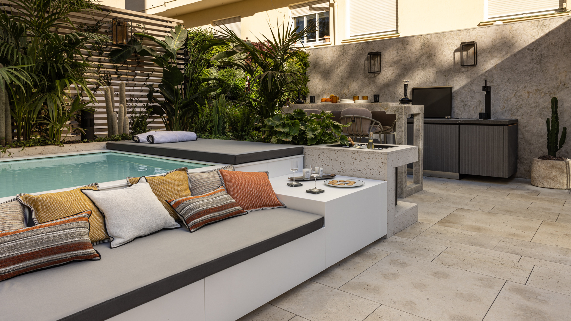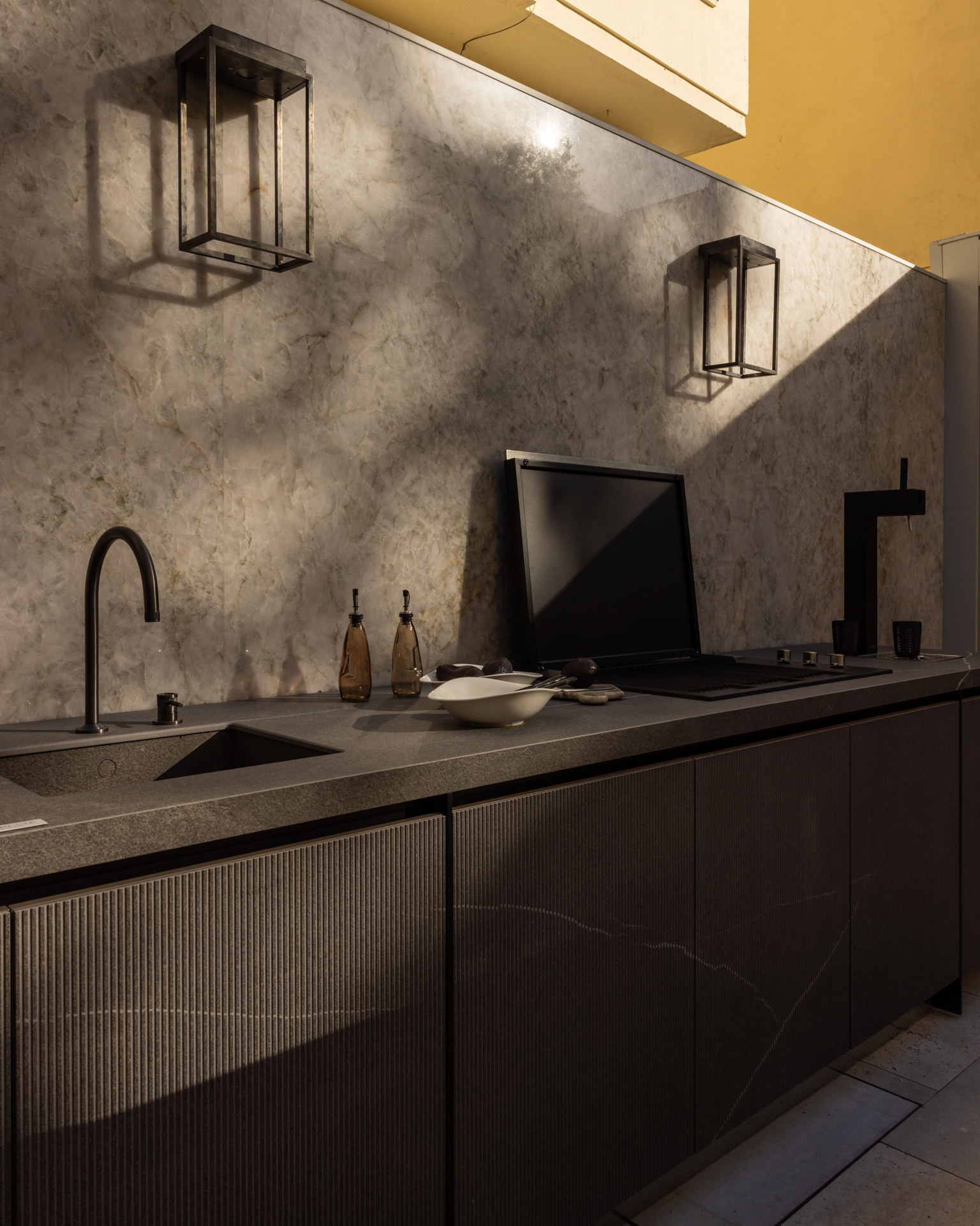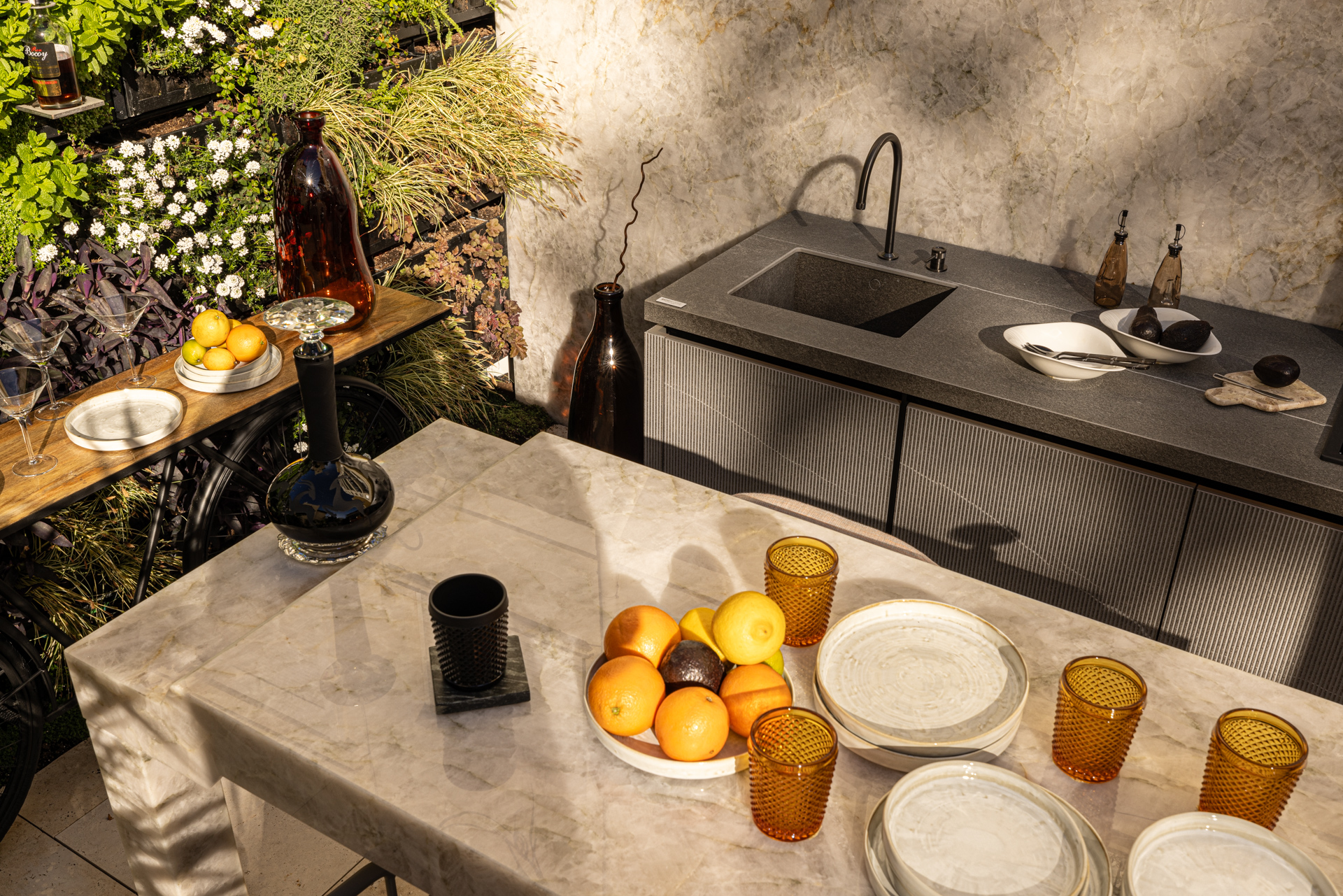 L'eleganza di Scavolini si può apprezzare anche all'aperto, con il modello Formalia Outdoor, che costituisce l'ampliamento del sistema casa Formalia, disegnato da Vittore Niolu. In questo grande pat, la cucina con ante in acciaio inox e con top in Dekton Entzo (spesso 2 cm) è attrezzata con BBQ e lavello. La composizione si avvale del sistema Parete Status, struttura modulare in alluminio che alloggia basi alte o ribassate e vani a giorno, qui con finitura Titanio. Peculiarità di Formalia - sia outdoor sia indoor - è l’anta sagomata e disponibile sia in acciaio sia in legno.