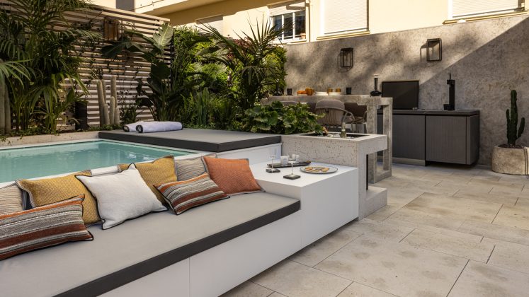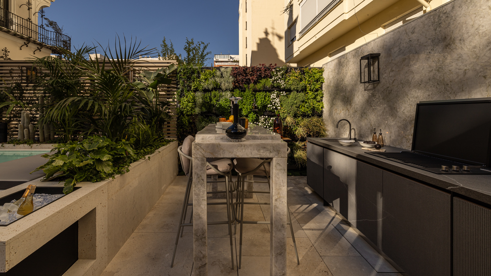 In Spagna, a Madrid, uno spazio outdoor luminoso e verde è arredato con una cucina dotata di tutte le apparecchiature per cucinare en plein air. E' il progetto creato da Raquel Chamorro, che rende protagonista la cucina per esterni di Novara, modello N3, finita in Piasentina di Sapienstone, materiale eccellente che abbina resistenza e bellezza naturale che qui riveste sia il piano di lavoro sia le ante finite con decorazione a fresature verticali, e quindi scelto in 2 spessori: da 6 e 12 mm. Lo spazio residenziale outdoor comprende anche un giardino verticale, un solarium con piscina, e una zona chill-out.