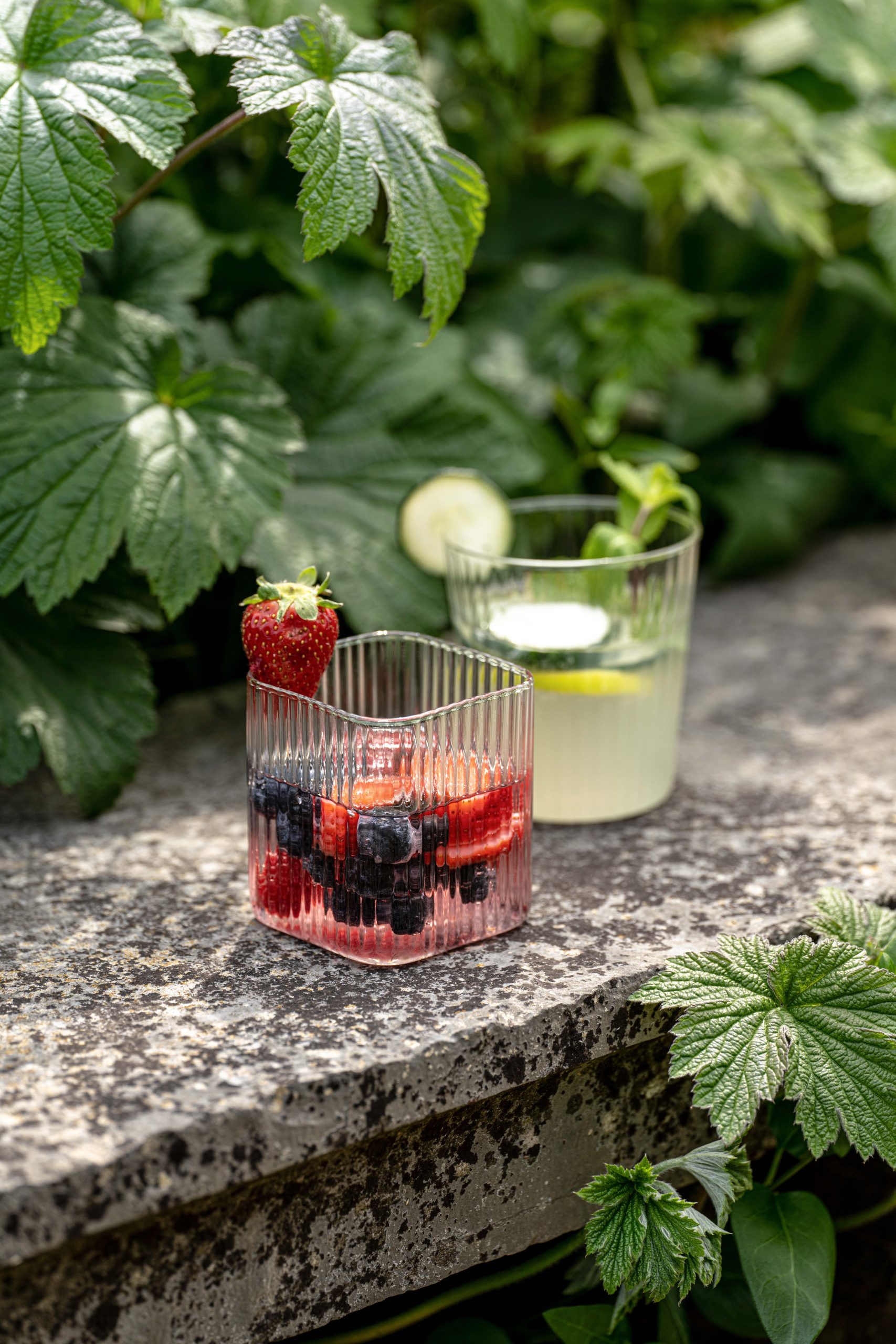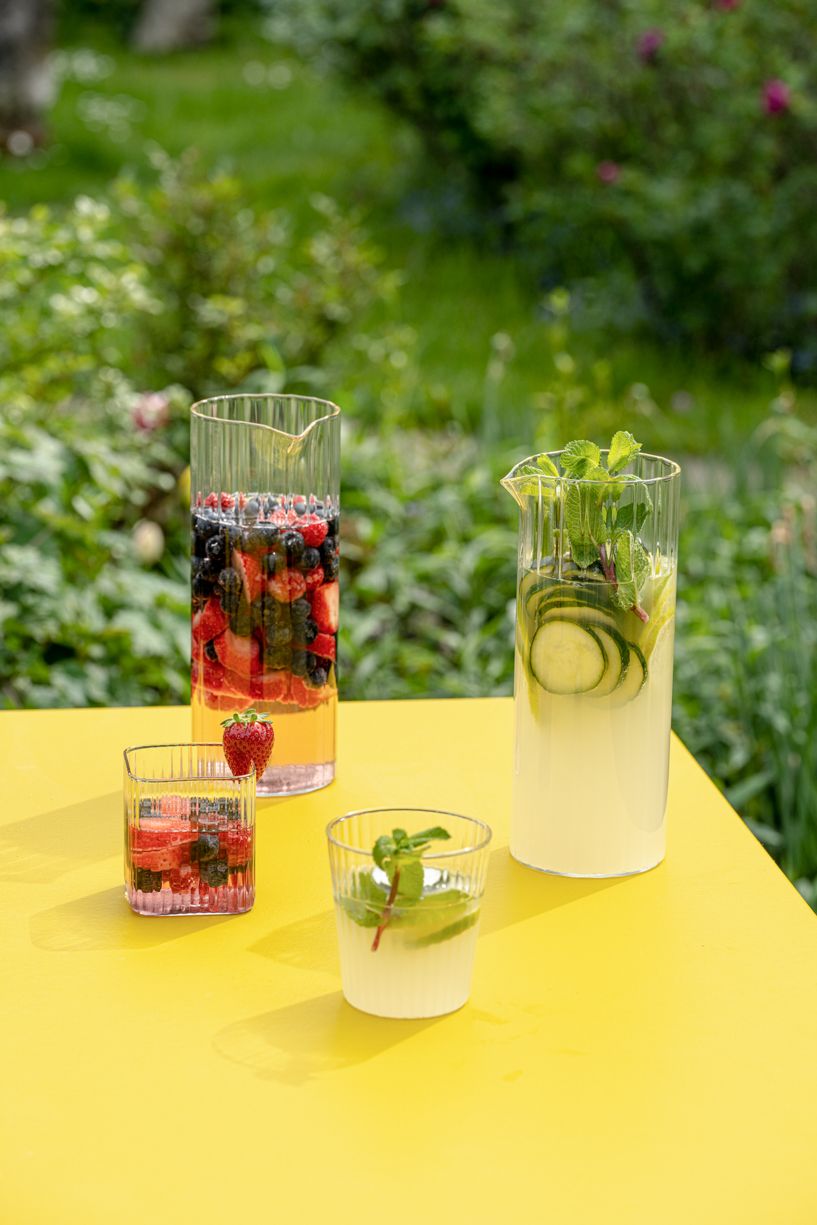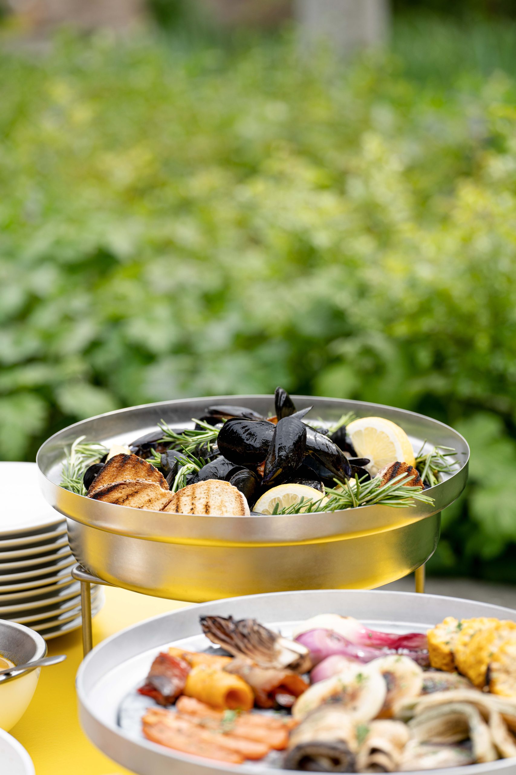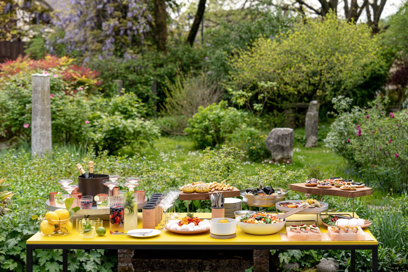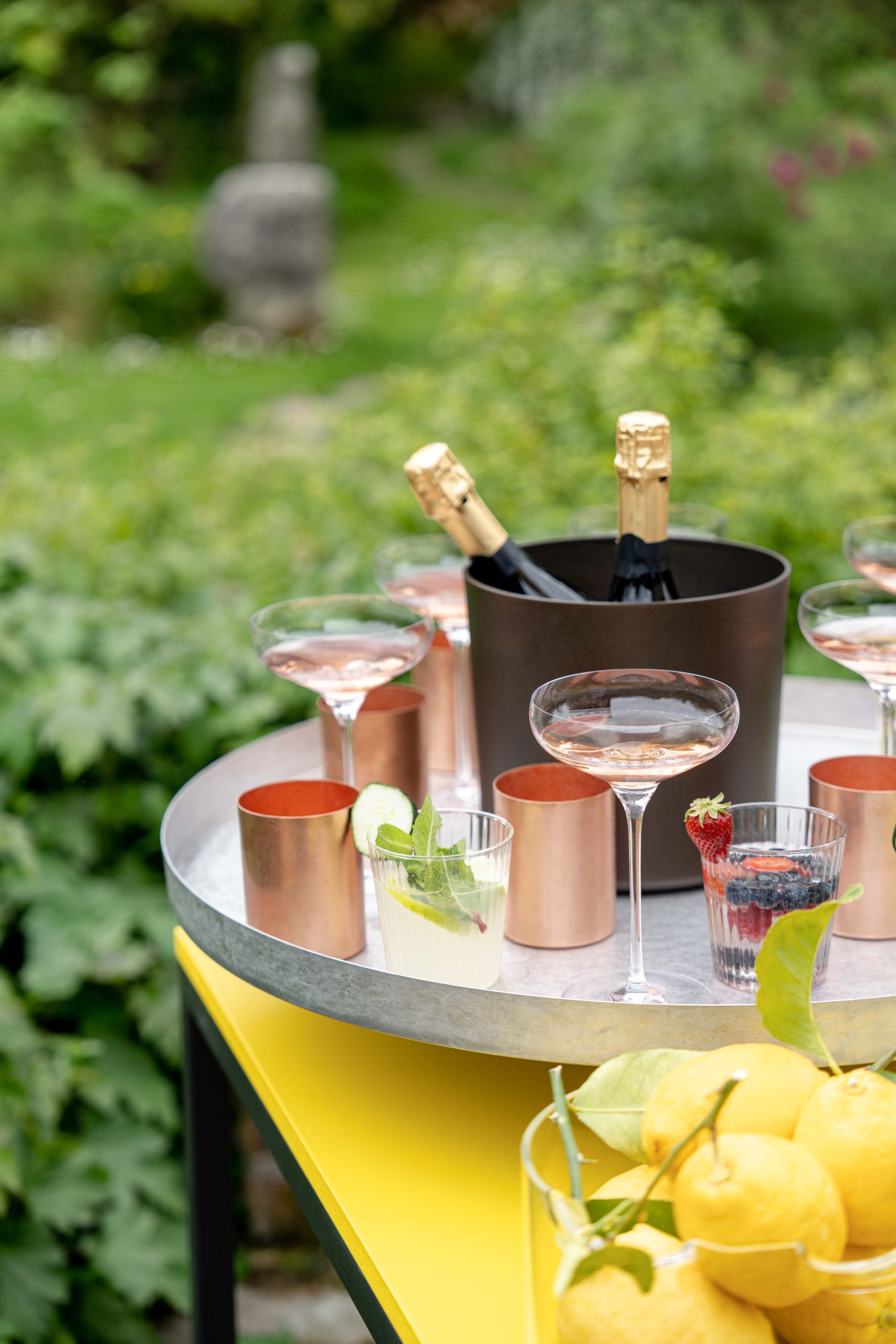 Per pranzi, cene e aperitivi all'aria aperta, knIndustrie presenta i nuovi servizi e oggetti per la tavola come si vede nell'elegante mise en place, che racconta la nuova arte di servire. Da sinistra, Live/Ly reinterpreta il classico vassoio da bistrot e accoglie i bicchieri da cocktail e la kn Glacette in bronzo; particolare Cast Away (design Sabrina Lazzereschi), bicchiere in terracotta per long drink. Cocktail e bevande sono serviti nei bicchieri e nelle caraffe della serie Groove in vetro borosilicato. Al centro, l’alzata Cube (design Marcello Ziliani) in finitura stone washed, disponibile in due altezze. E ancora, taglieri Scultura (design Sirine Graiaa).