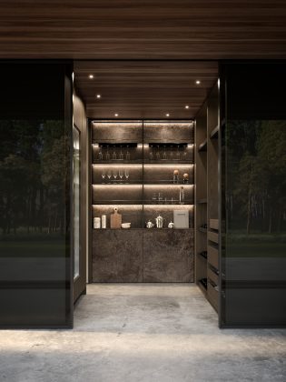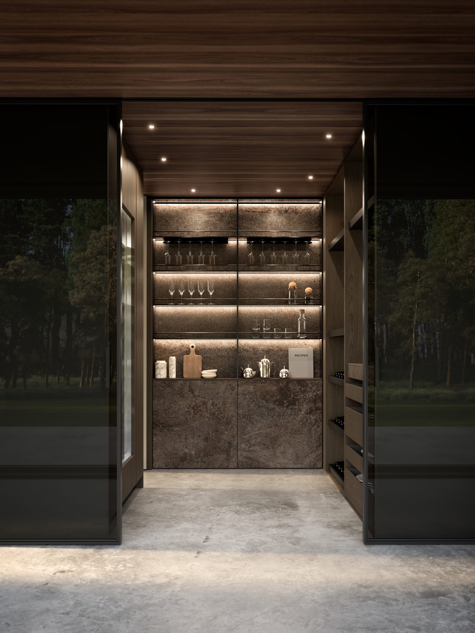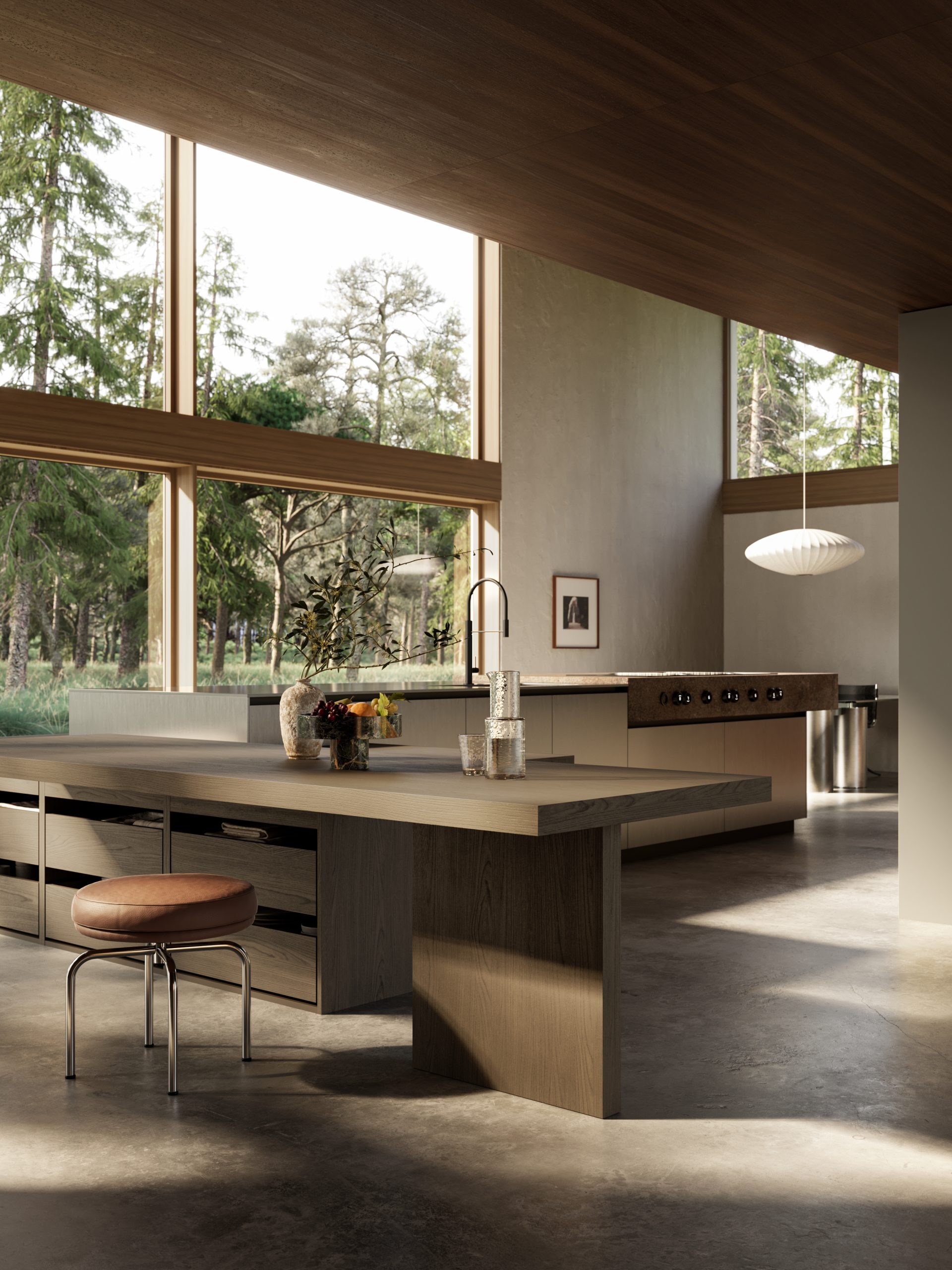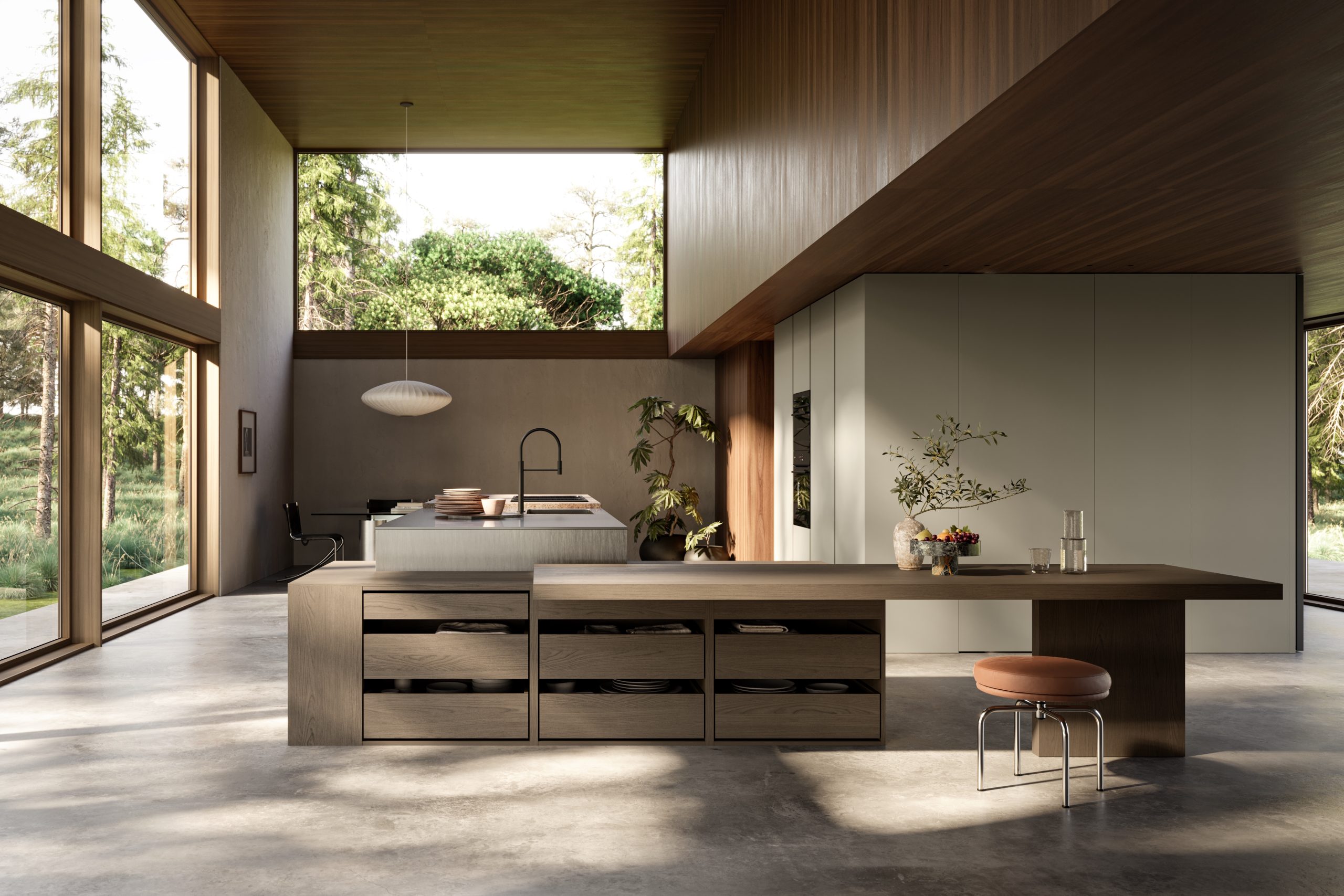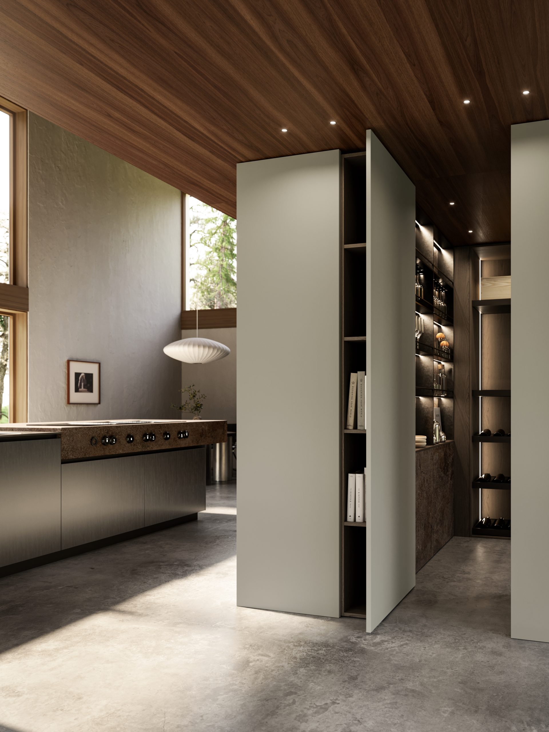 Si ispira alla visione MADE il nuovo progetto D12 di Doimo Cucine, una soluzione dalla progettualità spiccata, ricca di elementi che concorrono a definire diverse aree tematiche (come zone deputate a preparazioni/compiti). Per questa proposta è stata scelta l’anta D12 (ovvero di spessore 12mm), con un’anima in alluminio, 100% riciclabile. L’ambiente è molto luminoso, ispirato al mid century con un’architettura che gioca sui volumi, i grandi spazi e il rivestimento di pareti e soffitti in legno: un ambiente evocativo con luci soffuse e ombre che vengono riflesse sui materiali pregiati della cucina. L’isola è caratterizzata da basi laccato satinato Piombo, il top di due spessori nei materiali Gres In-Side Porfido Marrone e acciaio inox satinato. Le basi a giorno e il piano-tavolo sono in Impiallacciato Premium olmo Michelangelo. Il blocco colonne (in laccato opaco Grigio Seta 7044) nasconde una cambusa con winery, con una cantina a tutta altezza per la refrigerazione del vino e lo spazio per porta bottiglie, calici e accessori. L’ingresso in questa zona è possibile grazie alla colonna walk-in nella zona a lato del tavolo, e dalle vetrate architettoniche nel retro delle colonne.