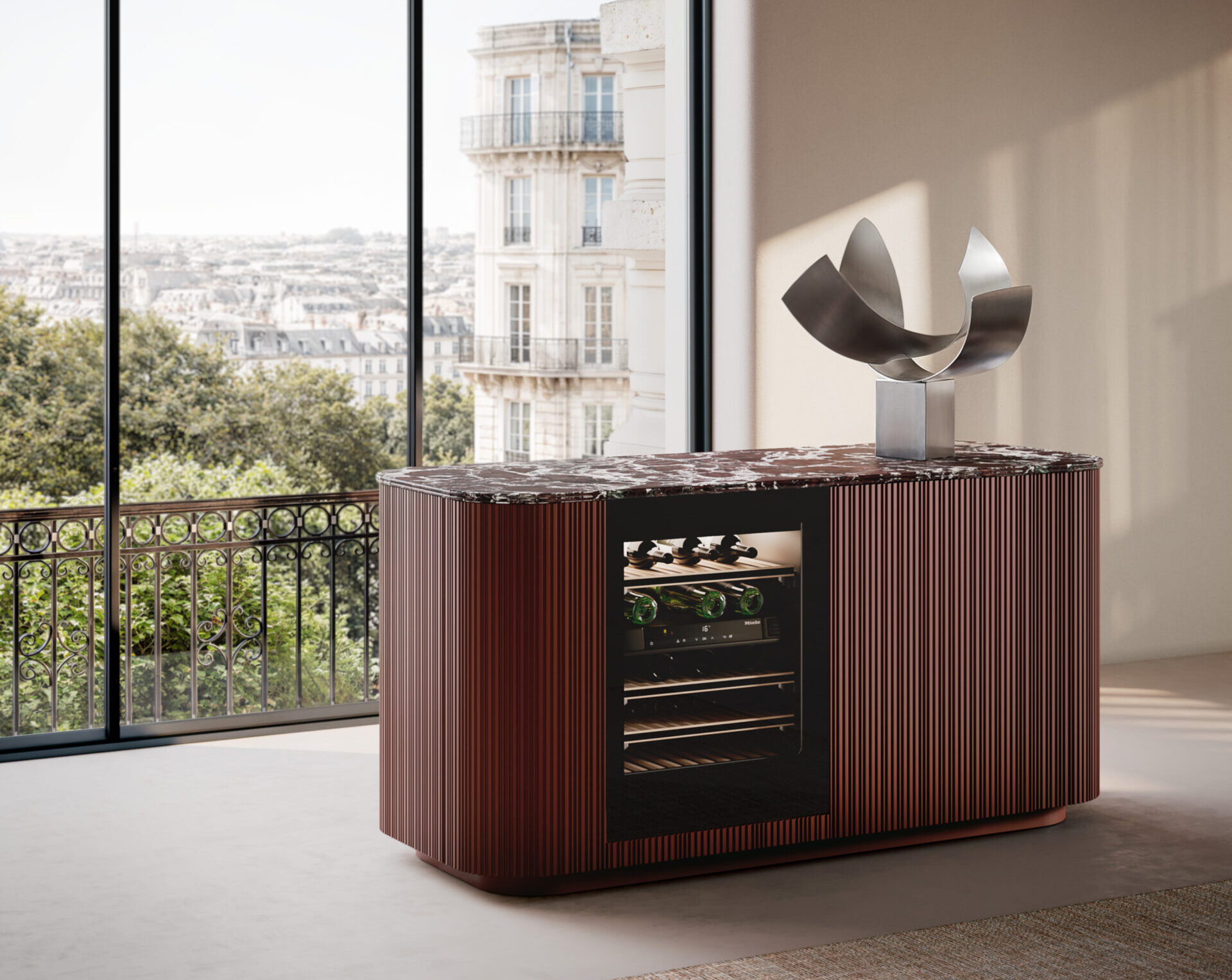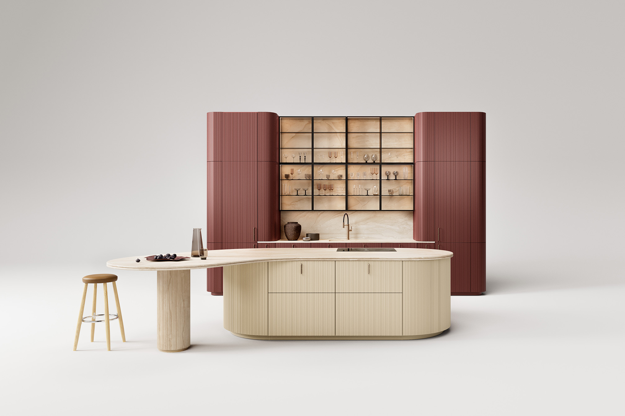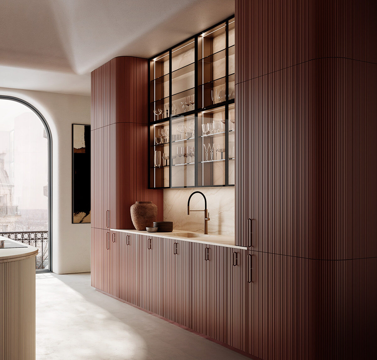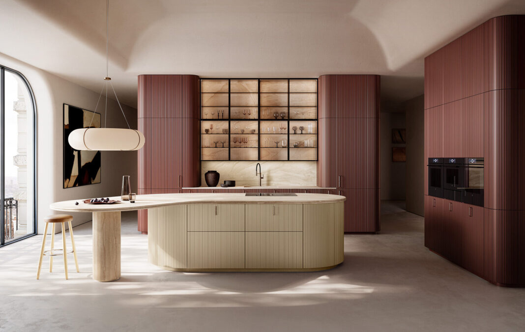 un’immagine continua dell’insieme. La tonalità, ispirata alle cromie stratificate dell’architettura dell’omonima città indiana, dialoga con la luce donando profondità e dinamismo alle superfici. L’isola in Laccato Seta, con piano in marmo Breccia Sarda, crea un contrasto armonioso con la struttura verticale. Il top introduce Palmier, una nuova silhouette di bordo, che amplia il catalogo dei profili già esistenti. Completano la composizione le maniglie Oi by García Cumini in finitura Bronzo.