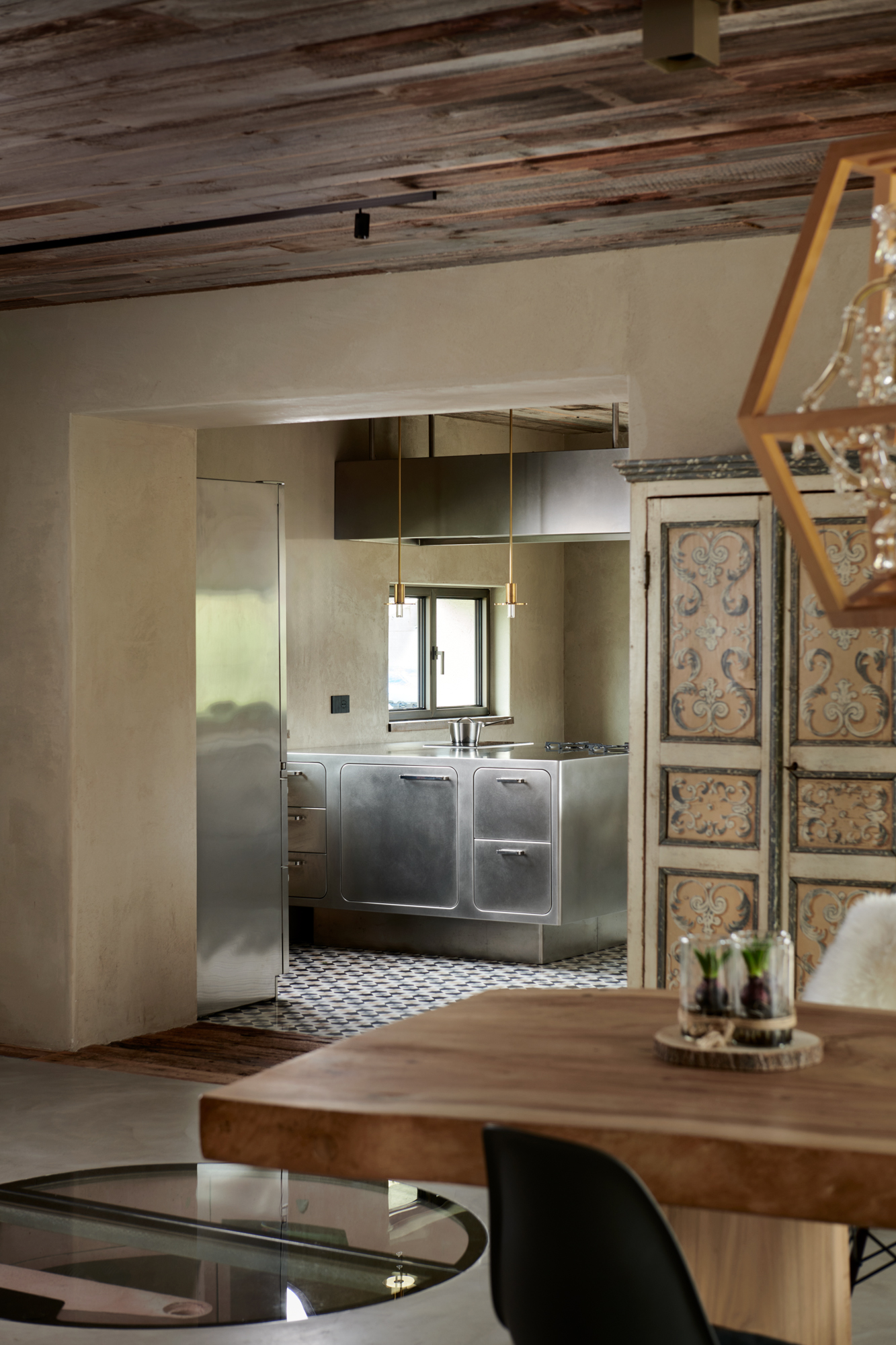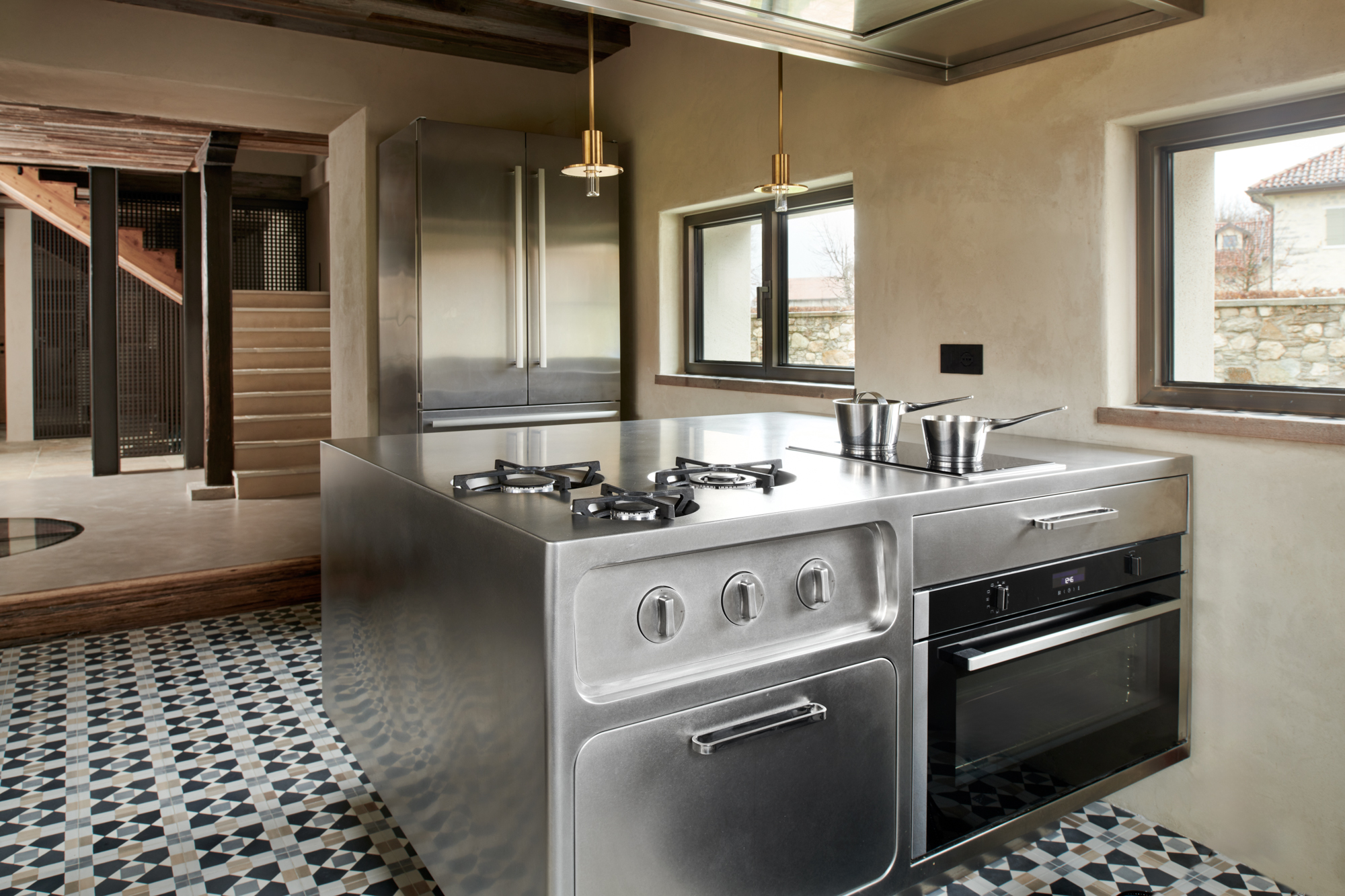 Il recupero architettonico incontra l'ergonomia e la forza dell'acciaio nella cucina di una casa a Belluno, arredata con Ego e Atelier di Abimis