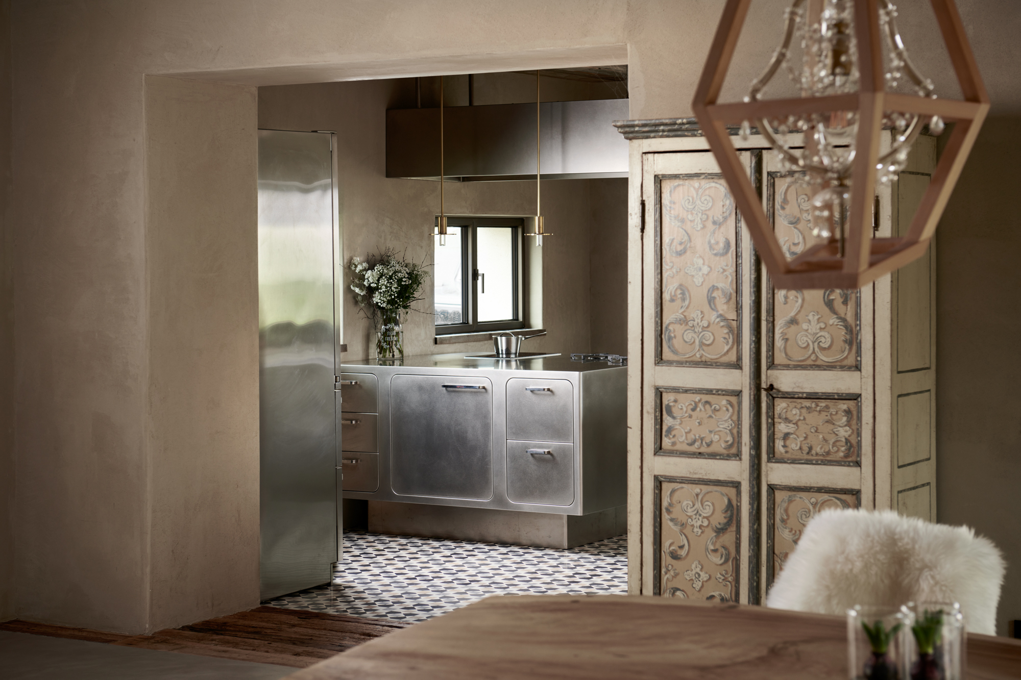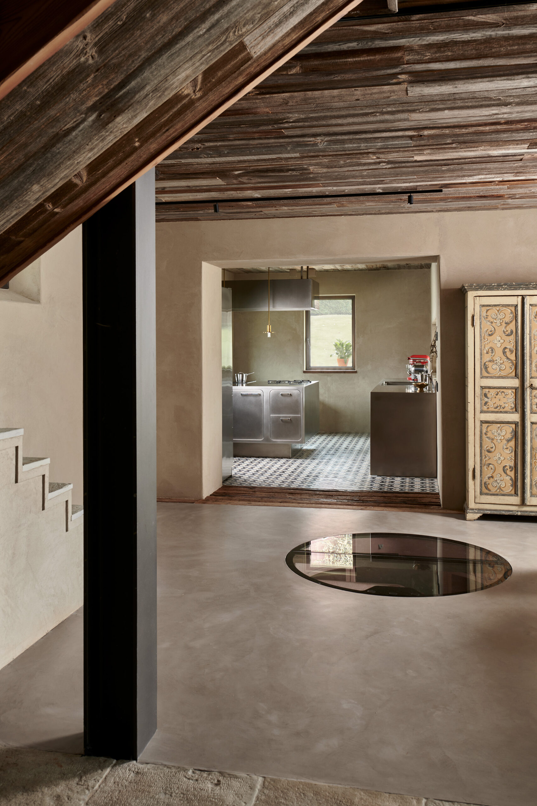 La cucina Abimis agisce come un catalizzatore di luce: la capacità dell'acciaio di riflettere e diffondere la luminosità proveniente dalle grandi vetrate del piano terra crea un contrasto armonico con gli spessi muri in pietra trattati a calce naturale e il cemento chiaro del pavimento. In questo "tacito dialogo" tra passato rurale e modernità, la funzionalità diventa eleganza, trasformando il fulcro della casa in un ambiente conviviale dove l'essenza del design attuale è al totale servizio dell'abitare.