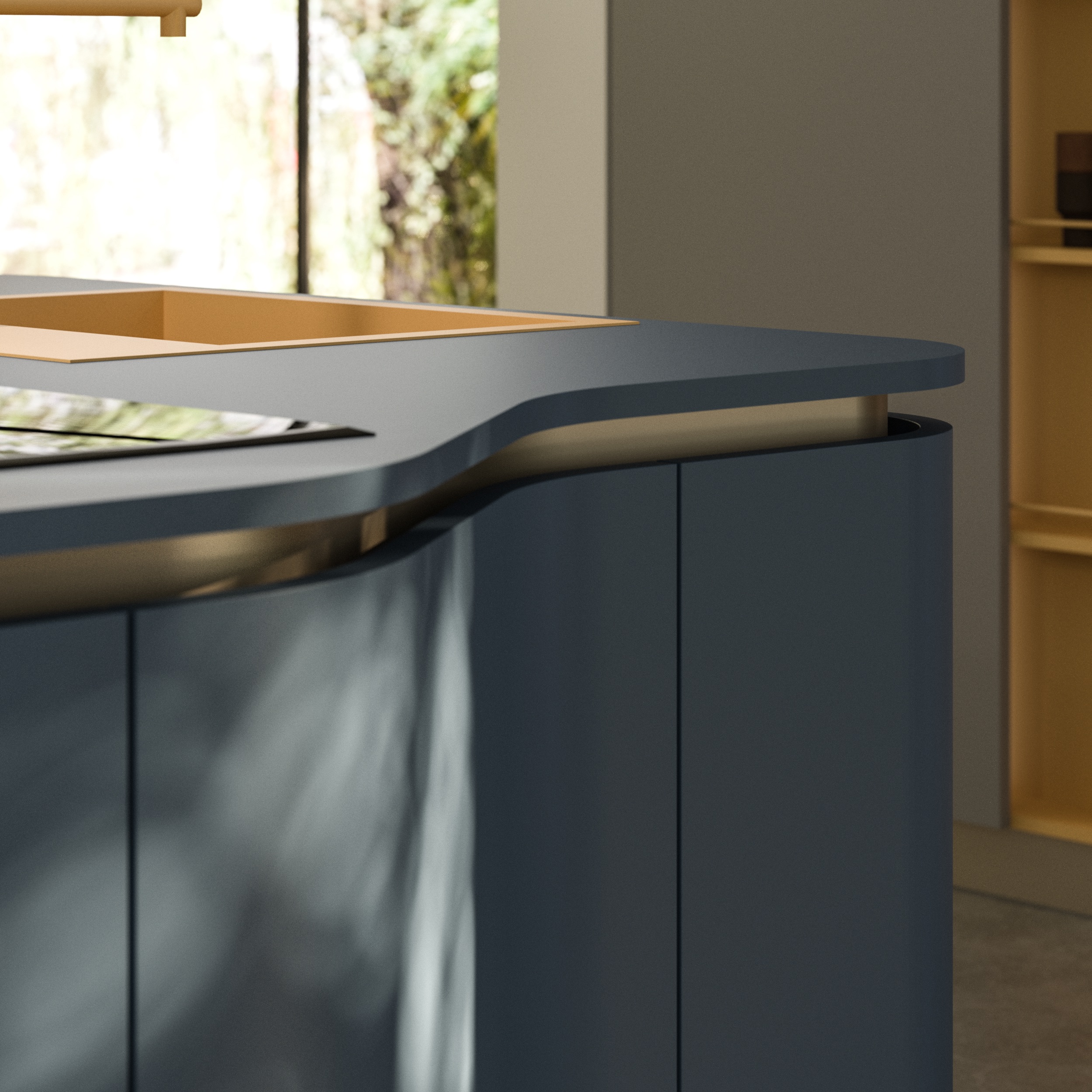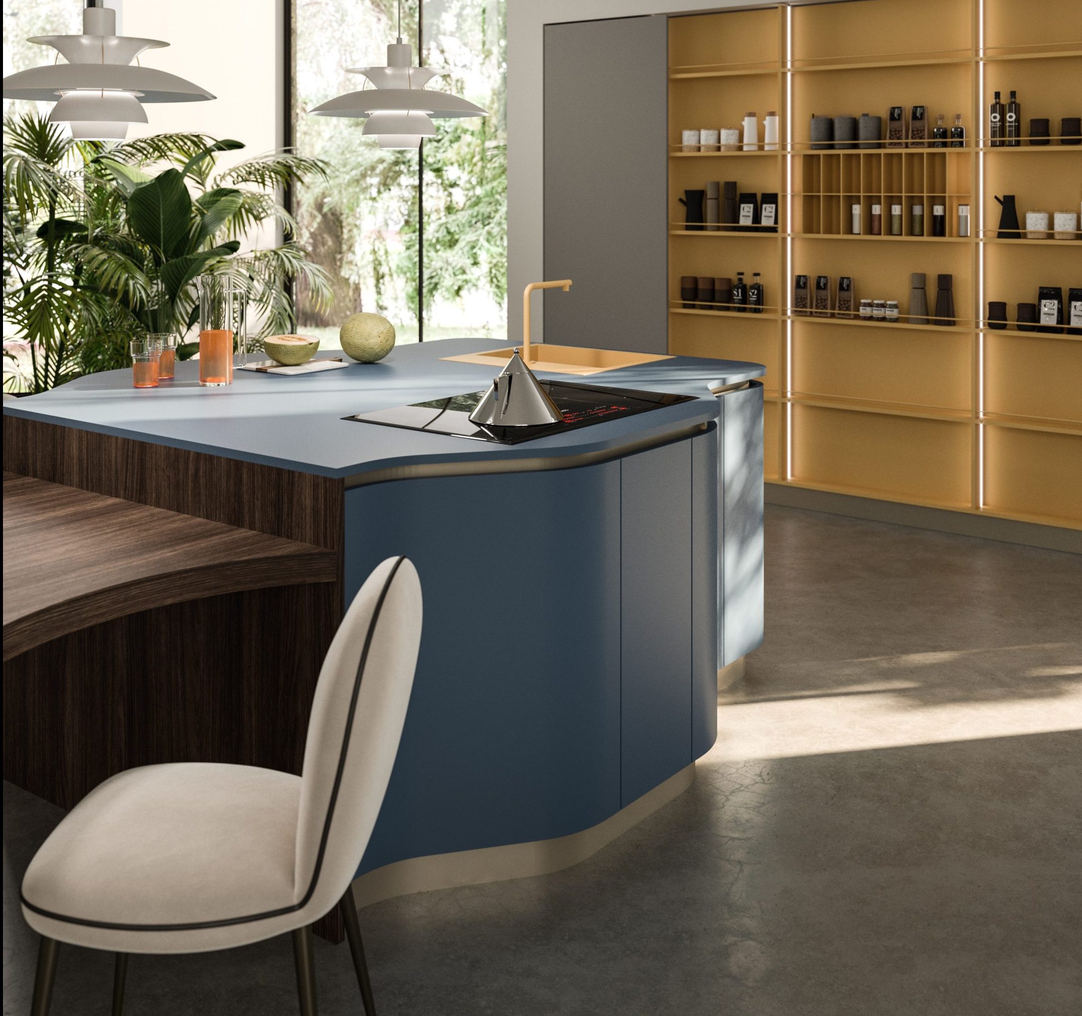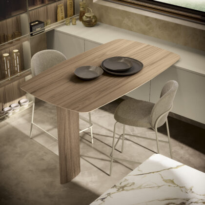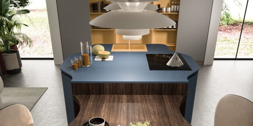 - Ergonomia e inclusività - Nel modello Penelope sono espresse nel design del blocco centrale isola/tavolo e sono il punto di partenza del progetto. L’isola con le basi dalle linee fluide e curve, senza spigoli, consente di muoversi con naturalezza attorno al blocco di lavoro, assecondando i movimenti e favorendo l’interazione. Lavello, piano cottura e superficie di lavoro sull’isola sono collocati correttamenti assecondando le regole dell’ergonomia e ottimizzando quindi i flussi di movimento tra queste tre aree. Il piano lavoro tra lavello e cottura — perpendicolari tra loro — offre la giusta ampiezza per poggiare pentole e ingredienti. Il piano snack ribassato e dalla forma morbida avvicina le persone, favorendo uno scambio spontaneo. Inoltre, le scelte progettuali rendono fluidi i gesti e semplificano le attività di preparazione, pulizia e organizzazione.