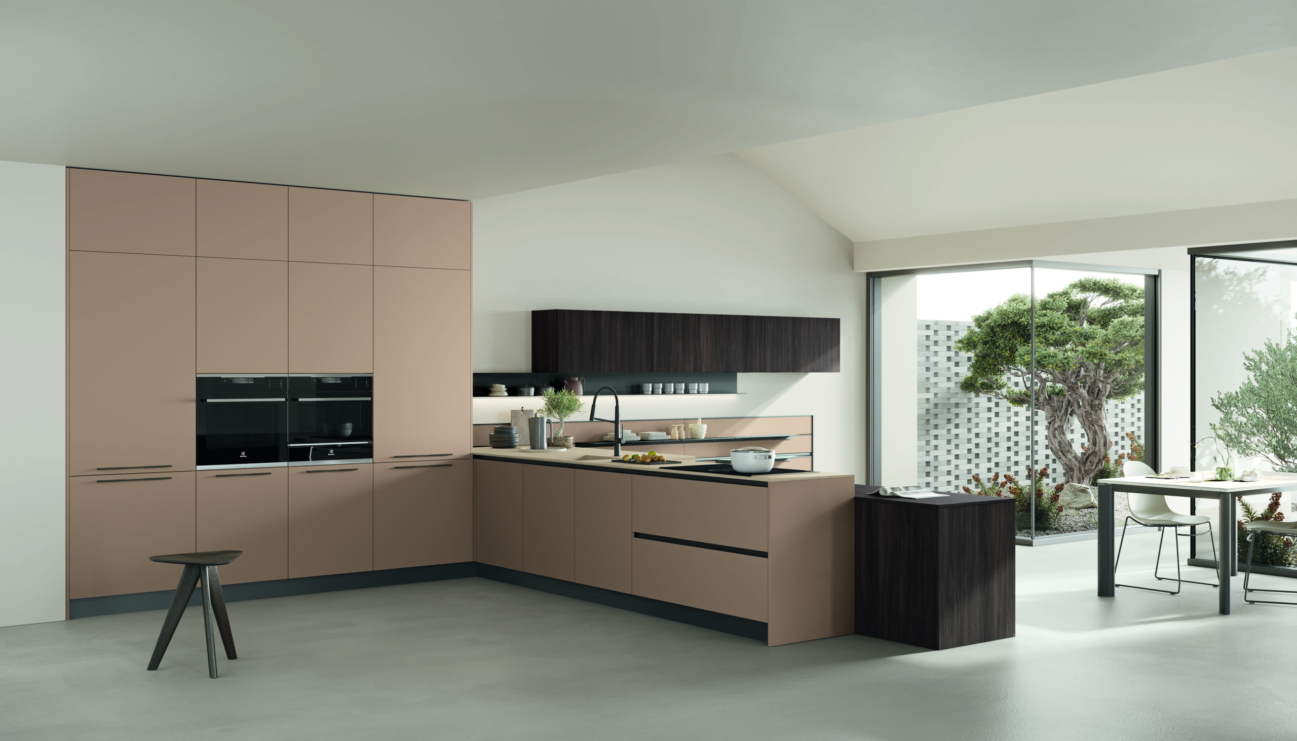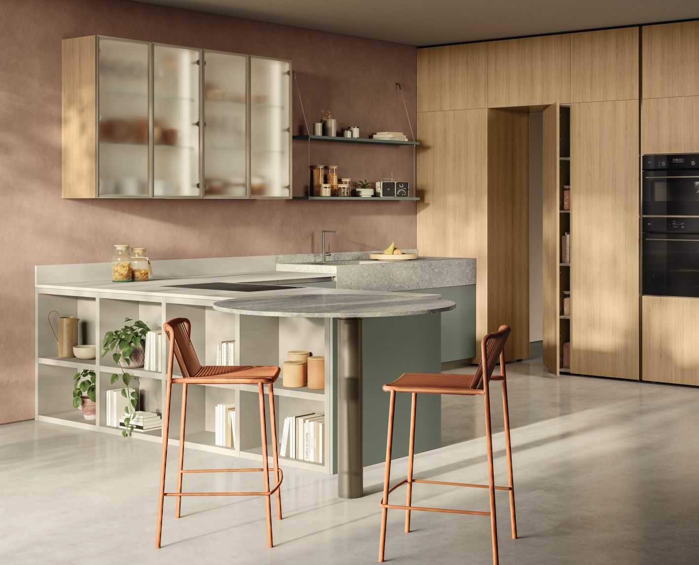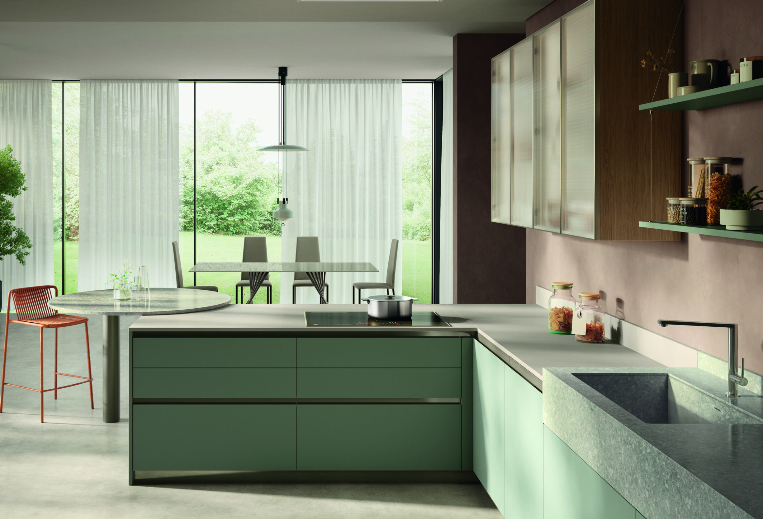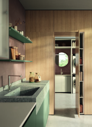 - Inclusività e condivisione - L'annessione dello snack tondo alla zona di preparazione favorisce la condivisione tra chi cucina e i commensali. L'intelligente progetto compositivo sviluppato a L - con penisola dedicata alla cottura - rende la cucina accessibile a tutti, anche in caso di mobilità ridotta, facilitando la preparazione, il servizio e la condivisione. Il modello garantisce poi una lunga durata nel tempo: il gres Perla del piano principale resiste al calore e all’usura quotidiana mantenendo un’estetica impeccabile; la Cosmolite Mint del lavello e del tavolo tondo è resistente nel tempo; legno e vetro di colonne e pensili resistono negli anni.