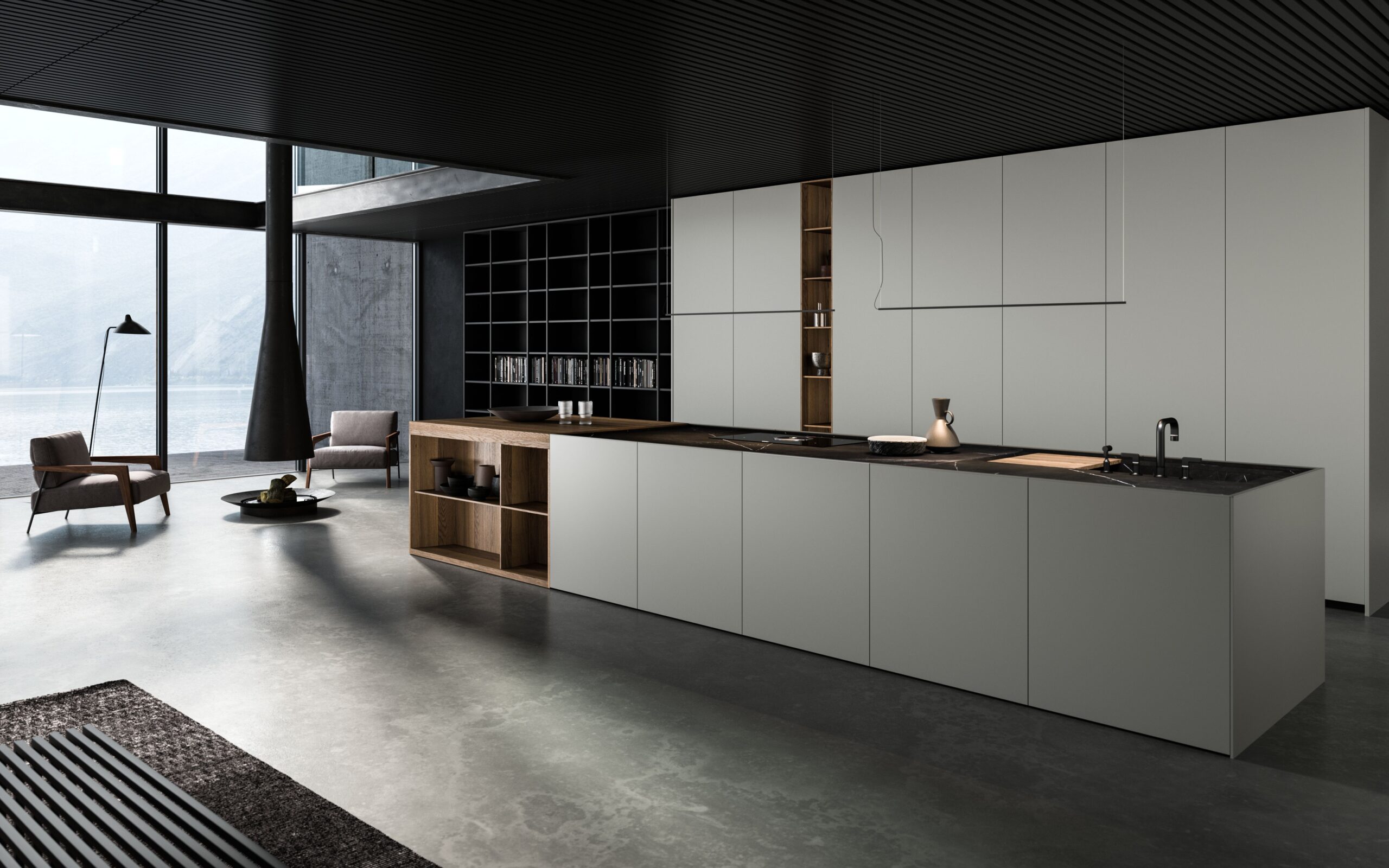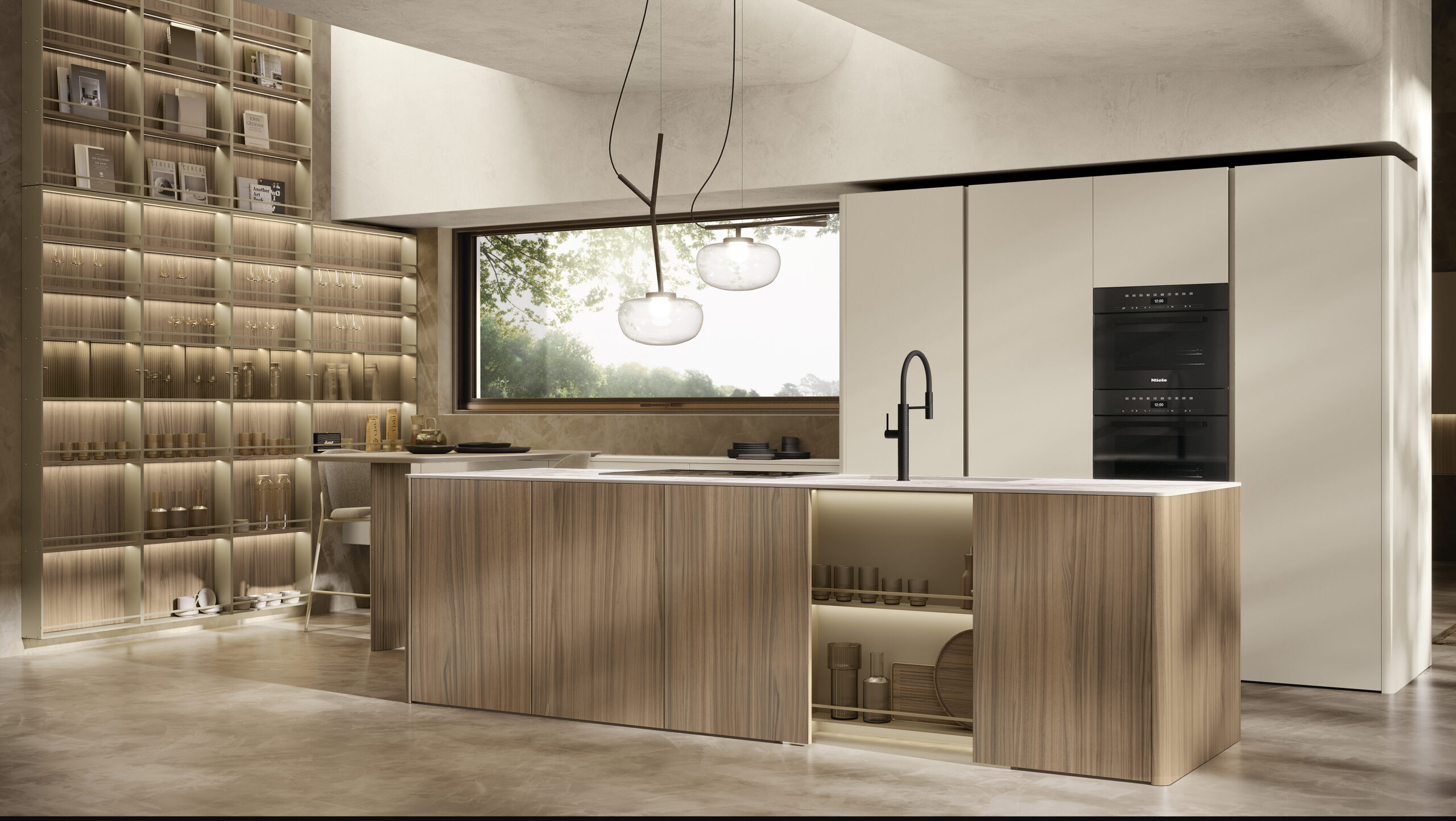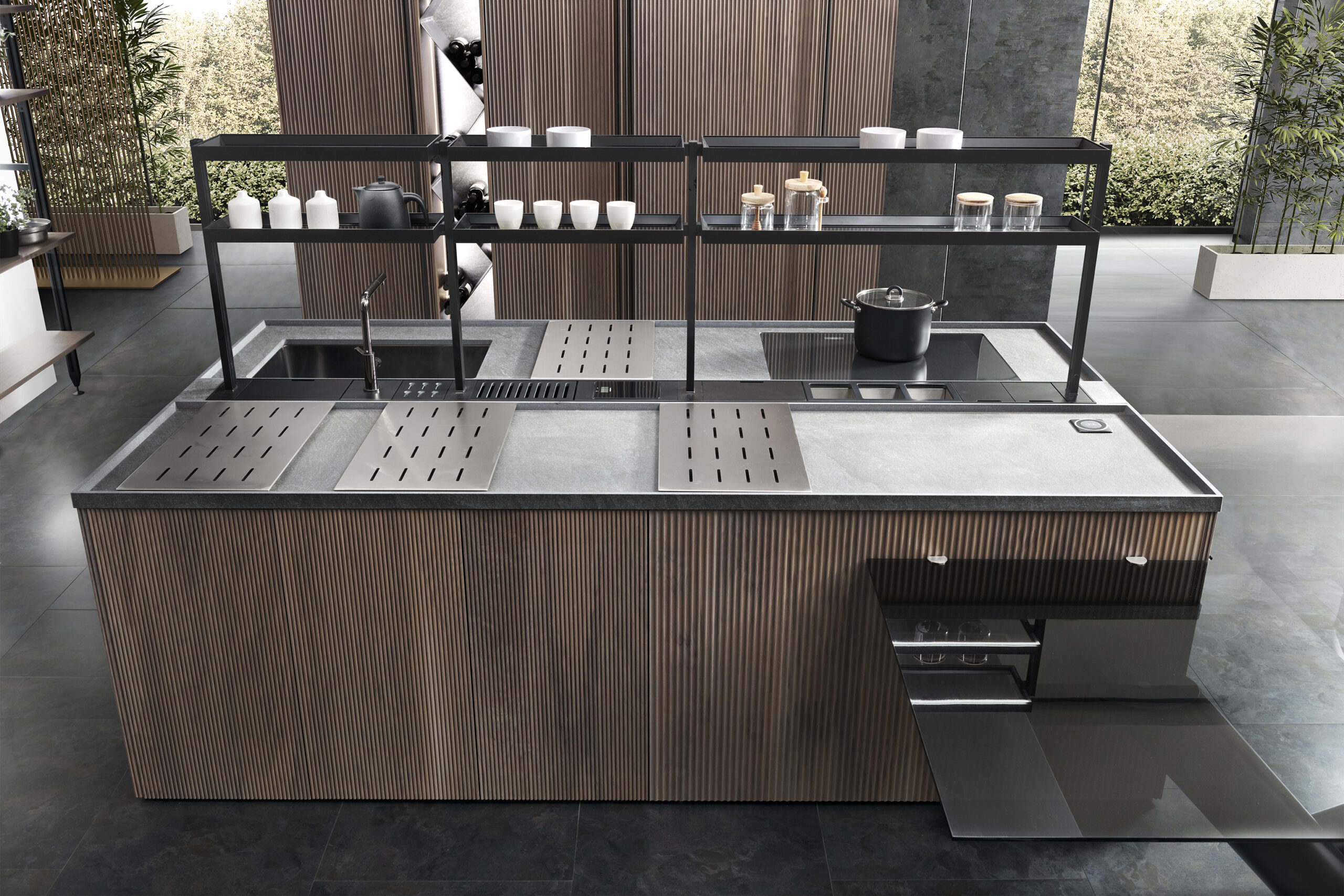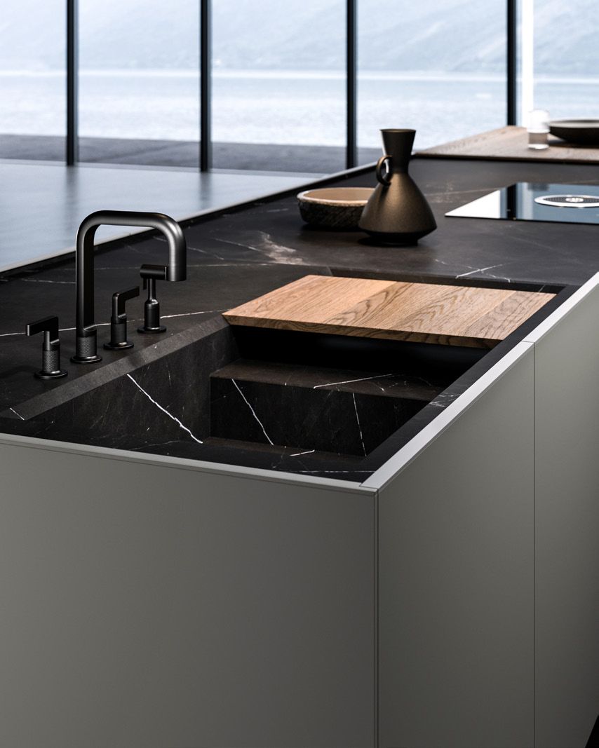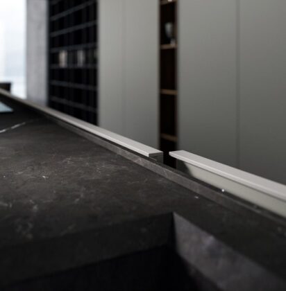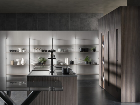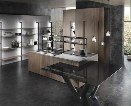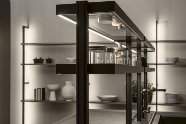 - Ergonomia e facilità d’utilizzo - Nella cucina Milled di Floritelli, la torretta elettrificata motorizzata integrata nel top mette a portata di mano prese e ricarica wireless; la struttura a ponte superiore pone ad altezza occhi mensoline per stoviglie e contenitori; il canale attrezzato a filo top facilita le operazioni di lavaggio e preparazione offrendo a portata di mano scolapiatti e scolaposate di fronte al lavello, e vaschette portautensili e portaspezie di fronte al piano cottura e all’area lavoro, oltre a una bilancia integrata; il piano in pietra con bordo salvagoccia è dotato di vassoi scorrevoli.