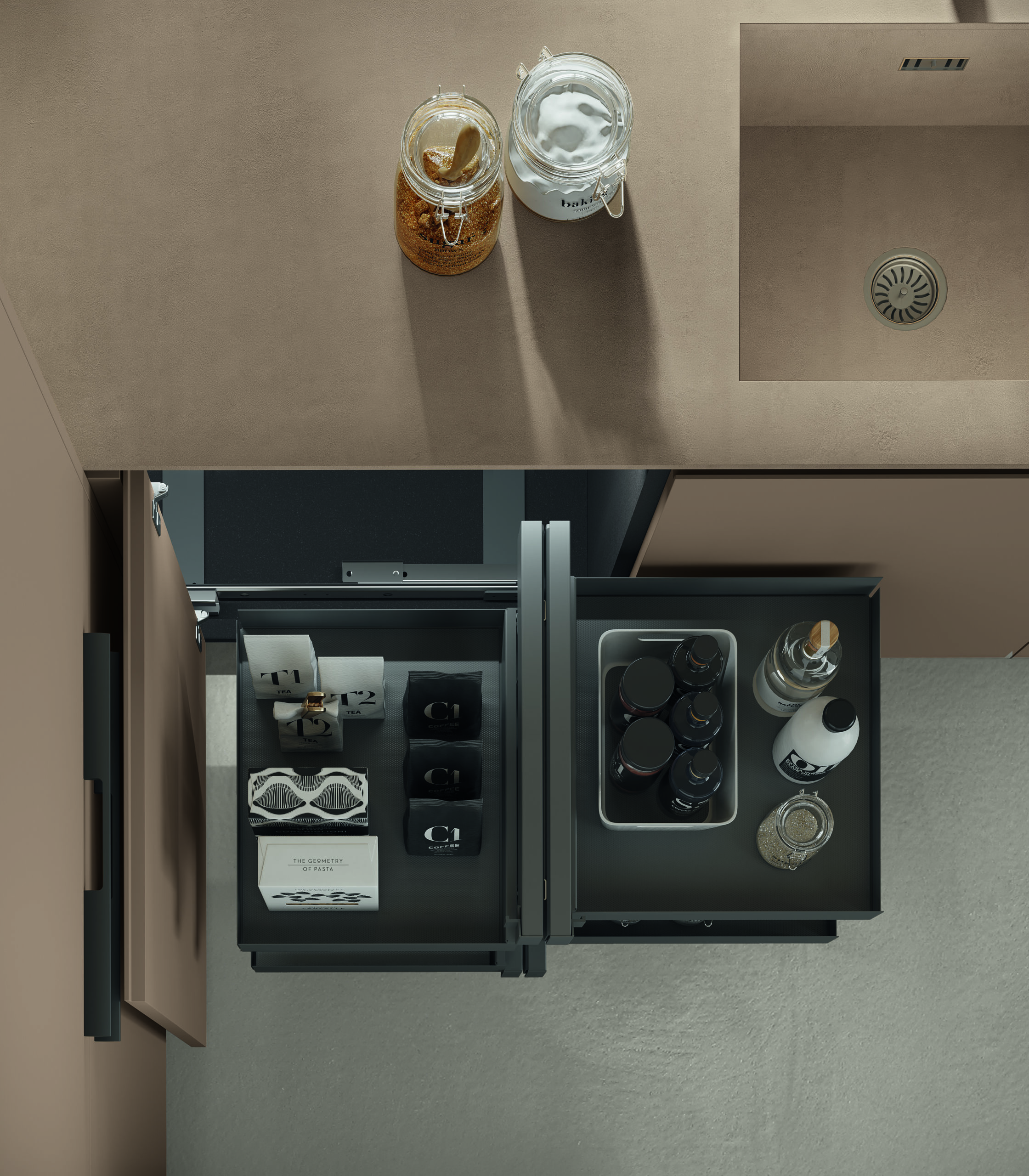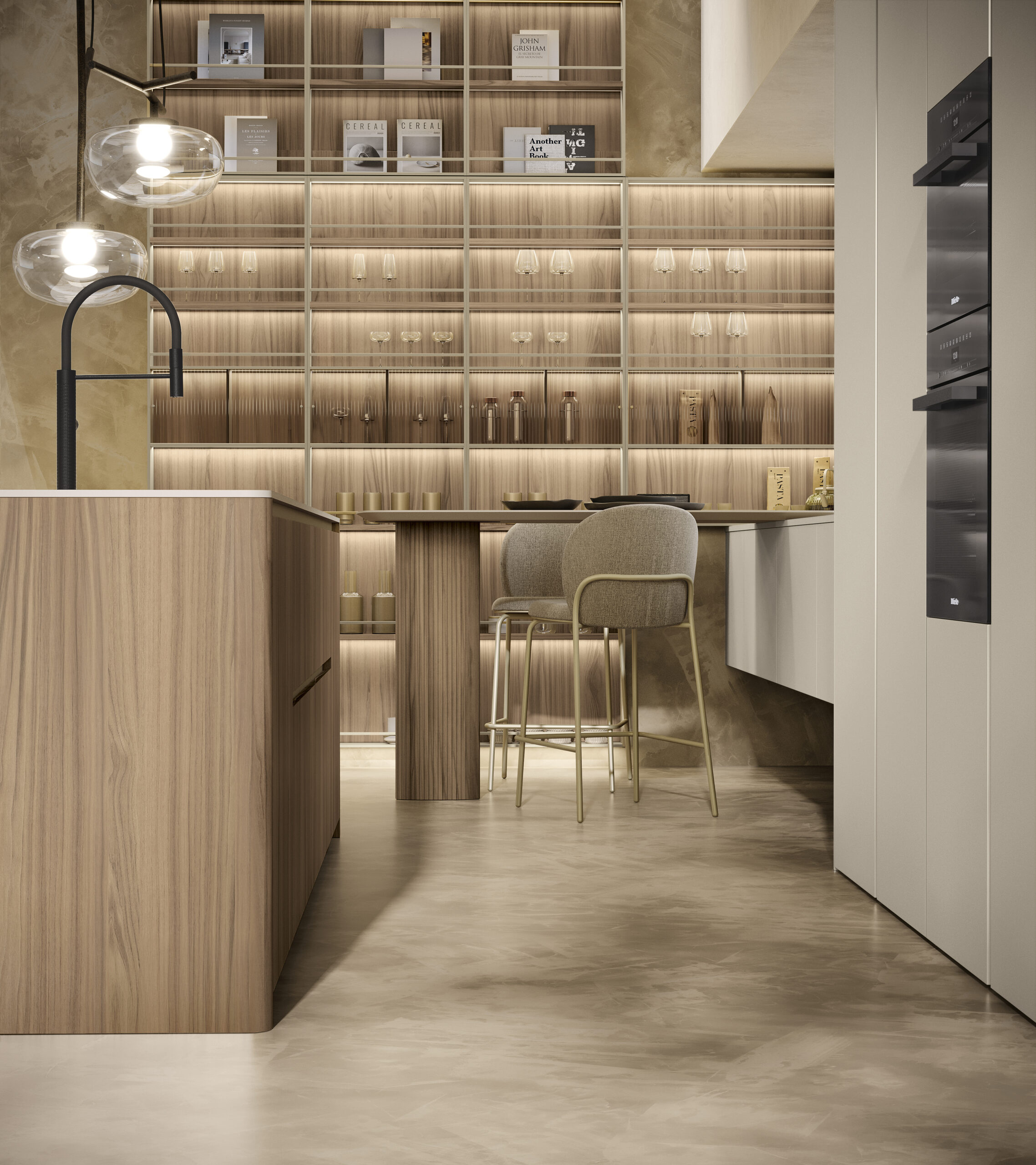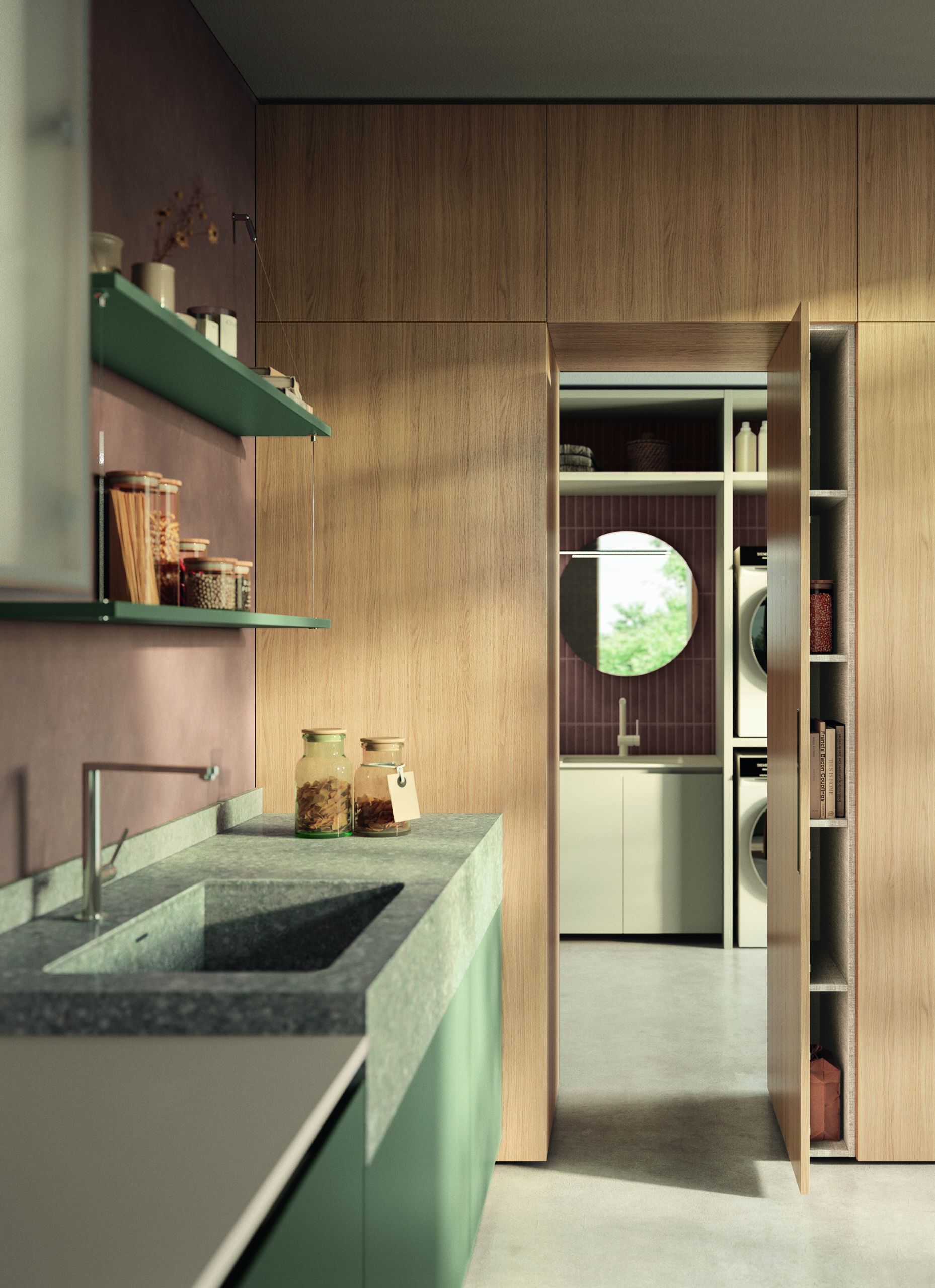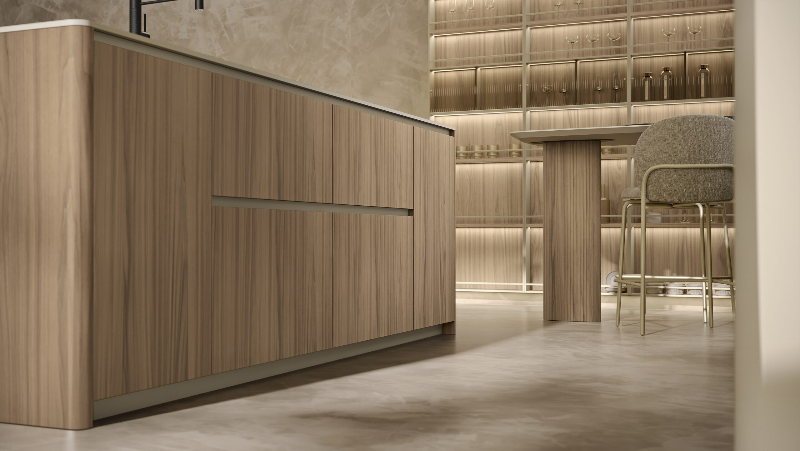 - Ergonomia e facilità d’utilizzo - Nella cucina Milled di Floritelli, la torretta elettrificata motorizzata integrata nel top mette a portata di mano prese e ricarica wireless; la struttura a ponte superiore pone ad altezza occhi mensoline per stoviglie e contenitori; il canale attrezzato a filo top facilita le operazioni di lavaggio e preparazione offrendo a portata di mano scolapiatti e scolaposate di fronte al lavello, e vaschette portautensili e portaspezie di fronte al piano cottura e all’area lavoro, oltre a una bilancia integrata; il piano in pietra con bordo salvagoccia è dotato di vassoi scorrevoli.
