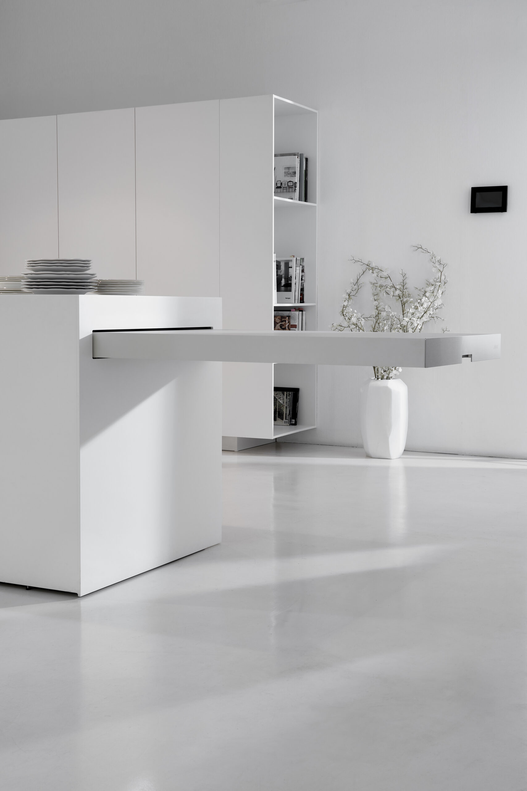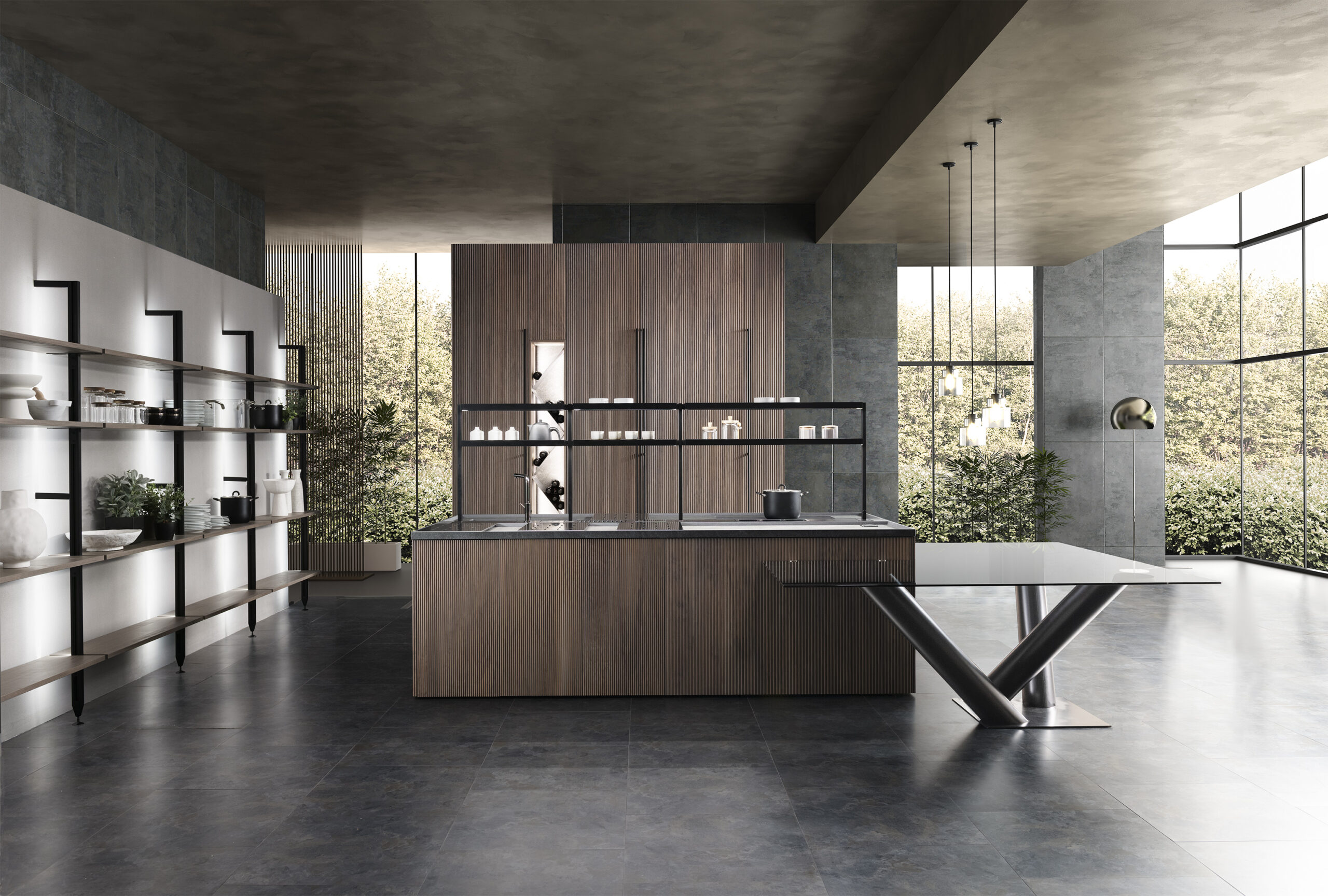 - Inclusività - Il tavolo in vetro a sbalzo dall'isola è completamente accessibile per chiunque e da tutti i lati; pone in stretta relazione cuoco e commensali.