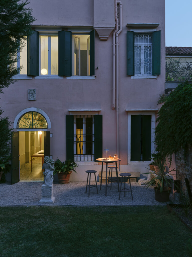 Concealed from view, as is often the case in Venetian gardens, the outdoor space at Casa Della Sensa reveals itself as a charming and unexpected retreat. Here, Still tables, similar to those in the entrance hall, are presented in a refined copper finish and matched with Hug stools in the same shade, creating a cohesive and welcoming ensemble. The garden also features a Frame Kitchen Outdoor, an open-air operational hub that interacts with a tall Hug table and matching stools in Pink Clay shade.