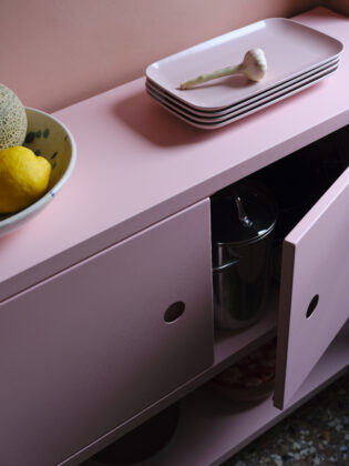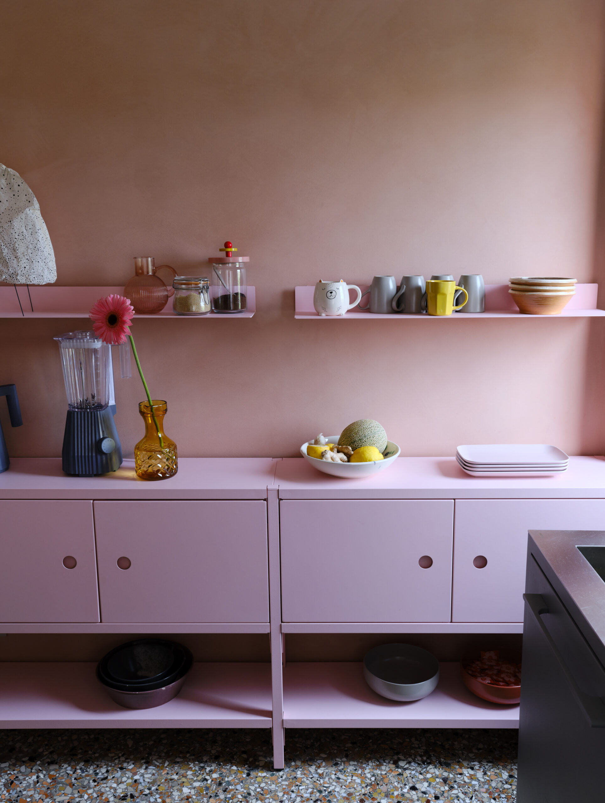 Among the most significant features, the Frame family designed by Salvatore Indriolo plays a central role. The tables, present in different rooms, are versatile elements that naturally adapt to the rhythm of the home. The Frame Kitchen, essential and graphic, becomes the operational heart of the home, defining a practical but also visually coherent space. In the entrance hall, two Still tables, designed by Sandro Fantin and presented in the Copper colour, become, whenever necessary, light and compact consoles or convivial tables to welcome all guests, elegantly interpreting the idea of an open, flexible and shared home. The Uno shelf, Dorino Fantin's historic hook shelving system, gives its industrial soul a domestic twist: in bedrooms it becomes a wardrobe, in kitchens it becomes a pantry or a sideboard, while in its Uno Living version it becomes a bookcase, always boasting its simple and sturdy structure, designed to last and adapt.