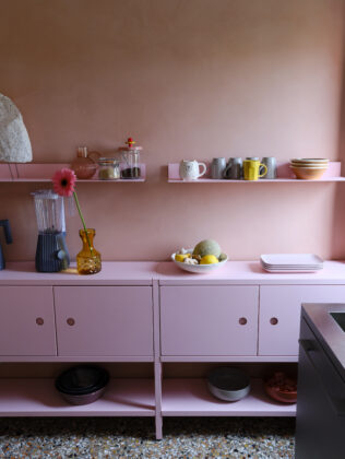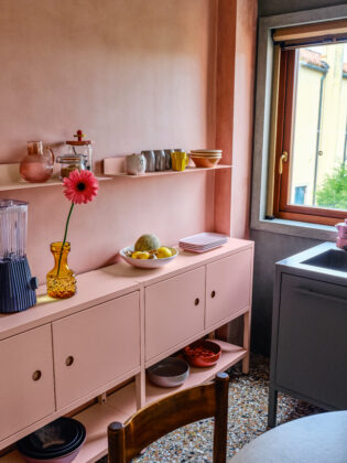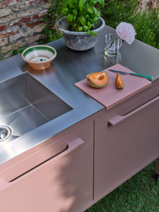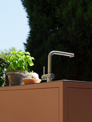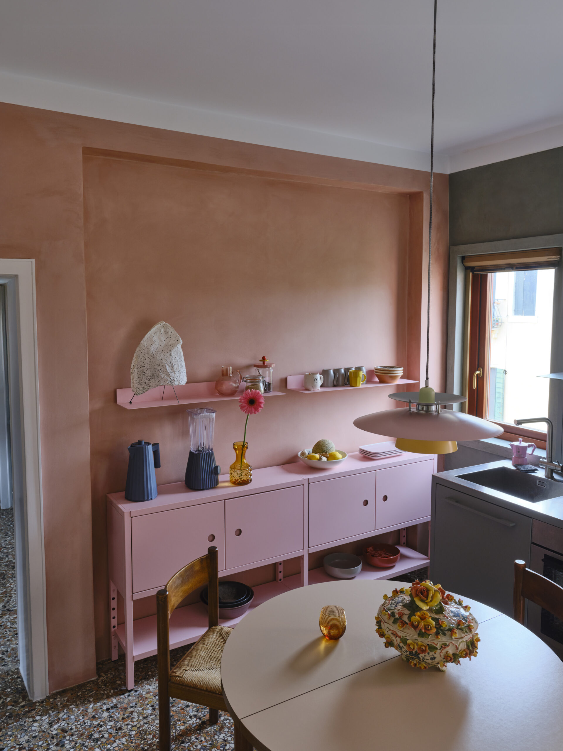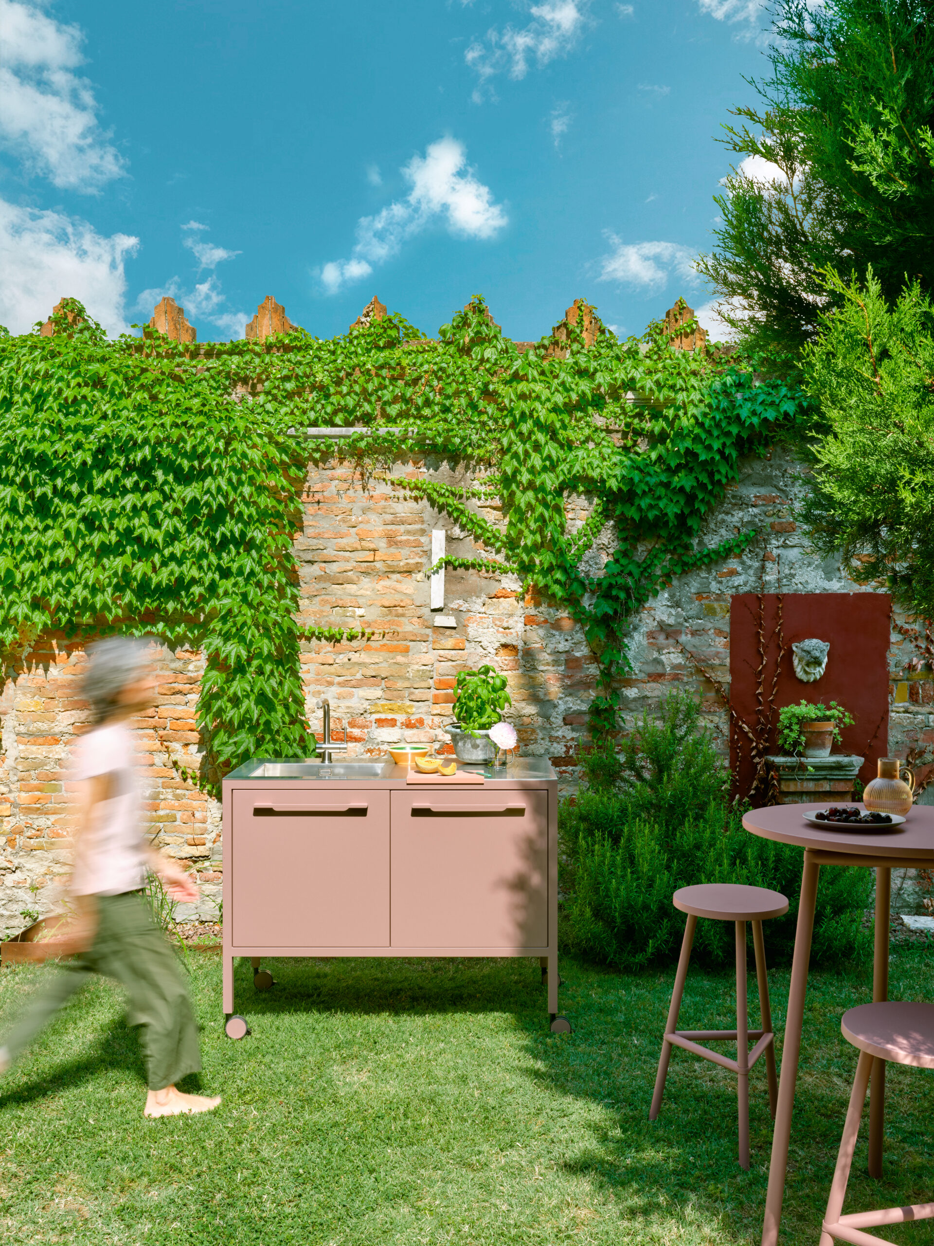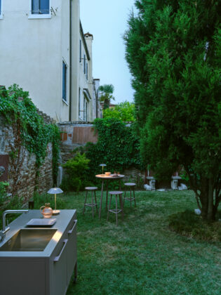 Concealed from view, as is often the case in Venetian gardens, the outdoor space at Casa Della Sensa reveals itself as a charming and unexpected retreat. Here, Still tables, similar to those in the entrance hall, are presented in a refined copper finish and matched with Hug stools in the same shade, creating a cohesive and welcoming ensemble. The garden also features a Frame Kitchen Outdoor, an open-air operational hub that interacts with a tall Hug table and matching stools in Pink Clay shade.