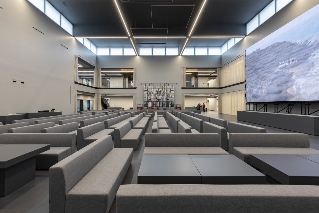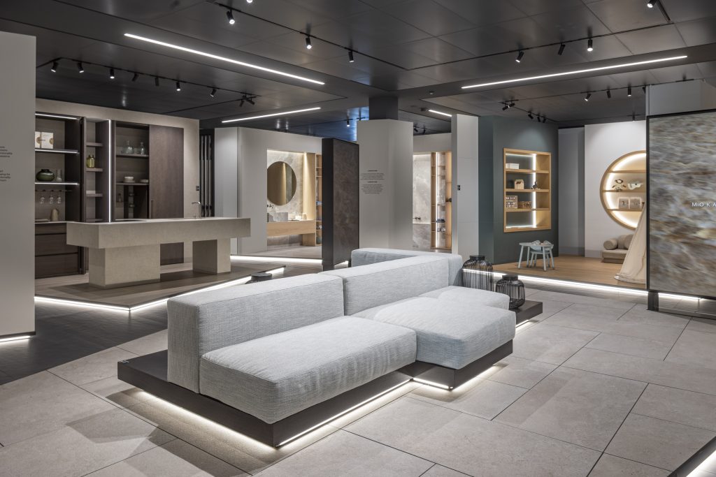 Aperta nel 2013, la struttura si sviluppa su due livelli e ha un fulcro centrale, aperto a doppia altezza, destinato a grandi eventi, il piano superiore è invece dedicato all’esposizione dei prodotti. Alla fine del 2024 è stato avviato un intervento di ristrutturazione per ridefinirne il concept espositivo e valorizzare l’esperienza degli ospiti. Il piano terra mantiene la sua funzione di spazio per eventi e ospitalità aperti al territorio, riproposta in un’atmosfera più elegante e raffinata. “Il primo piano – spiega Nunziati -è stato oggetto di un competo restyling, questo perché il mondo delle superfici ceramiche negli ultimi anni è completamente cambiato: sono cambiate le dimensioni, con lastre di oltre 3 metri, gli spessori, da 3 a 20 mm, e sono evolute le tecnologie a disposizione per la resa estetica e tecnica dei prodotti. Abbiamo pensato quindi che dovesse cambiare anche il modo di esporli per comunicare in modo più efficace con gli architetti, gli interior designer, il settore immobiliare e le aziende dell’arredo che sono i nuovi utilizzatori di questo materiale. Per questo abbiamo voluto creare un’esperienza immersiva pensata per raccontare tutte le potenzialità progettuali della materia ceramica che incontra nuove destinazioni d’uso, tra cui cucine, armadi, SPA, piatti doccia, outdoor, nautica e tante altre”.