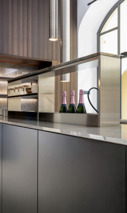 Il tavolo Snack Moon si integra perfettamente con le curve morbide della struttura. L’estetica, caratterizzata da linee organiche e sinuose, si estende ai terminali e alle ante, dove i materiali pregiati (legno, metallo liquido, acciaio e quarzite naturale) si uniscono a soluzioni tecnologiche intelligenti come il sistema Lift, completamente personalizzabile.