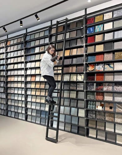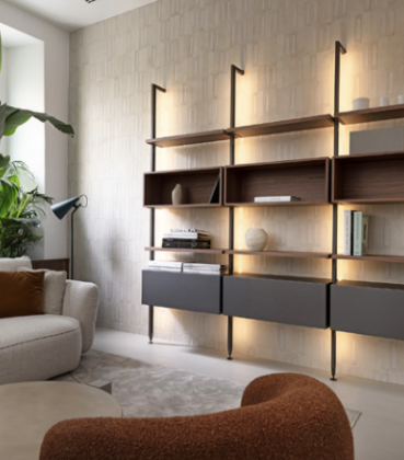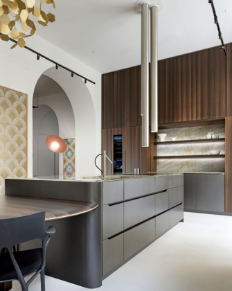 Lo showroom è stato concepito come il contesto ideale per accogliere la filosofia di Floritelli, dove cucina e living si fondono in un sistema integrato e total look dal design raffinato, funzionale e altamente tecnologico. Grande protagonista dello spazio è il progetto C_34, celebrativo dei 75 anni di Floritelli Cucine, che interpreta in chiave evoluta la cucina come spazio fluido, dinamico e accogliente. Le linee con taglio a 34°, da cui il sistema prende il nome, si ritrovano nel piano, donando una sensazione di spessore minimale, leggerezza visiva e precisione formale.