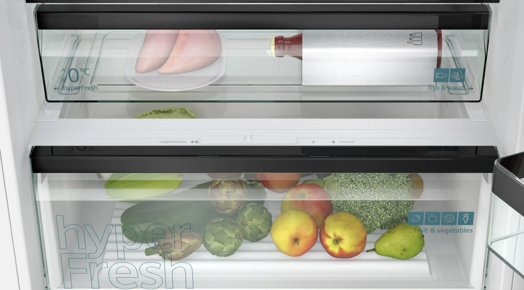 C’è davvero spazio per tutto: è possibile fare scorte senza pensieri e mantenere gli alimenti freschi più a lungo. Il sistema hyperFresh <0°C> include un ampio cassetto dedicato a frutta e verdura e un secondo cassetto con temperatura più bassa, ideale per preservare al meglio carne e pesce. Grazie alla tecnologia No Frost, il congelatore non richiede più sbrinamento. Gli alimenti vengono conservati nelle migliori condizioni possibili e l’elettrodomestico mantiene sempre la massima efficienza energetica.