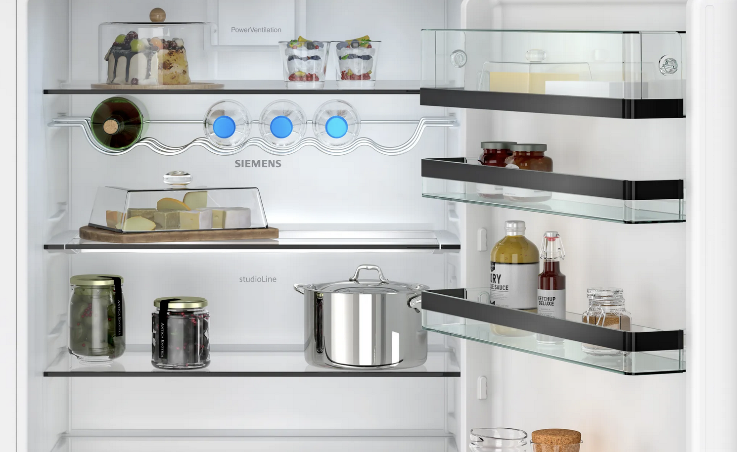 Il frigorifero combinato da incasso extra large Siemens studioLine offre il 45%* di spazio in più, permettendo così di conservare tutto ciò che serve. Ogni alimento trova facilmente il suo posto: da una teglia da forno a un’anguria intera. Gli interni completamente regolabili permettono inoltre di riporre bottiglie di diverse dimensioni, adattandosi a ogni esigenza.