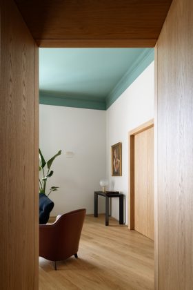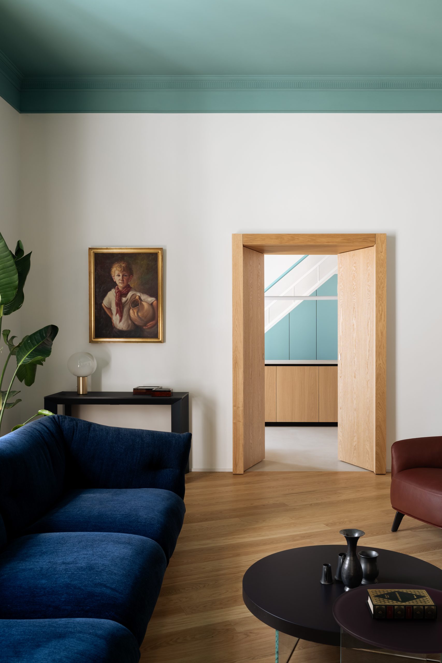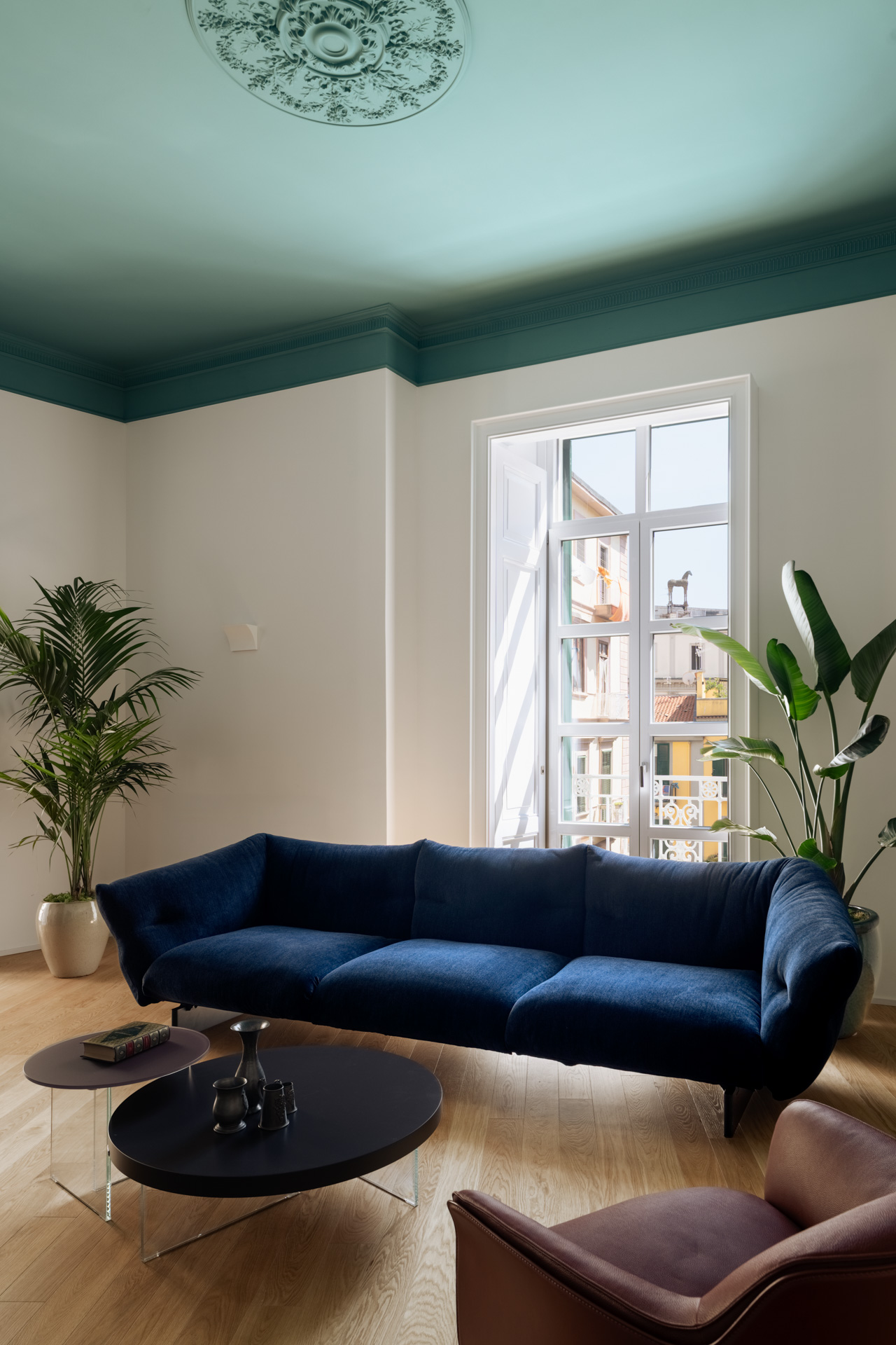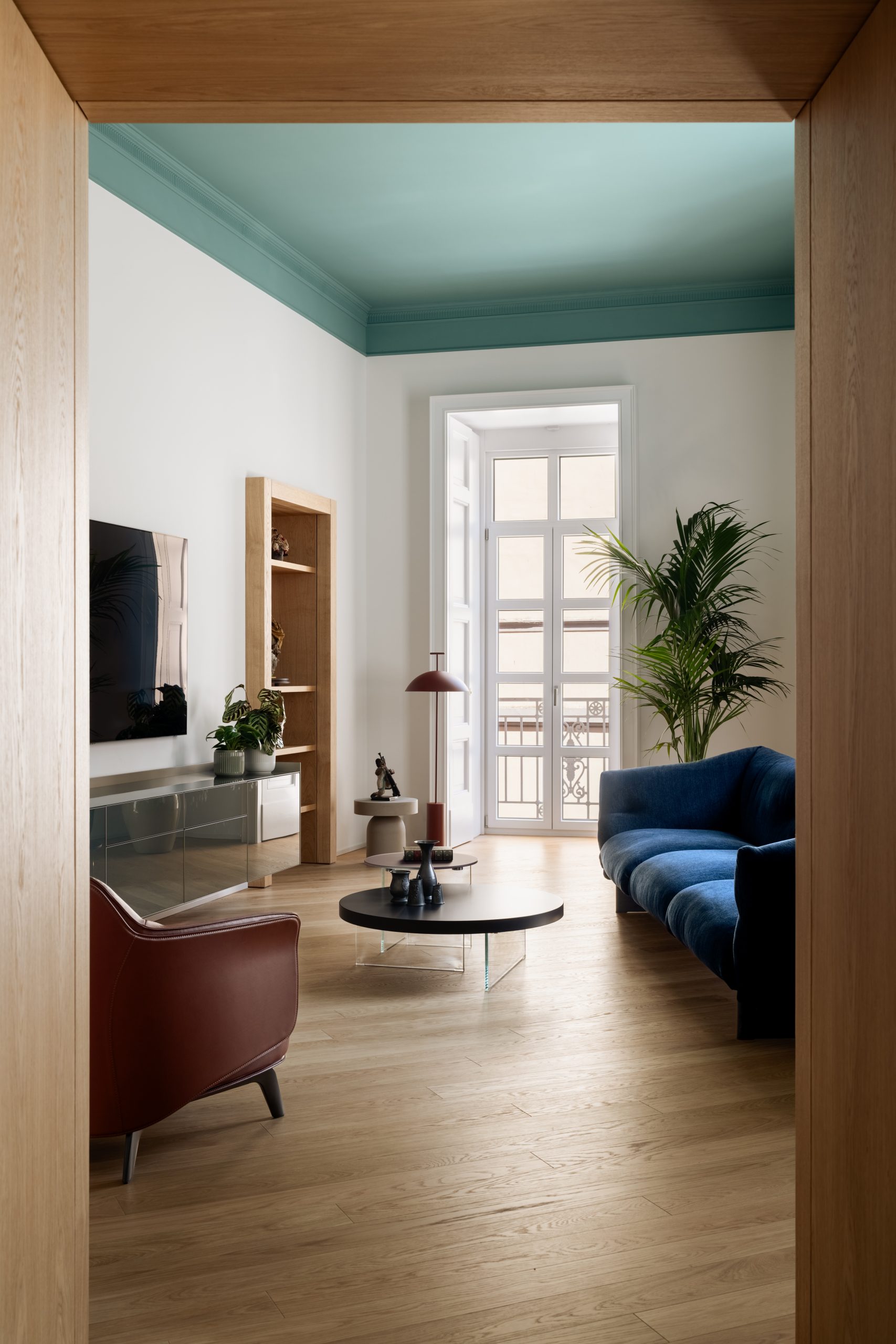 "La palette cromatica rappresenta il cuore poetico del progetto: il verde mare richiama la luce mediterranea e il paesaggio napoletano, mentre le tonalità blu e rovere dialogano con essa in un contrappunto equilibrato. Le nuance sono state scelte per accentuare il senso di profondità e continuità tra i diversi ambienti, aggiungendo al racconto domestico una dimensione emotiva e identitaria".