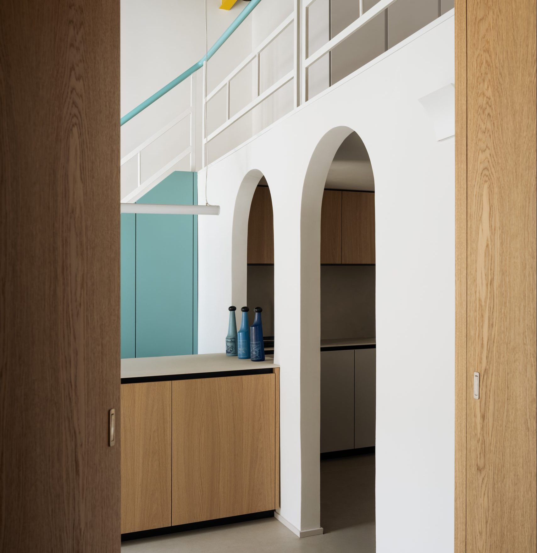 La wet kitchen nascosta sotto le arcate del soppalco e il varco da cui si scorge il living