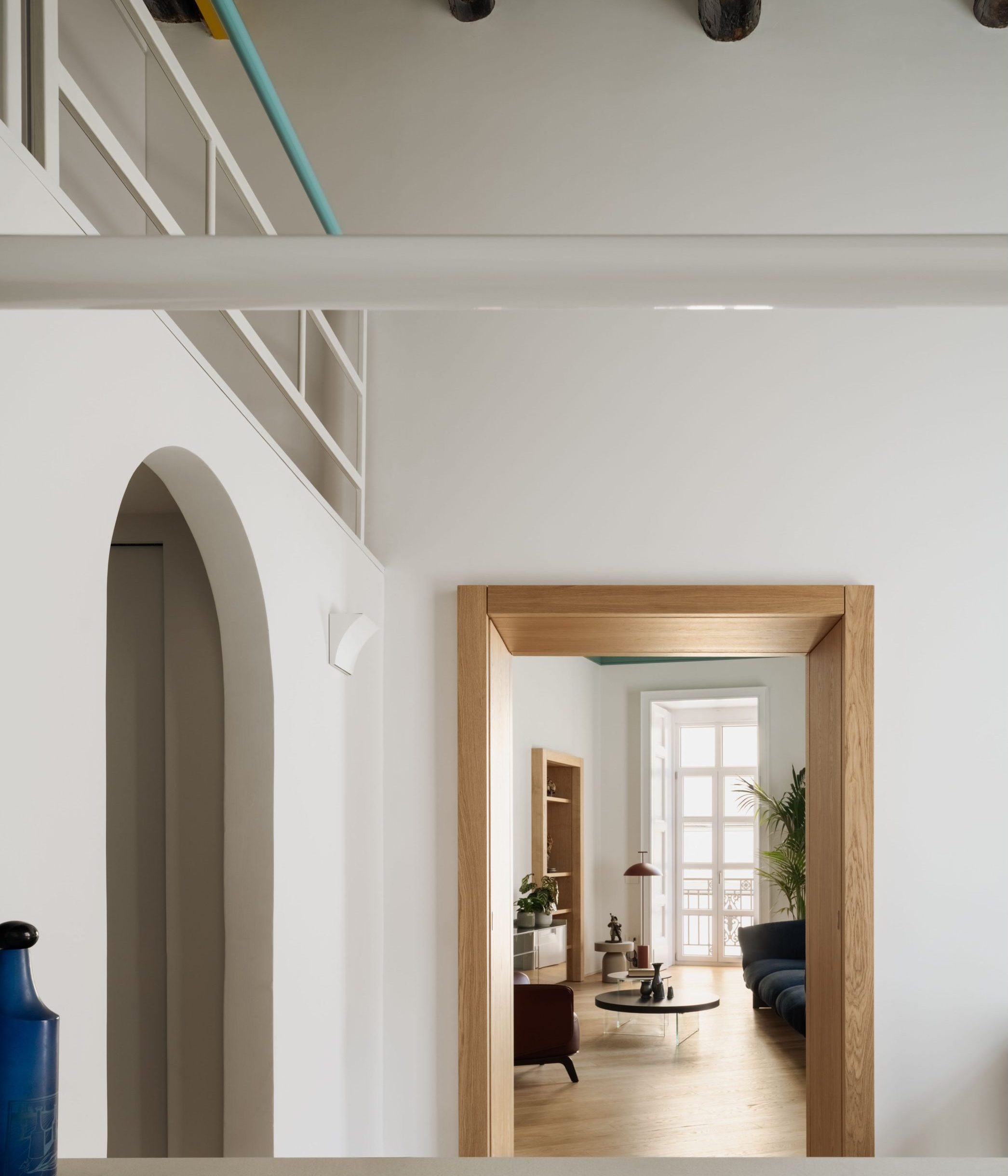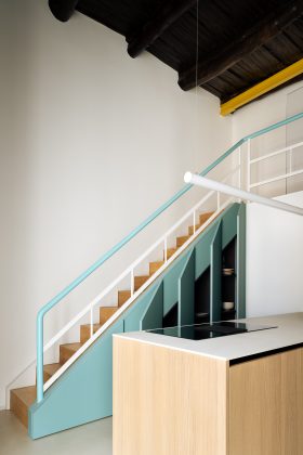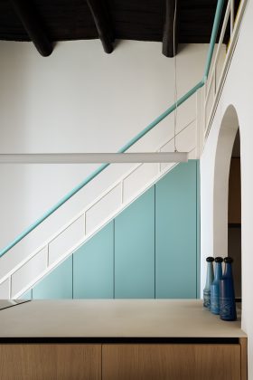 "La scala, con la sua doppia funzione contenitiva e scenografica, diventa fulcro visivo e funzionale e un dispositivo architettonico che unisce piuttosto che dividere: scandisce lo spazio, ma ne preserva la percezione unitaria. In questo modo si configura un ambiente unico e permeabile, dove cucinare, lavorare o accogliere si fondono naturalmente nella quotidianità domestica".