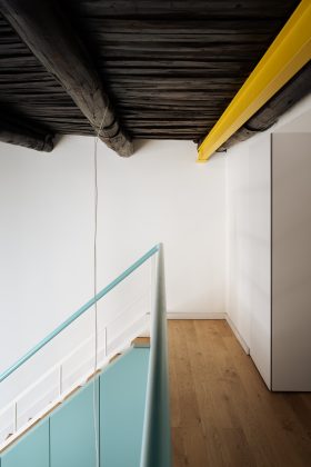 L'attenzione del progetto si focalizza sullo spazio più vistoso e scenico: l'ambiente della cucina-pranzo a doppia altezza. Qui la scala con armadio integrato verde acqua conduce al livello superiore che si affaccia con una balconata sul grande ambiente, caratterizzato dalle magnifiche e antiche travi in legno del soffitto spiovente. "Il concept di quest'area della casa si basa su un’idea di habitat fluido che si concretizza in una continuità spaziale fatta di leggerezza, luce e materia. La cucina non è concepita come un volume indipendente, ma come parte del soggiorno: i due ambienti dialogano grazie a una palette coerente di materiali e colori, dove il legno di rovere e le tonalità di verde creano un filo visivo comune".