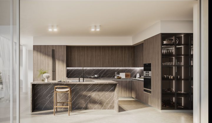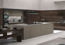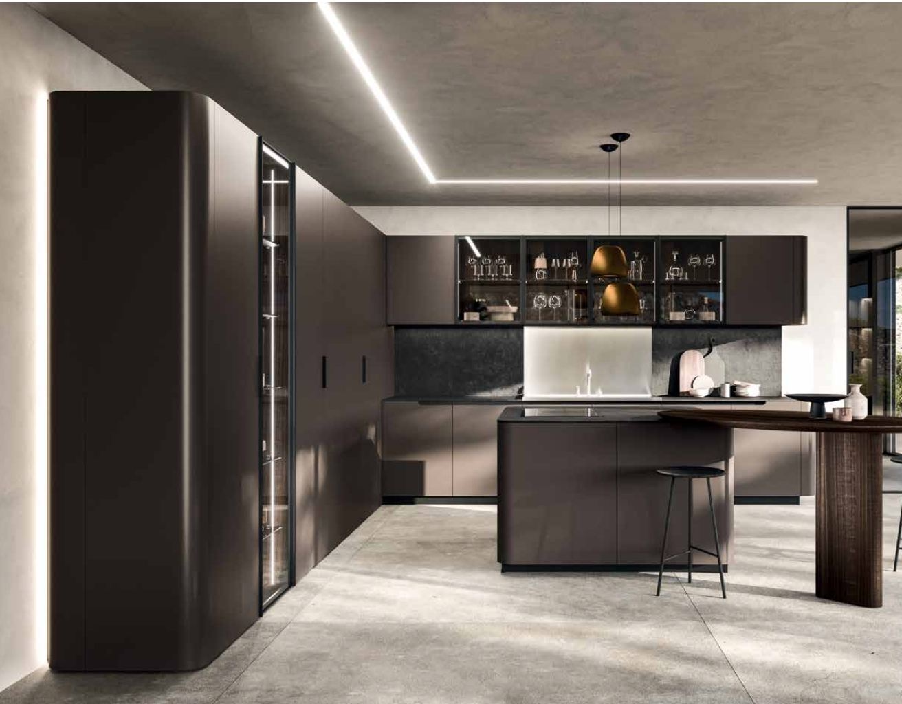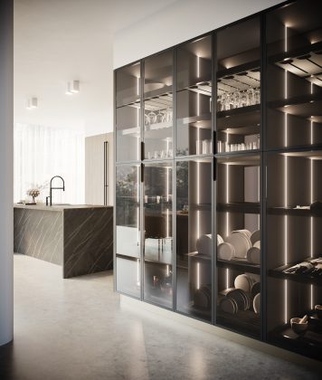 Colonne pensate come un volume in cristallo trasparente bronzato, che prende vita grazie a una doppia linea di strisce di luce Led integrate in ogni fiancata interna. È la soluzione d’effetto che denota il Progetto 3 di firmato Doimo Cucine e creato con All-arounD, e si connota per il telaio in vetro nero delle ante e per lo schienale in metacrilato Argento Plus. Lo studio delle luce prosegue con i led integrati sotto ai pensili, che facilitano le operazioni di lavoro al piano e che enfatizzano l’HPL Dark Pulpis effetto pietra, adottato anche per l’isola. Basi, pensili e colonne sono in Synchroface olmo Grigio.