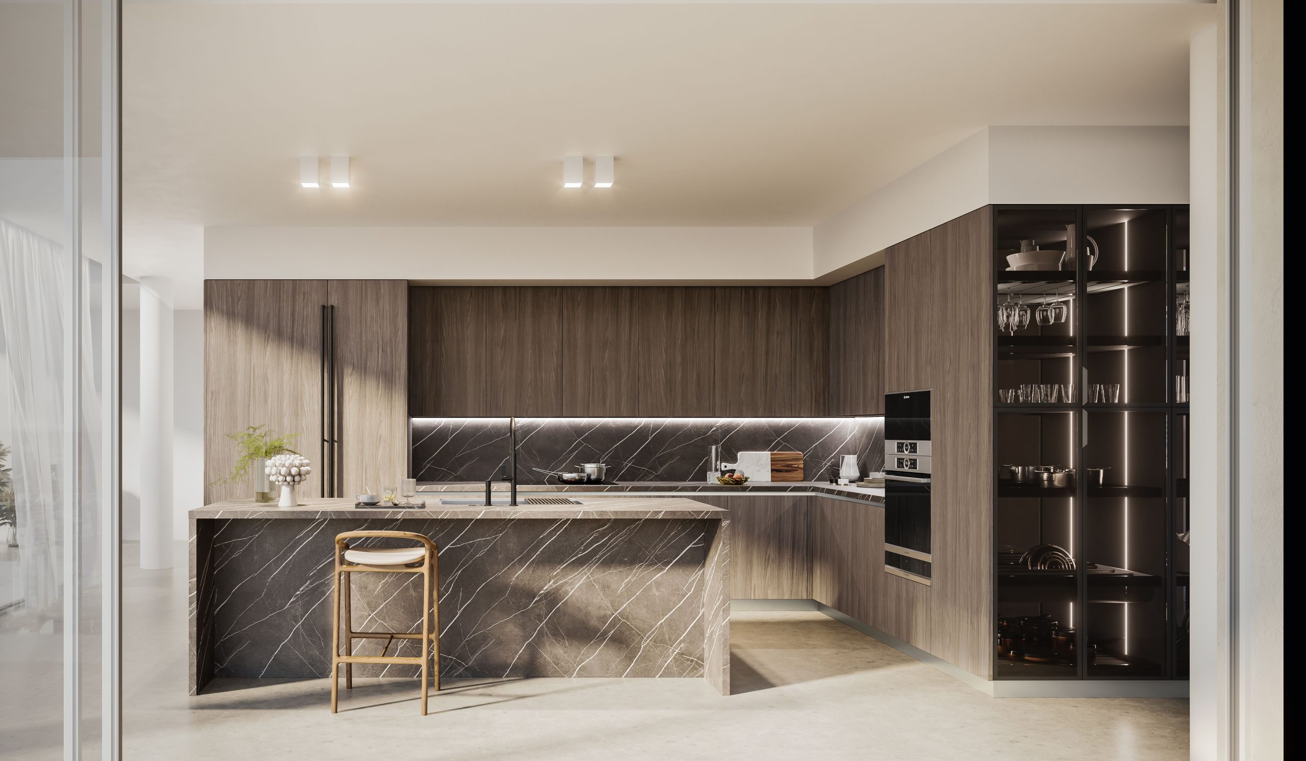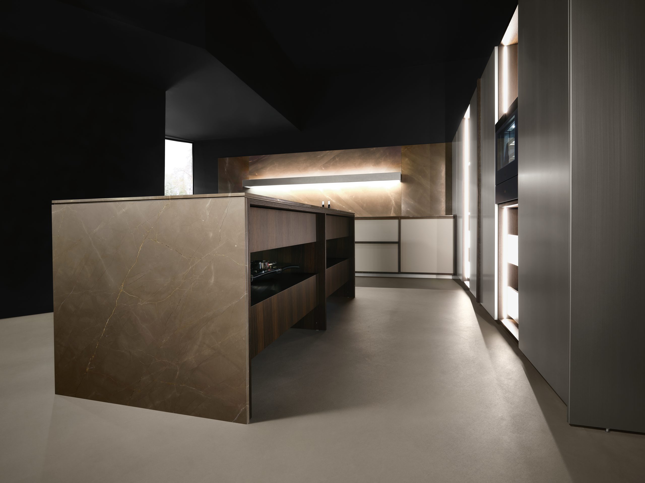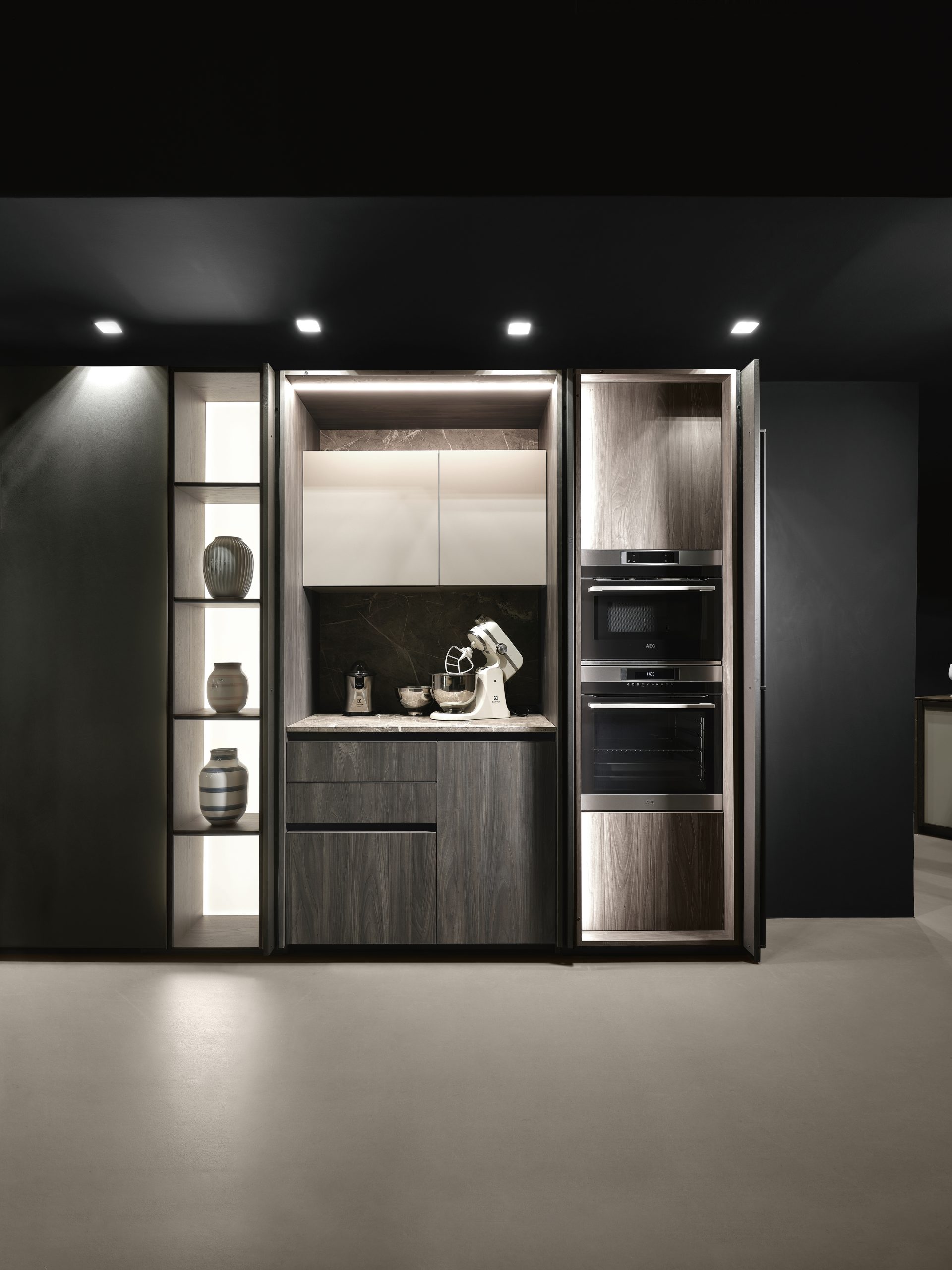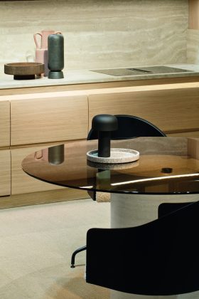Attenta alla qualità anche percettiva dello spazio cucina, Maistri ha condotto approfonditi studi sull’impiego della luce artificiale. Per i suoi progetti ha scelto così di privilegiare la luce con temperatura 2700K, "calda e tendente al giallo-dorato", spiega Cristian Viola, art director di Asso Group. "A differenza delle luci con temperature più fredde, che stimolano l’attenzione e possono risultare disturbanti in contesti domestici, la luce calda accompagna la transizione verso il riposo favorendo una sensazione di calma. Inoltre, è ideale per porre in risalto pietre, legni materici, metalli bruniti e laccature opache, restituendo una profondità cromatica autentica".