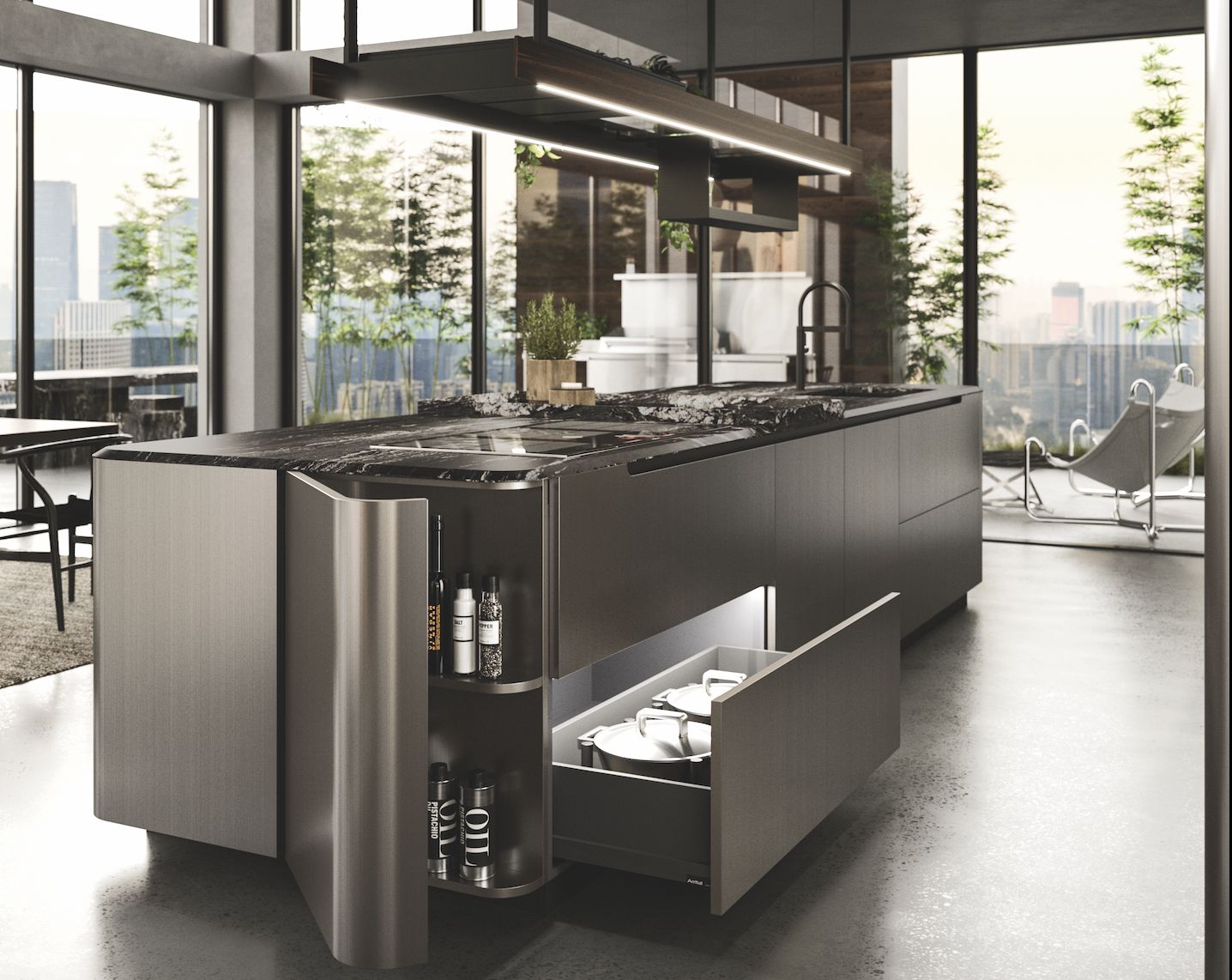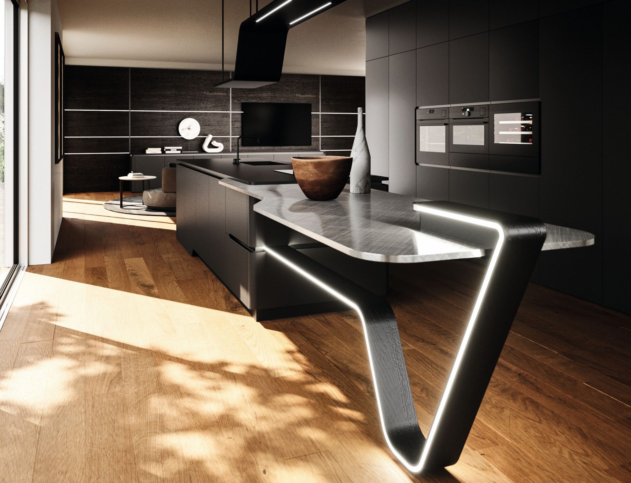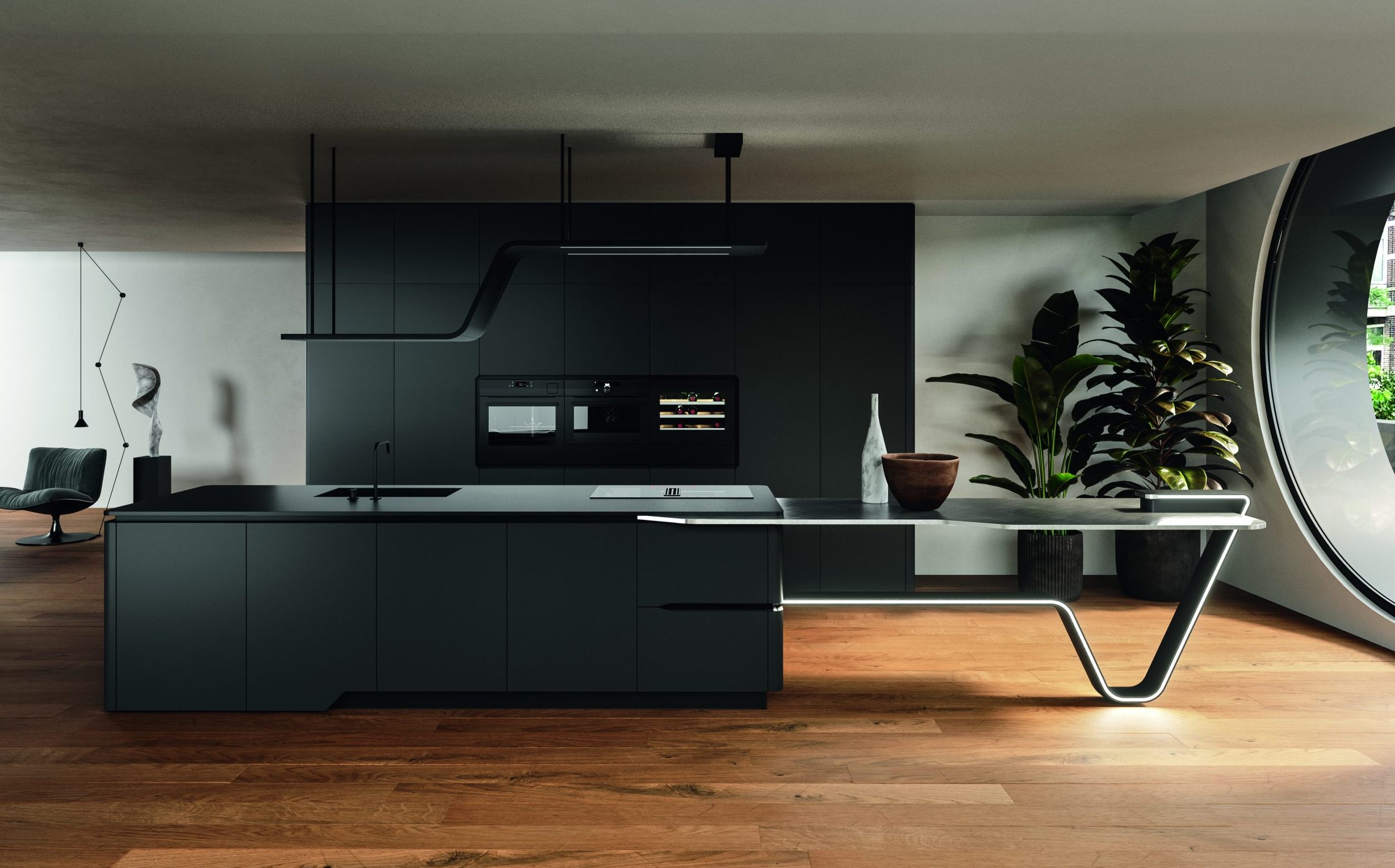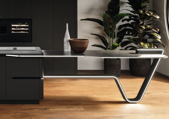 Le linee fluide si fondono all’ergonomia e alla ricerca tecnologica nel modello Vision di Snaidero firmato dallo studio Pininfarina, il cui segno estetico distintivo trova, qui, espressione massima nel design della penisola. Il supporto che sostiene e avvolge il pianotavolo è un elemento architettonico dinamico profilato da un bordo continuo di luce led che proietta Vision in uno scenario quasi fantascientifico. Il design del piano si riverbera sulla mensola-cappa, anch’essa pensata come ulteriore elemento scenografico, in cui le due linee di luce a Led rafforzano l’ispirazione tecnologica dell’arredo. Tutto l’ambiente è enfatizzato da un