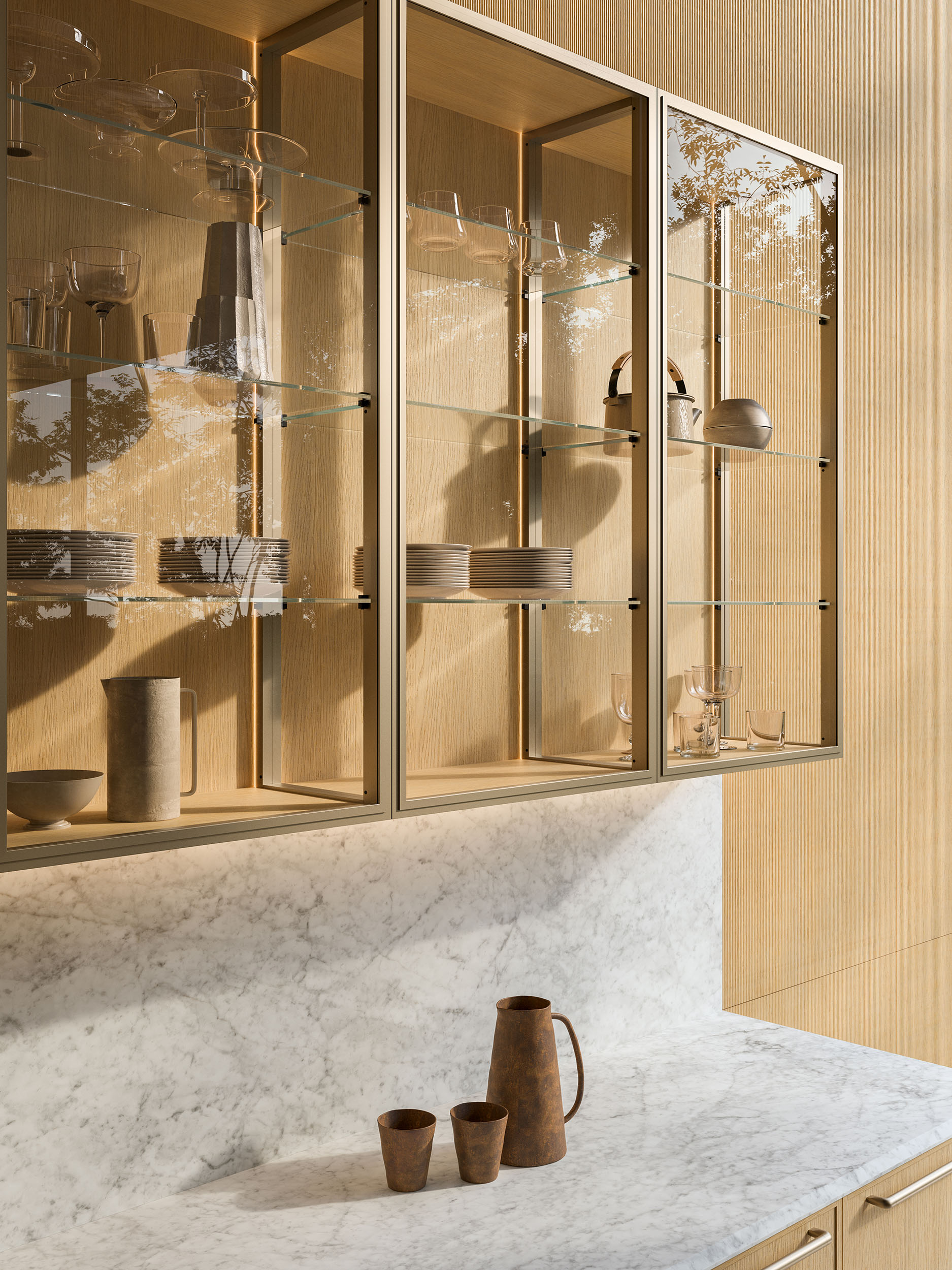 Realizzata in legno naturale, Chronos 2.2 de L'Ottocento si connota per i dettagli ricercati come i cassettoni con ante bombate e le colonne in legno di rovere Nordico, i pensili vetrina in rovere Moro, il vano cantina. Tutto, esaltato da luci inserite in modo strategico, a iniziare dai cassettoni che si illuminano all’apertura. Nella parte superiore della composizione, lo strip led delle vetrinette è inserito verticalmente accanto al binario atto al posizionamento dei ripiani - e in basso, su tutta la lunghezza, in modo da illuminare il top. Nella cantinetta la luce Led è inserita nei ripiani per illuminare i vani per le bottiglie. Schienale e top sono in travertino naturale come la base del tavolo con piano in vetro bronzato, completato dalle sedie Archetipo.