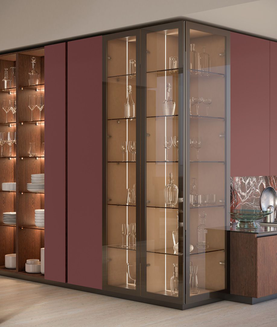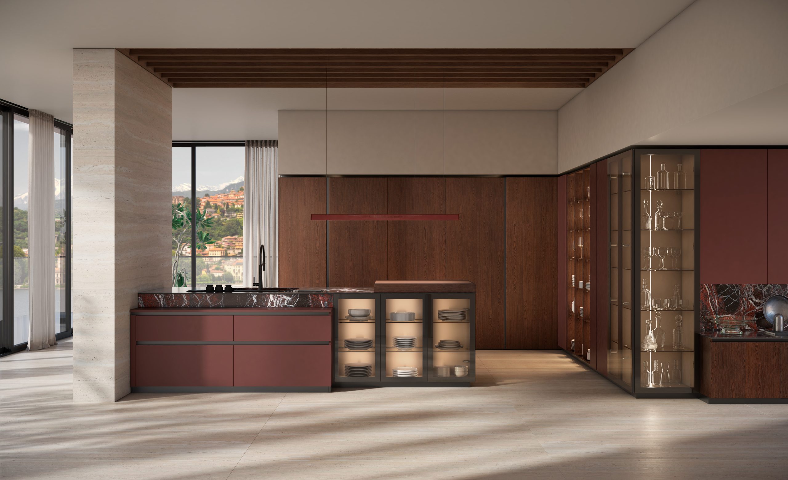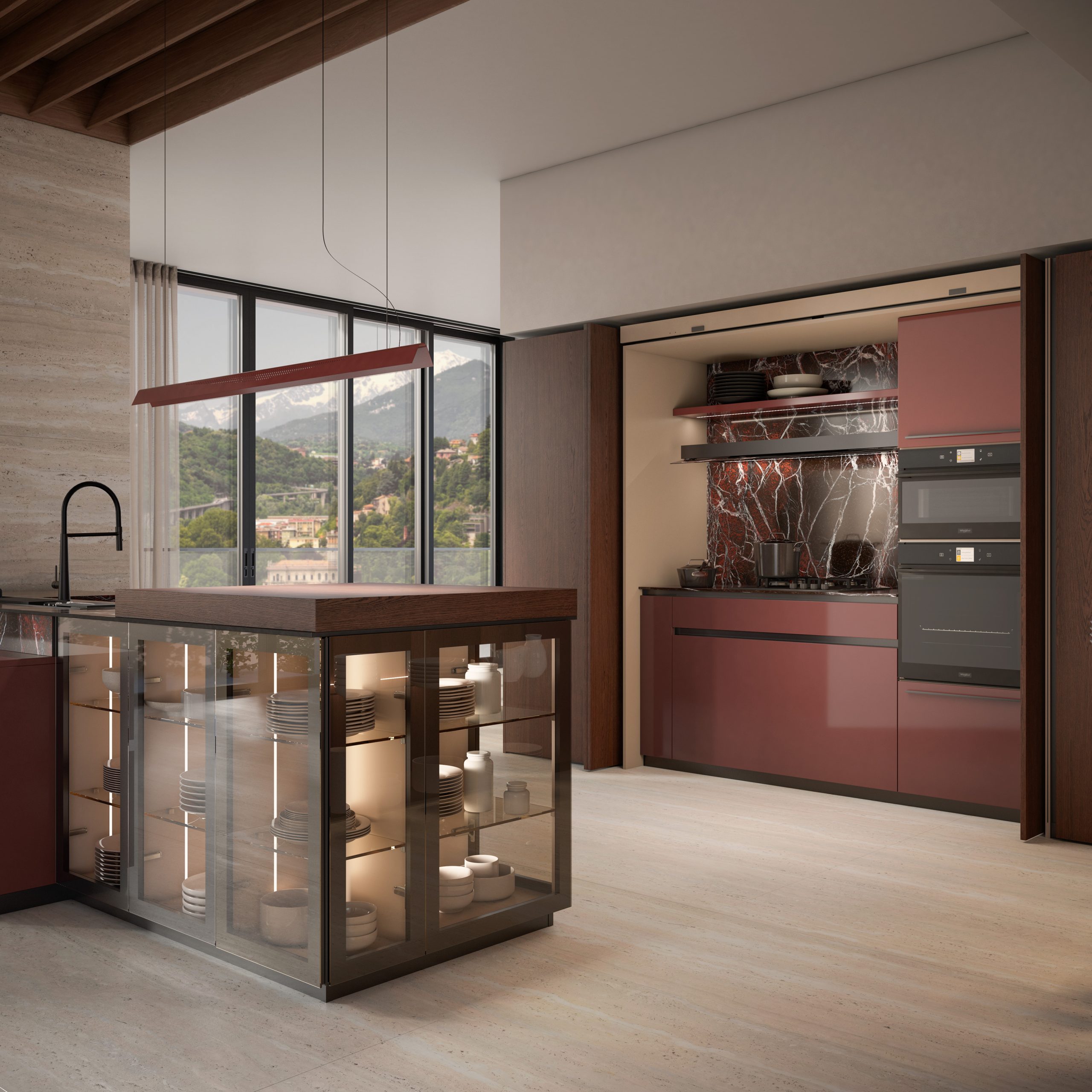 Mobili a giorno in impiallacciato Rovere Brandy con ripiani in vetro retroilluminati con luce led. per la soluzione creata con Brera di Lube. Colonne a vetro con telaio alluminio Reflecta con elemento terminale apribile sia sul fronte sia sul lato. La zona cottura è contenuta nell’elemento Mask e volendo può essere nascosta da ante impiallacciate Rovere Brandy rientranti in appositi alloggiamenti. La nicchia è rivestita in grès di Infinity Surfaces color Rosso Domus, adottato anche per il piano dell’isola.
