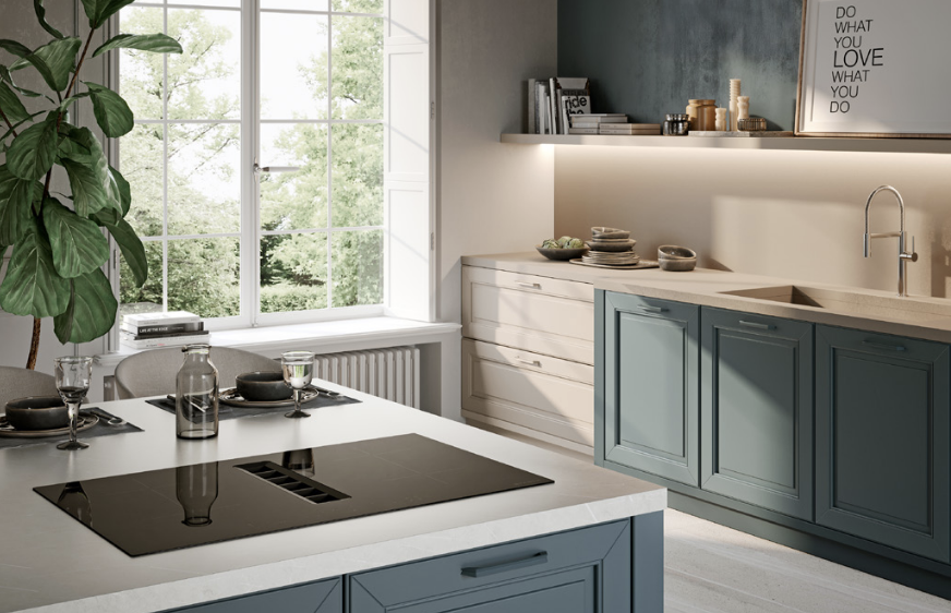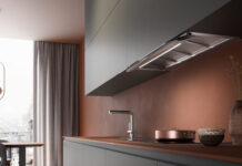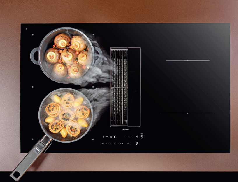 Ergonomia. Il piano con cappa integrata concentra in un solo prodotto due funzioni ottimizzando l’interazione con l’utente.