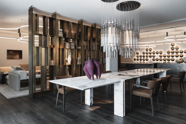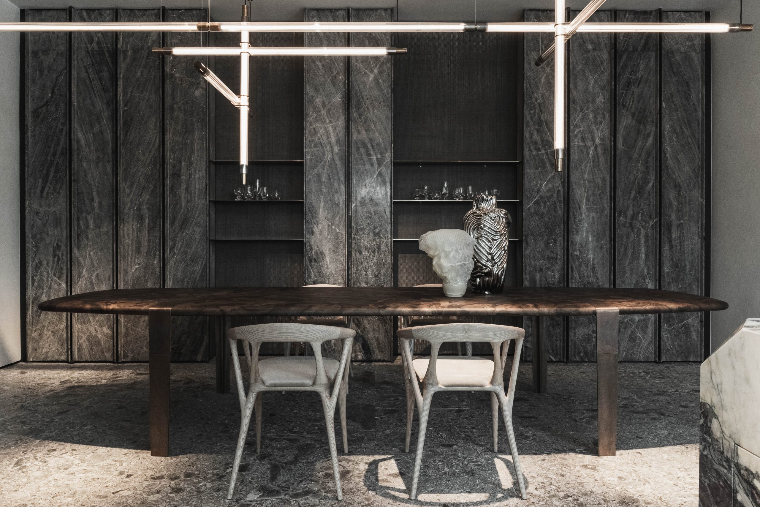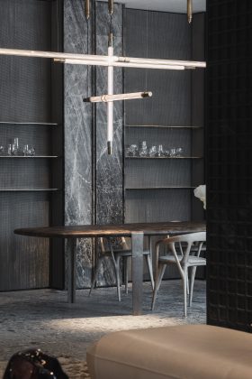 Henge, Dubai Flagship Store: i sistemi armadio per il living e il tavolo in metallo brunito