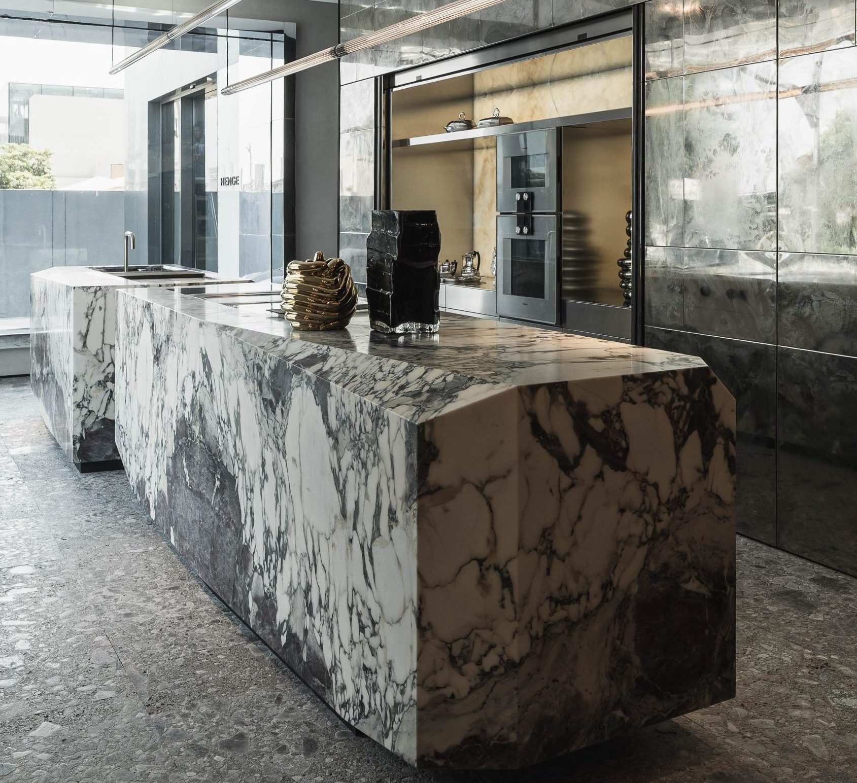 Nel fagship store Henge Dubai sono in mostra i due scultorei blocchi in marmo scolpito della cucina Ozone