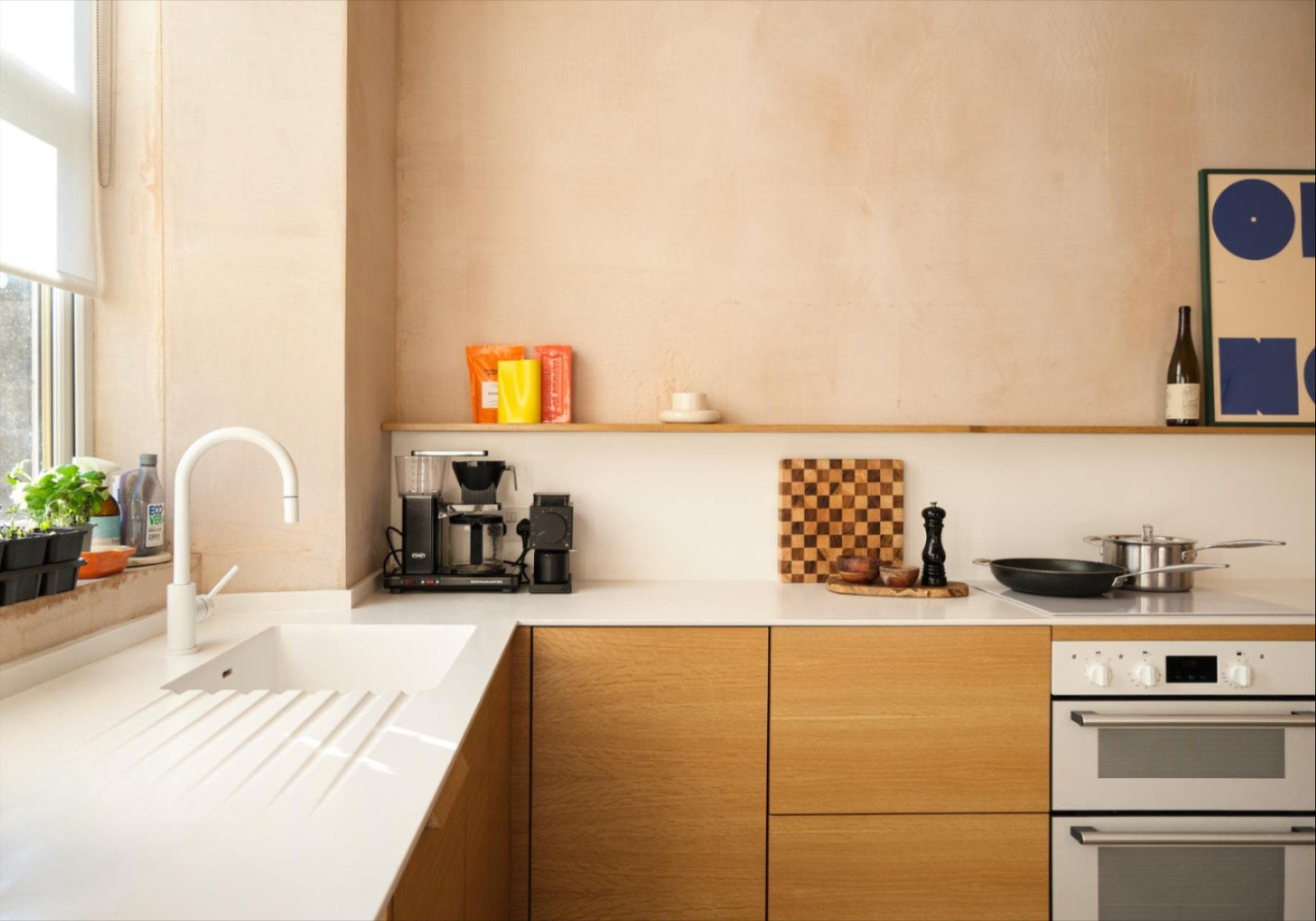 "Per noi è fondamentale creare spazi caratterizzati da pulizia formale e dettagli sempre curati", afferma Clare Morton, designer di KitCaboose Kitchen. "Non seguiamo i trend del momento, ma quelli che sono i nostri standard: utilizzo di materiali di qualità e design essenziali”. Il rovere naturale aggiunge texture e calore ai frontali dei pensili, mentre Himacs, con la sua finitura morbida, setosa e priva di giunture, offre una superficie igienica, robusta e una estetica impeccabile. La classica tonalità Himacs Alpine White valorizza gli elementi in legno definiti da linee pulite ed essenziali dando vita ad uno spazio di ispirazione japandi.