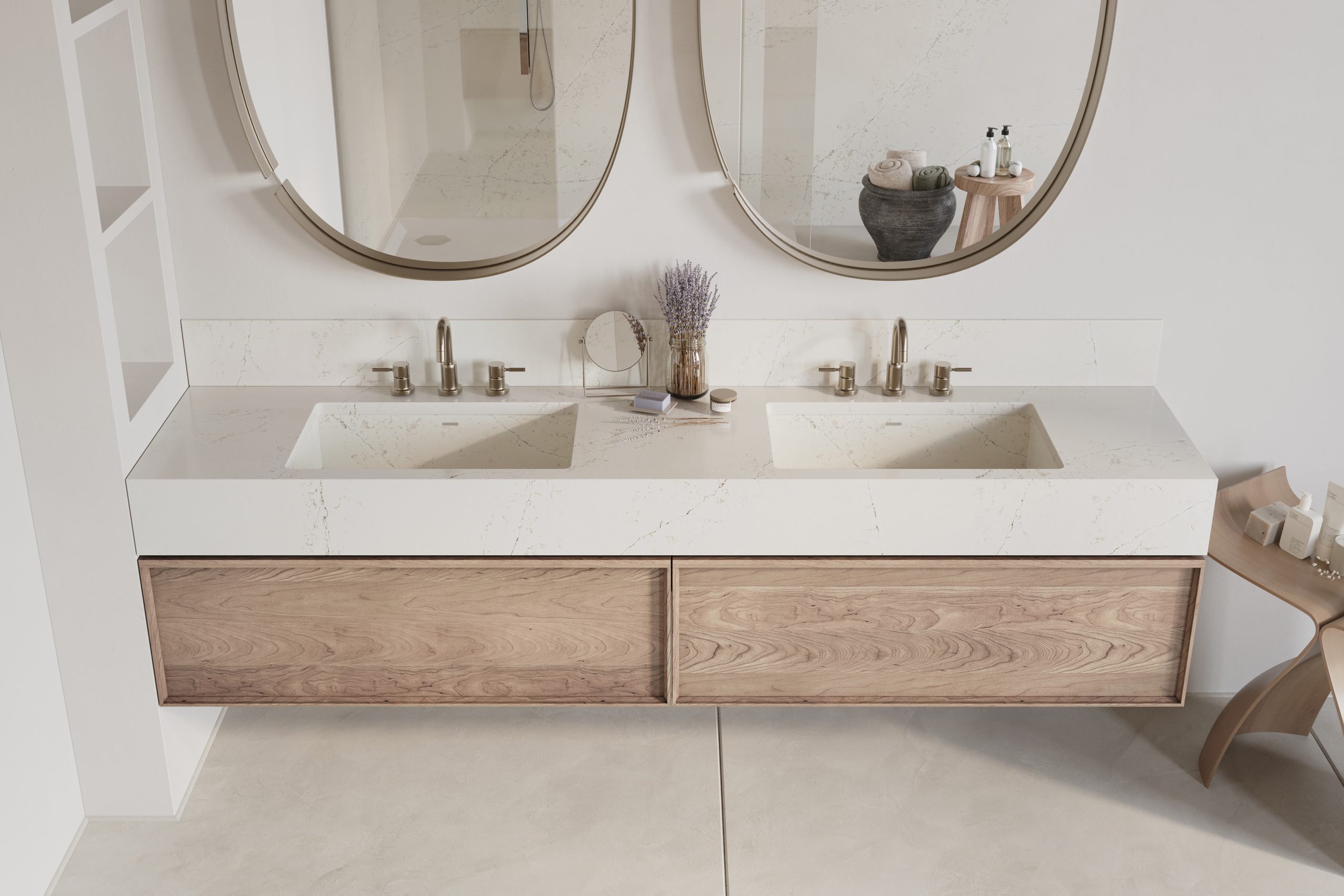 Versatile e sofisticata, la nuova superficie Suma è realizzata grazie alla tecnologia Hybriq+® di Silestone®, basata su processi produttivi ad alta circolarità e basso impatto ambientale.