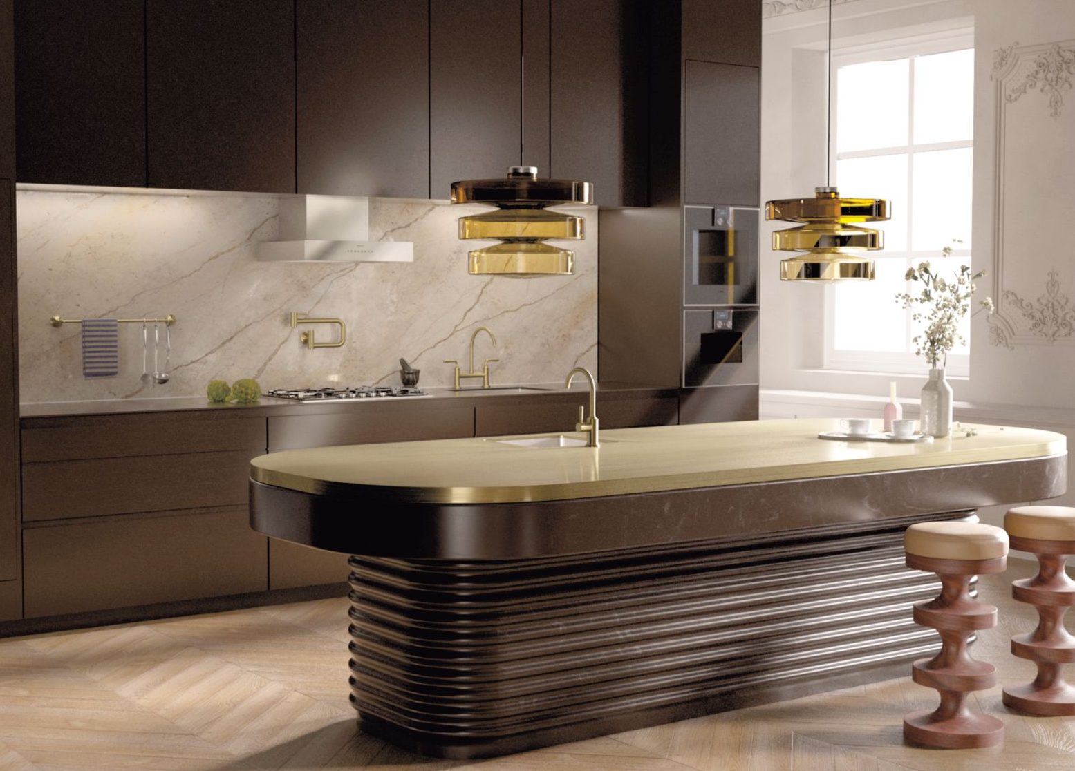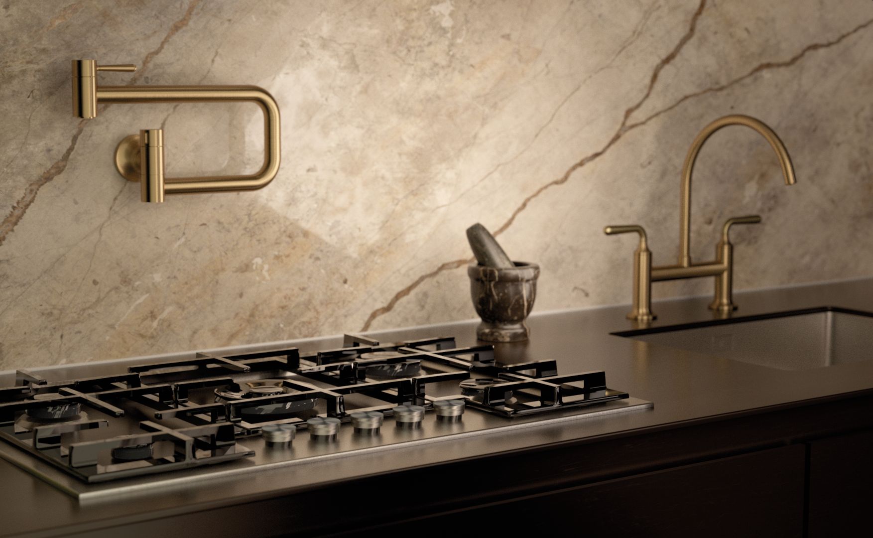 Il Dark Brass - ovvero l'ottone scuro - presenta un carattere profondo e raffinato dalle sfumature calde; la speciale finitura PVD spazzolata affascina per la texture setosa e lo sfaccettato gioco di colori. L'ottone scuro spazzolato dei rubinetti e accessori Dornbracht è capace di conferire carattere ad ogni progetto cucina, dai più minimalisti ed eleganti a quelli più espressivi e opulenti. Particolare e intenso, crea accostamenti raffinati quando viene abbinato ai legni scuri, alle pietre naturali o a elementi metallici dell'arredo cucina, risultando ideale per gli interni contemporanei. In particolare, Vaia in versione miscelatore a ponte nel nuovo ottone spazzolato si distingue con eleganza sul top scuro e lo schienale in pietra naturale dalle profonde venature.