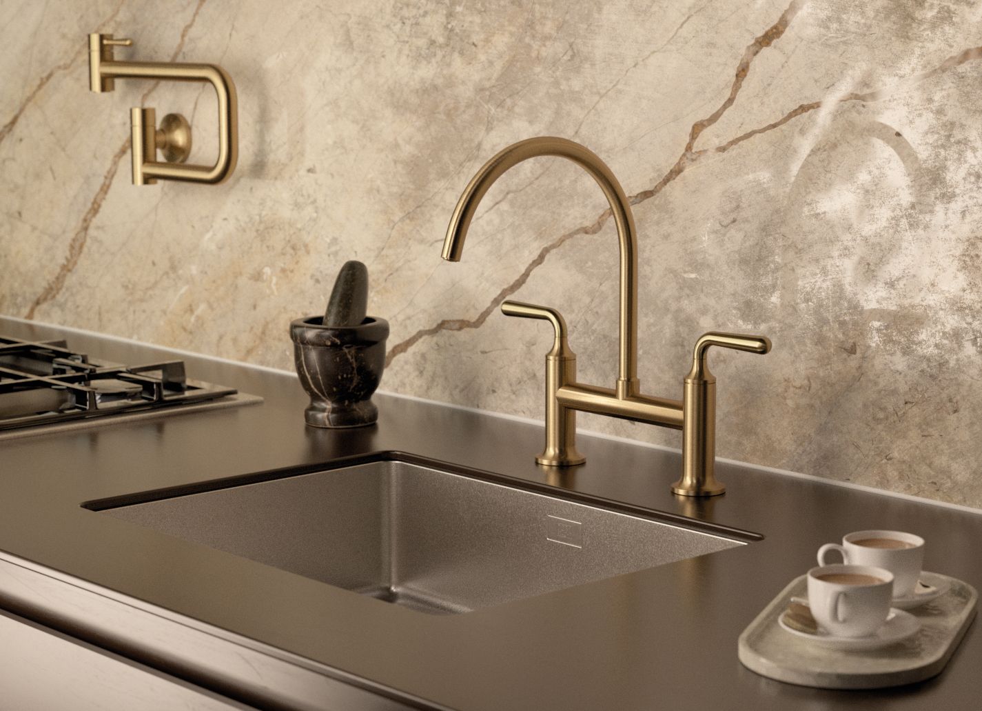 Il Dark Brass - ovvero l'ottone scuro - presenta un carattere profondo e raffinato dalle sfumature calde; la speciale finitura PVD spazzolata affascina per la texture setosa e lo sfaccettato gioco di colori. L'ottone scuro spazzolato dei rubinetti e accessori Dornbracht è capace di conferire carattere ad ogni progetto cucina, dai più minimalisti ed eleganti a quelli più espressivi e opulenti. Particolare e intenso, crea accostamenti raffinati quando viene abbinato ai legni scuri, alle pietre naturali o a elementi metallici dell'arredo cucina, risultando ideale per gli interni contemporanei. In particolare, Vaia in versione miscelatore a ponte nel nuovo ottone spazzolato si distingue con eleganza sul top scuro e lo schienale in pietra naturale dalle profonde venature.