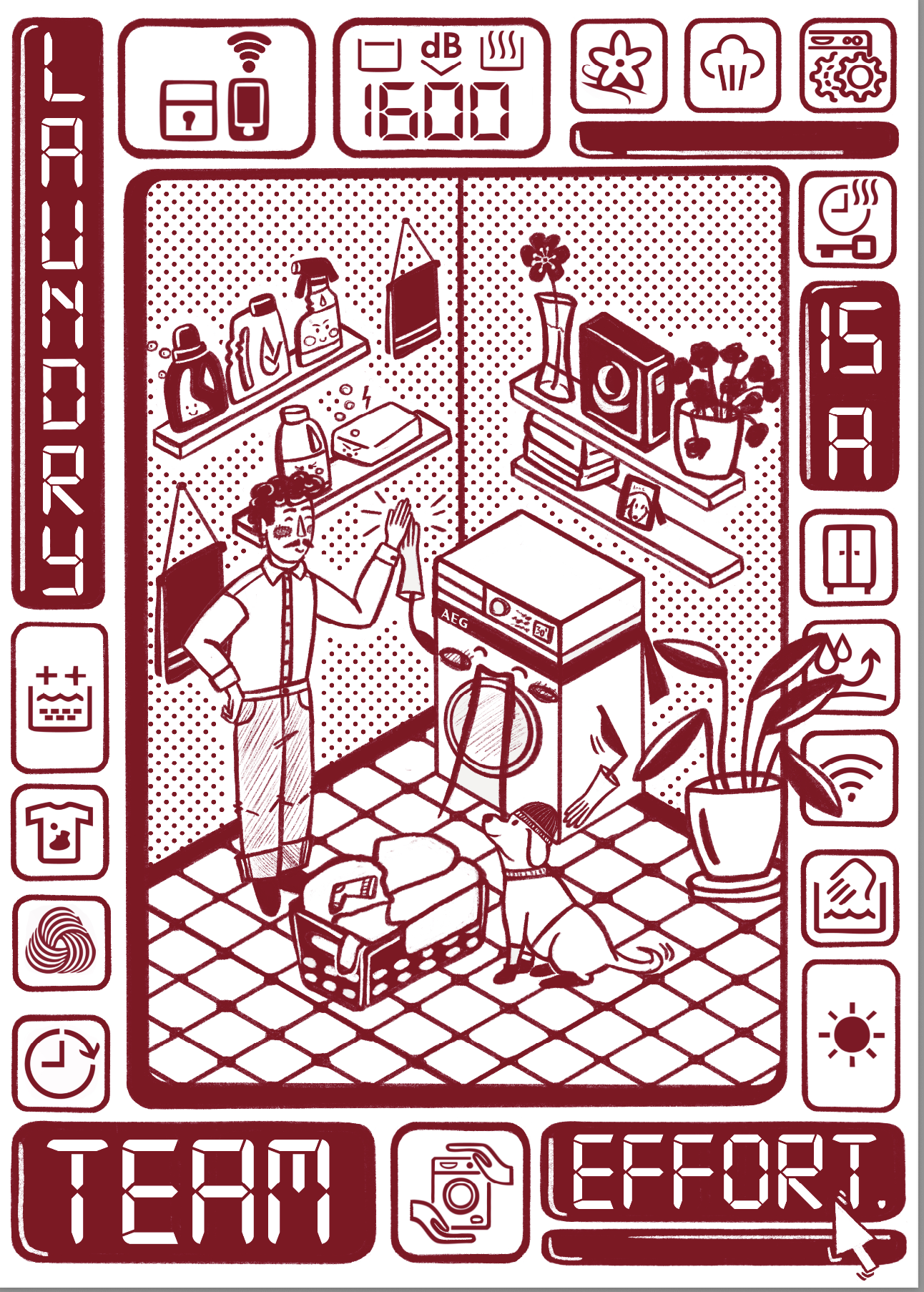 Un manifesto giocoso ispirato alla grafica giapponese supportato da una smart app che trasforma la lavatrice in un compagno di lavaggio. L'utente può infatti creare un avatar personalizzato per il proprio elettrodomestico, che diventa una guida quotidiana e un assistente AI per controllare i lavaggi da remoto, tracciare i consumi di acqua ed energia, e soprattutto di entrare in una community dove condividere consigli eco-friendly e trucchi per la cura dei capi.