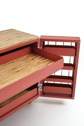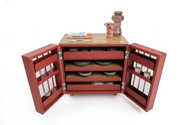 Grazie alla sua modularità e alla flessibilità della sua composizione, Memè può adattarsi a qualsiasi ambiente. Memè risponde inoltre alla necessità di un impegno verso la sostenibilità, attraverso la scelta dei materiali con cui è realizzata. La struttura della credenza è in metallo verniciato, mentre i ripiani e gli accessori interni sono in legno di recupero: si tratta del legno degli ulivi del territorio pugliese colpiti dal batterio Xylella, altrimenti destinati allo smaltimento. Questo approccio consente di dare nuova vita e bellezza al legno di ulivo, materiale prezioso con venature e tonalità creati dalla natura nel tempo.