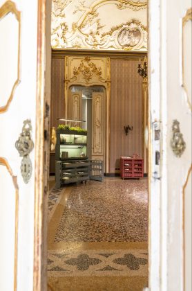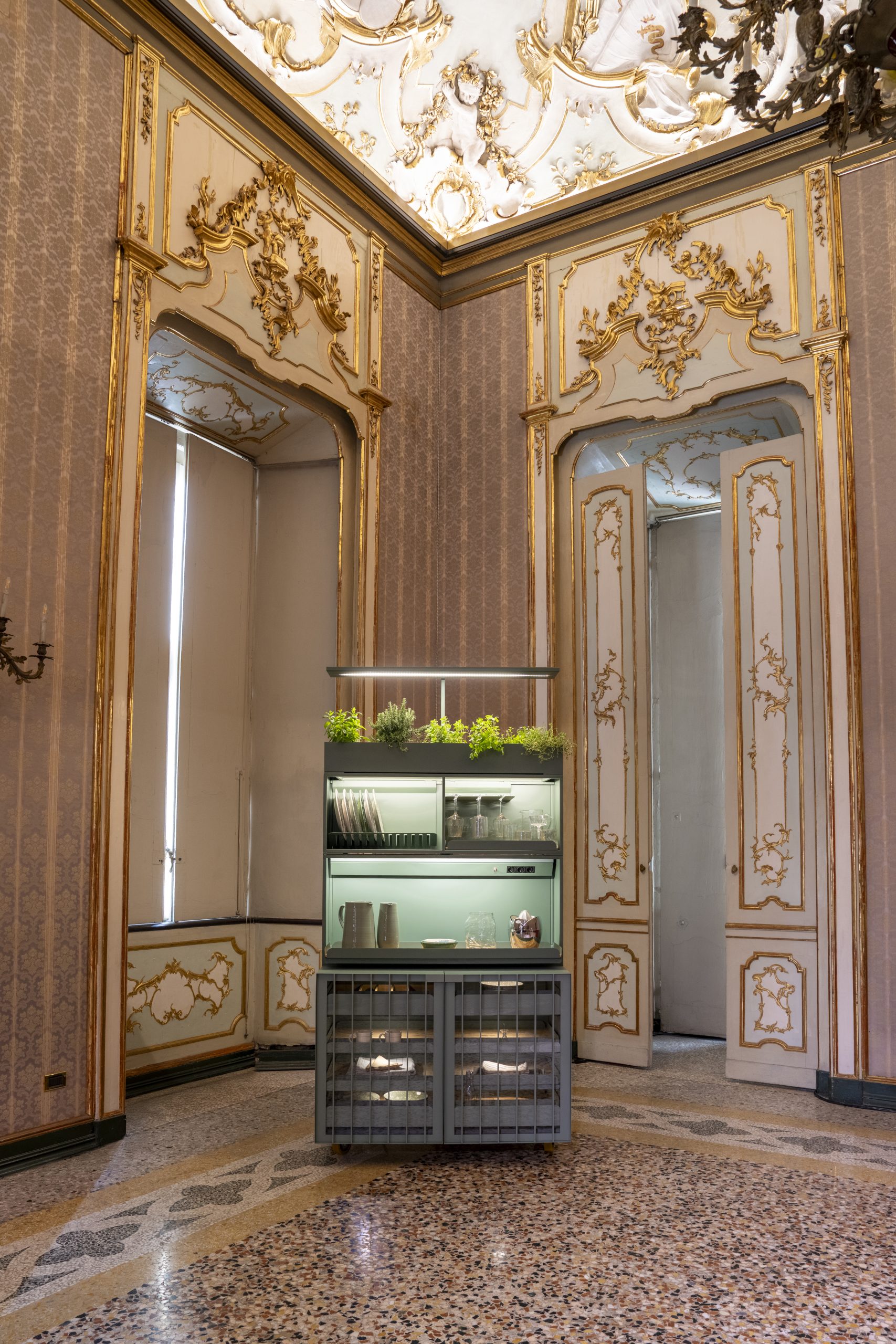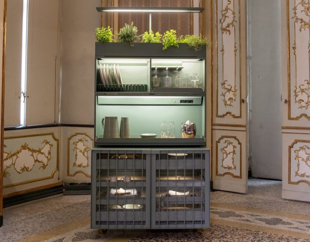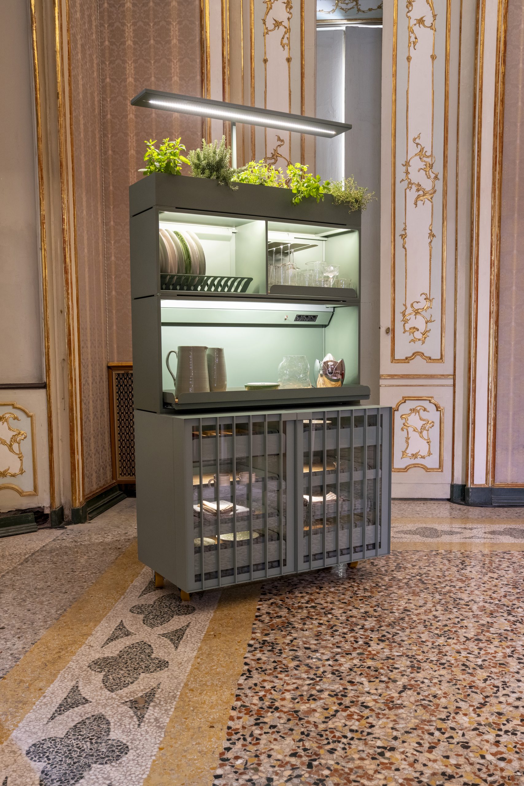 La credenza è costituita da un elemento-contenitore con ripiani, cassetti e ante, oltre a due elementi a giorno con piano di lavoro e scaffali contenitori. Nella parte superiore della credenza trova posto un innovativo modulo per la coltivazione idroponica di piante aromatiche e ortaggi, con