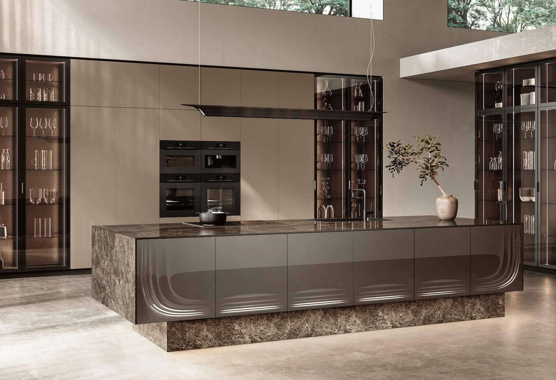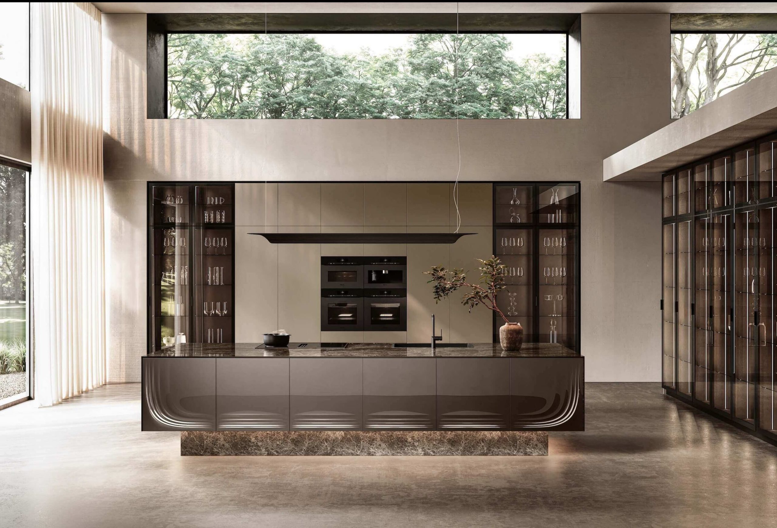"Siamo partiti da qui, pensando alla riviera romagnola e al movimento delle onde basse del suo mare", spiega l’architetto. "Abbiamo studiato i processi generativi del moto ondoso secondo l’approccio di progetto tipico del nostro modus operandi, come le curve 3D, uno stilema riconoscibile di Zaha Hadid Architects. L’uso del vetro è stato proposto da Febal Casa, una grande idea che ci ha colto di sorpresa". Plus assoluto di Onda, quindi, il pannello in vetro 3D, lavorato secondo un processo unico e inedito. “L'ante materica in vetro di Onda è il risultato di una lavorazione completamente diversa da quella che viene adottata per altri elementi in vetro del marchio stesso. In questo caso infatti, per Onda, il pannello viene realizzato da Febal grazie ad una lavorazione esclusiva e legato a una forte componente artigianale, che sottende una sfida materica".