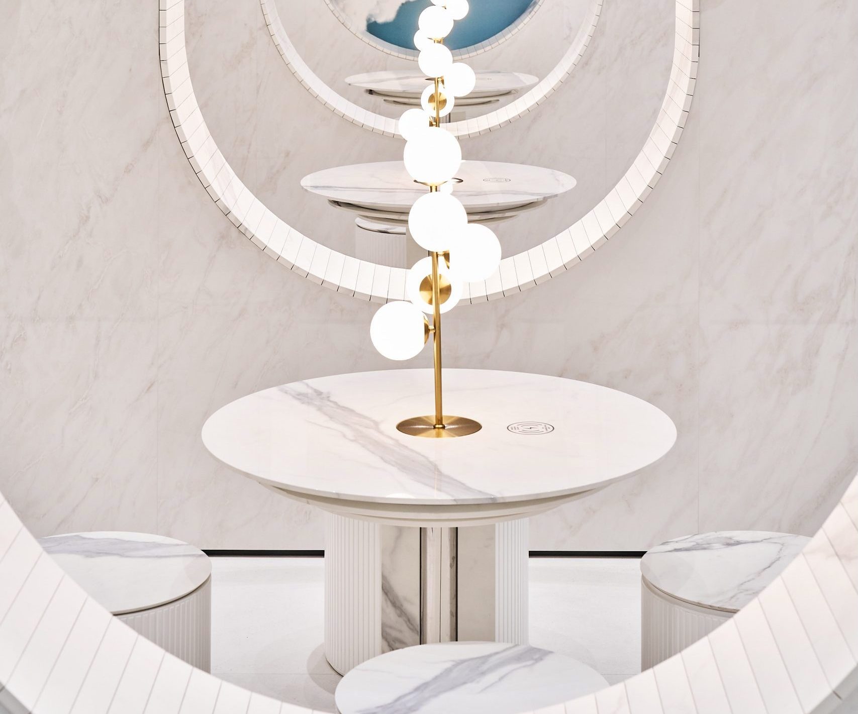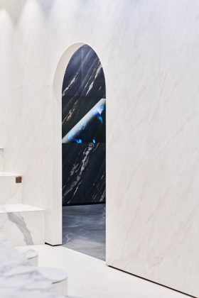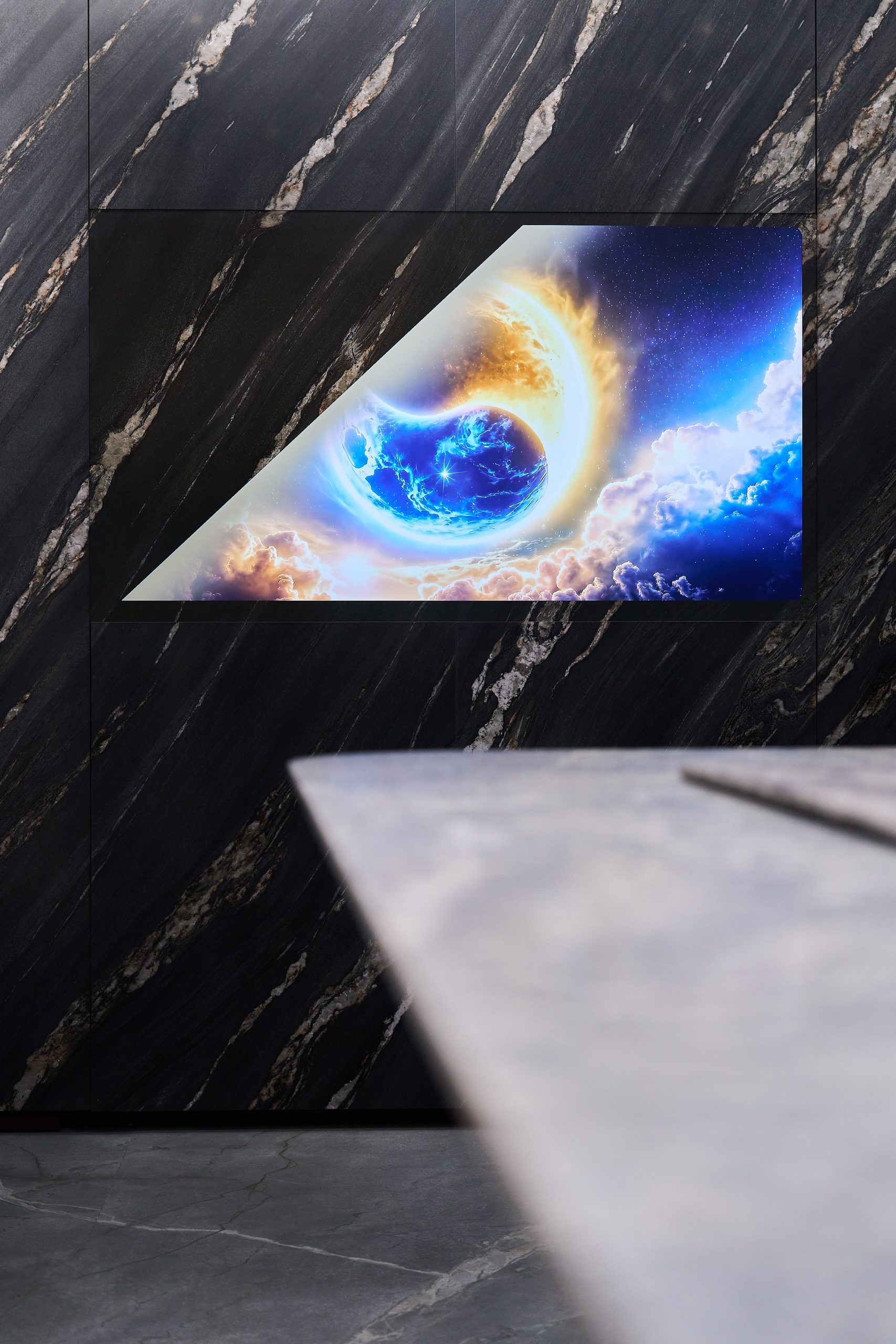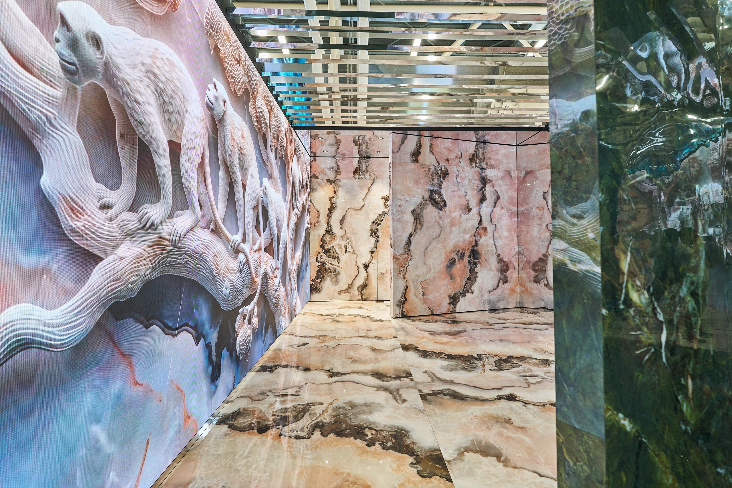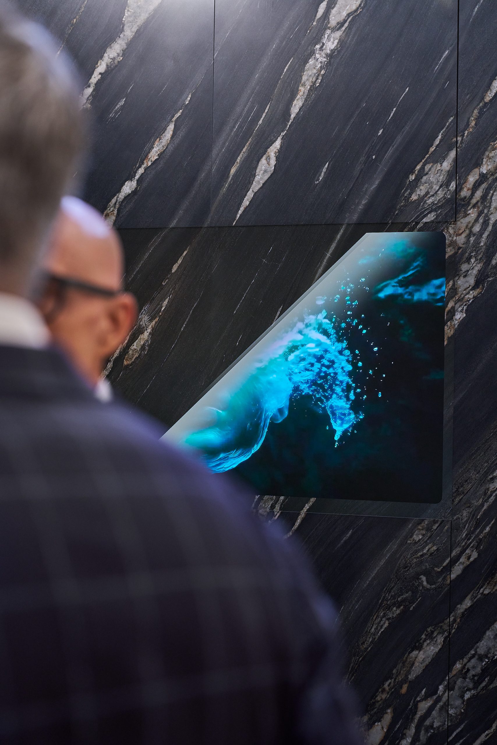 Un percorso reso possibile grazie alla “pelle ceramica”, alle installazioni, alla tecnologia applicata e ai morphing digitali realizzati dalla visual artist Lorenza Liguori. Questa esperienza immersiva culmina con Alchimia&Iris Ceramica Group nella quale la superficie ceramica si mimetizza e si svela grazie a una tecnologia sofisticata sviluppata appositamente per essere applicata alle lastre dei brand di Iris Ceramica Group.