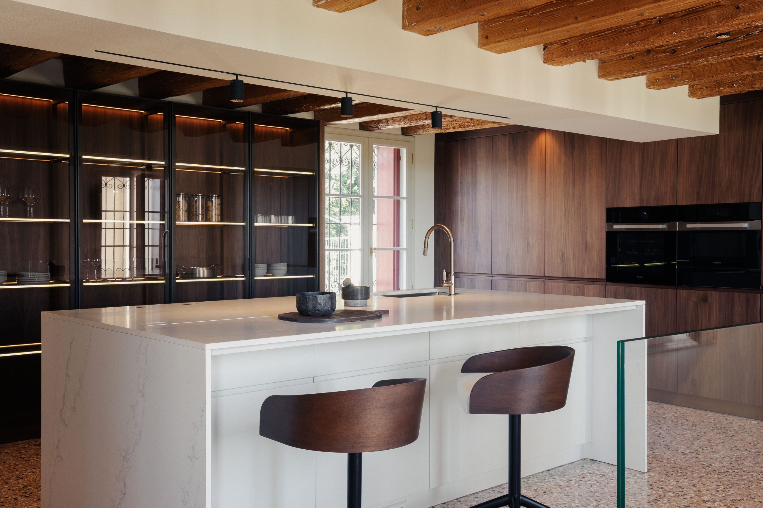 La cucina che comunica con il living e con la sala pranzo è uno spazio avvolgente e dominato dalle possenti travi in legno a vista, rispristinate grazie ad un lungo e meticoloso lavoro. Di grande pregio, l'arredo in legno della cucina è stato realizzato da L'Ottocento con il sistema Archetipo e comprende un'isola e armadiature che la circondano. Di primo impatto e di grande effetto è la scelta di contrappore l'isola completamente bianca - di 150 x 264 cm - alle capienti armadiature in legno di noce Canaletto naturale, che appartengono ad uno stesso modello de L'Ottocento: Archetipo. L'isola si pregia di fiancate e top in Lapitec, che la rendono ancor più luminosa.