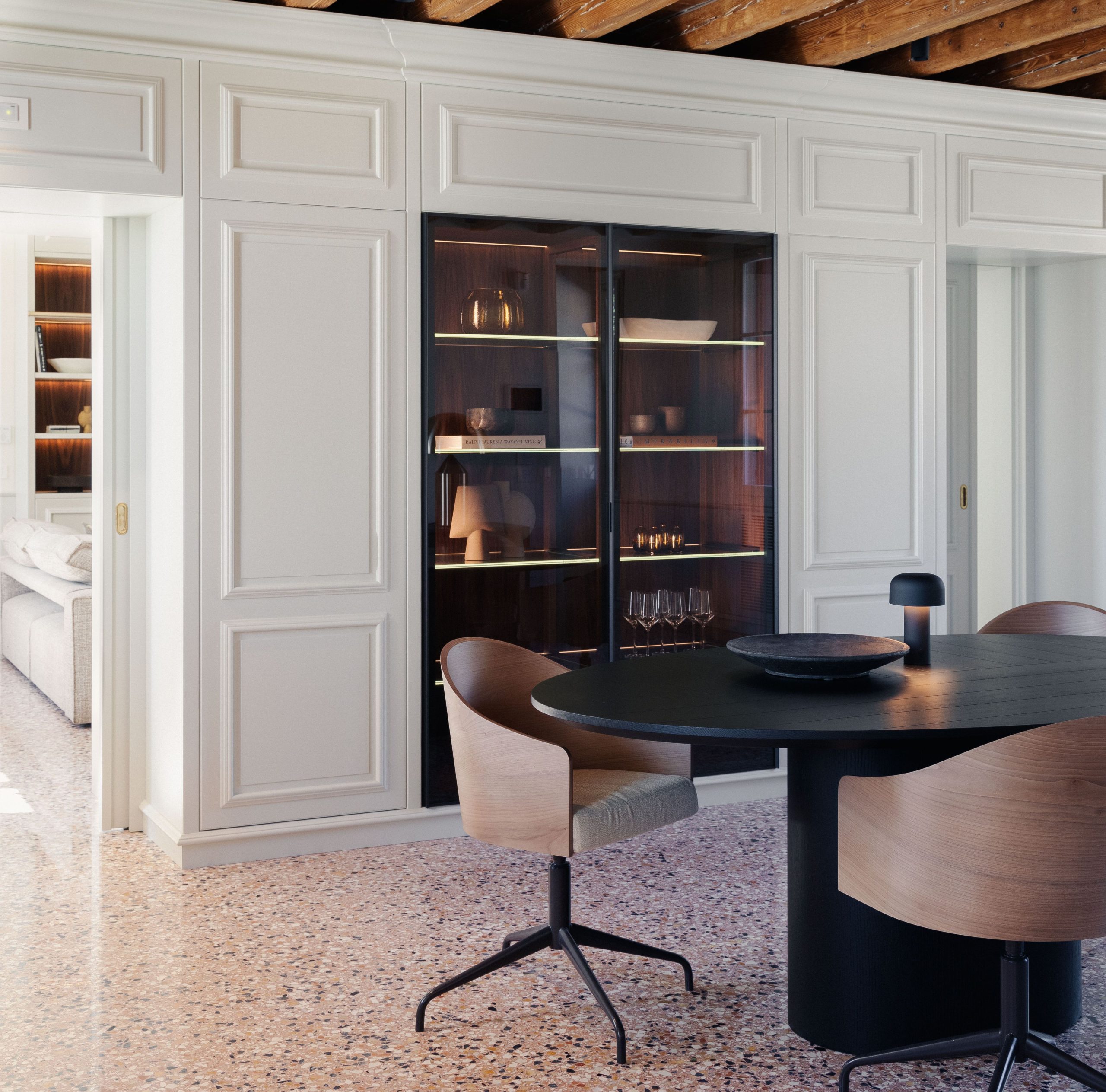 "Il living si sviluppa in un’area dove trova posto un divano centrale e due mobili identici: uno è pensato per ospitare la TV e la libreria a tutta altezza, mentre l’altro con ante chiuse che rientrano, dà spazio a un concetto di home office. Al dining si accede dalla cucina e dal living e comprende un tavolo e un'armadiatura con parte centrale a vetrina tutto sempre de L’Ottocento". Particolare risulta proprio il tavolo Meridiana, realizzato in rovere nero laccato poro aperto.