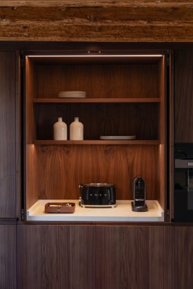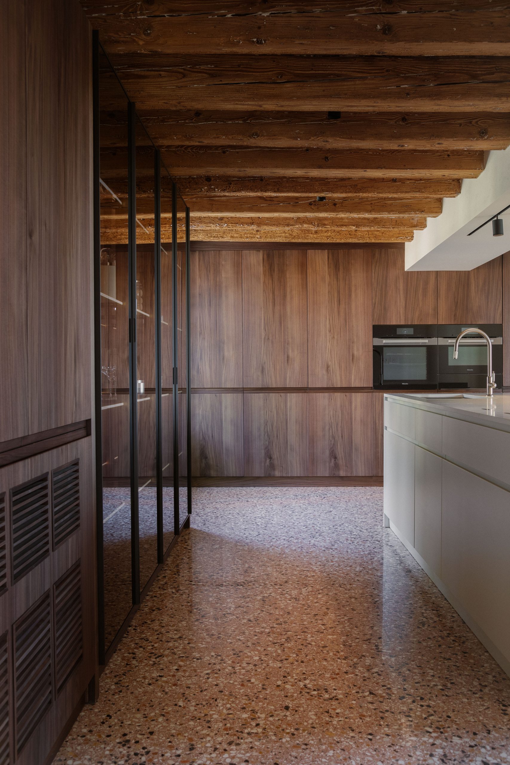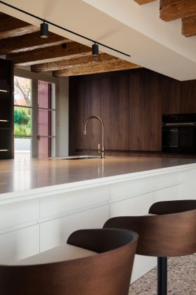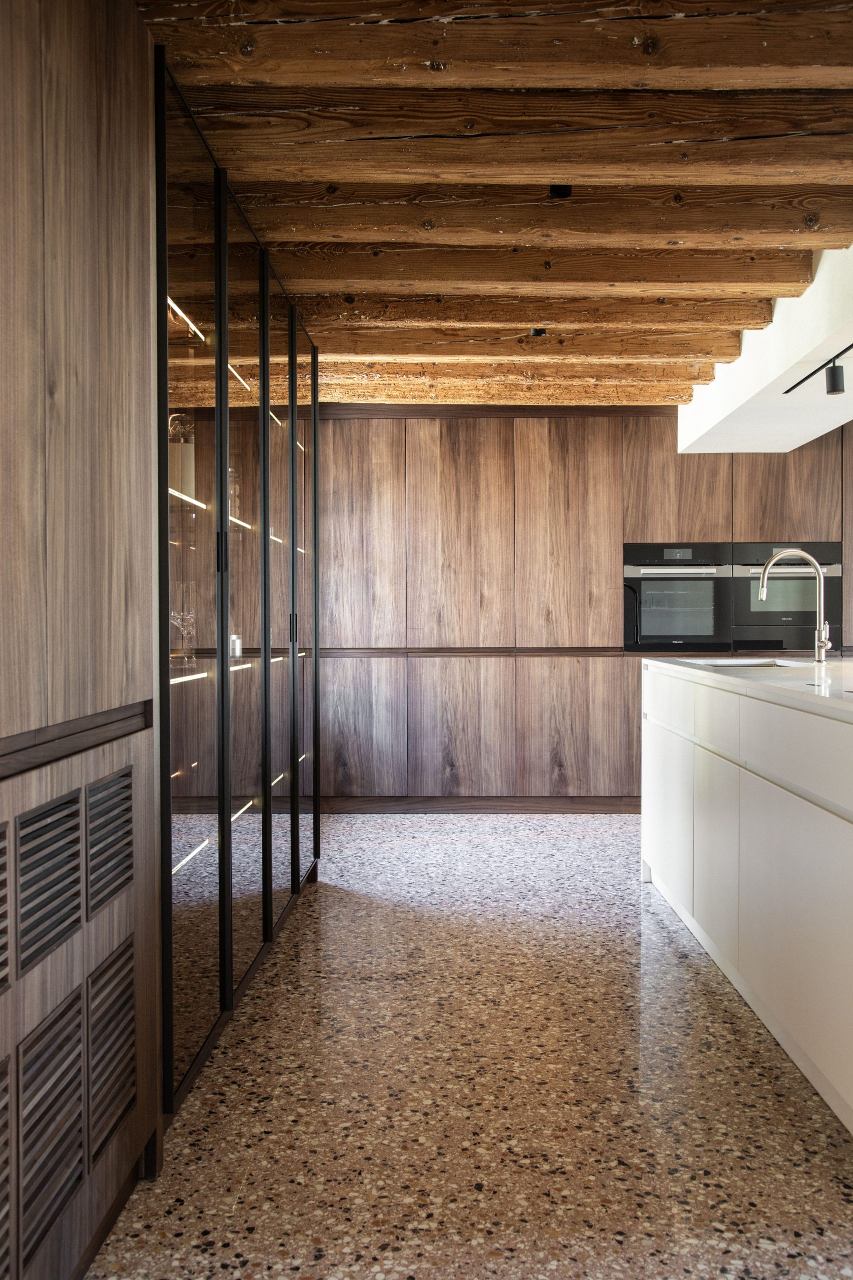 La cucina che comunica con il living e con la sala pranzo è uno spazio avvolgente e dominato dalle possenti travi in legno a vista, rispristinate grazie ad un lungo e meticoloso lavoro. Di grande pregio, l'arredo in legno della cucina è stato realizzato da L'Ottocento con il sistema Archetipo e comprende un'isola e armadiature che la circondano. Di primo impatto e di grande effetto è la scelta di contrappore l'isola completamente bianca - di 150 x 264 cm - alle capienti armadiature in legno di noce Canaletto naturale, che appartengono ad uno stesso modello de L'Ottocento: Archetipo. L'isola si pregia di fiancate e top in Lapitec, che la rendono ancor più luminosa.