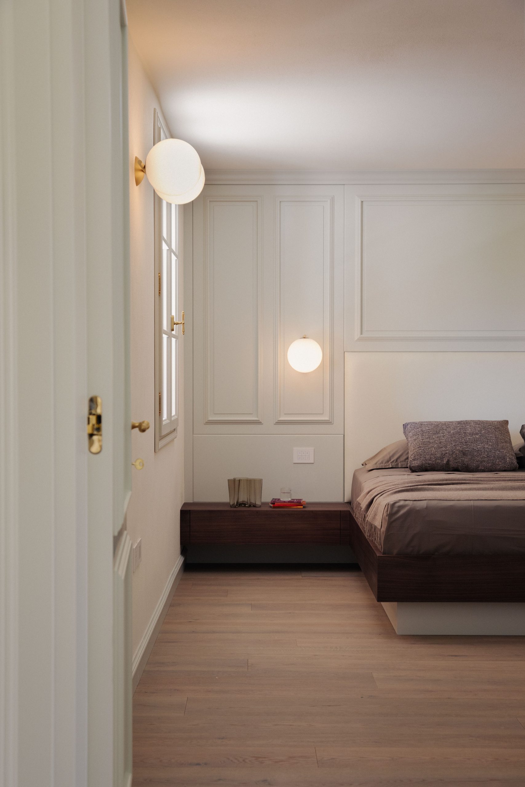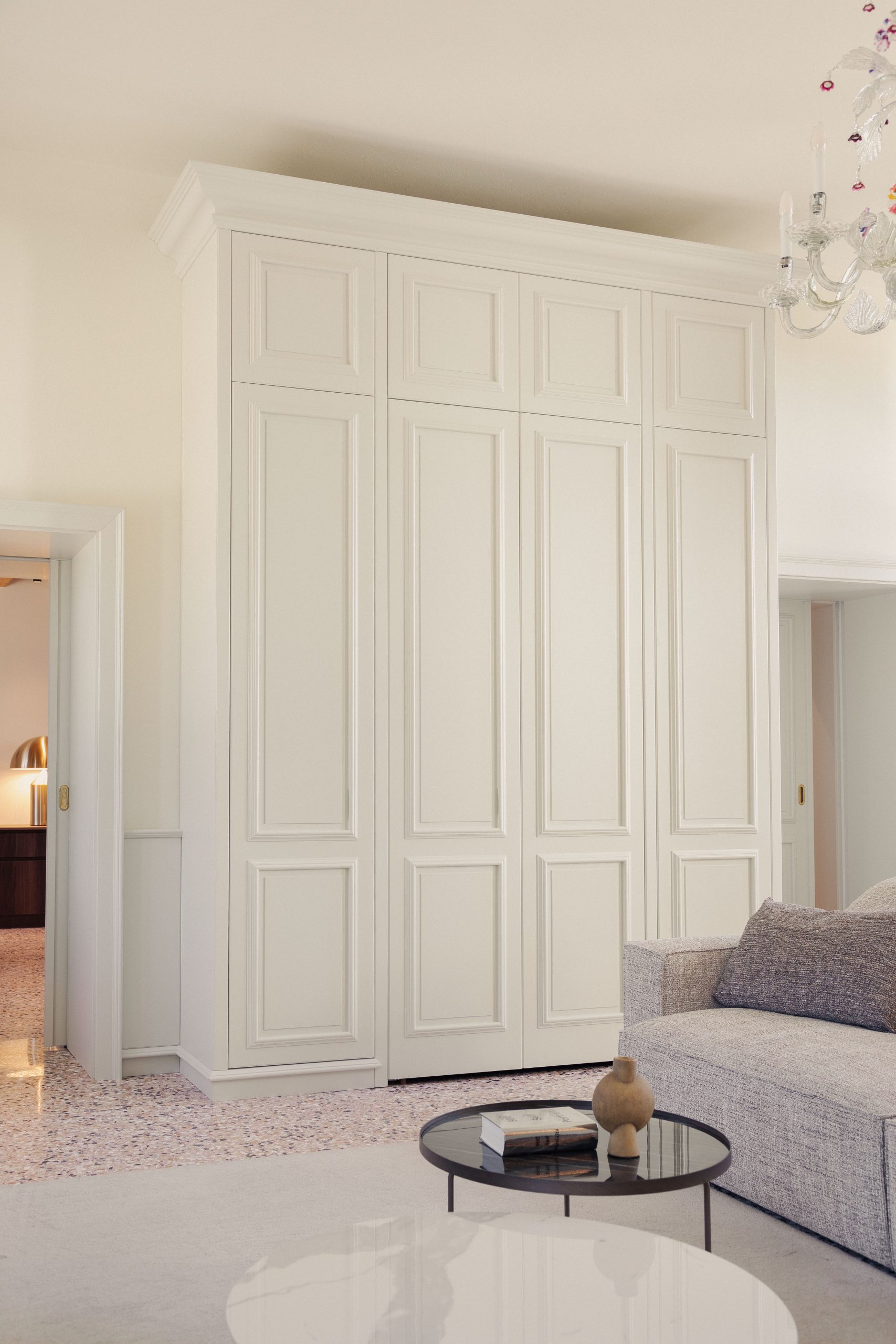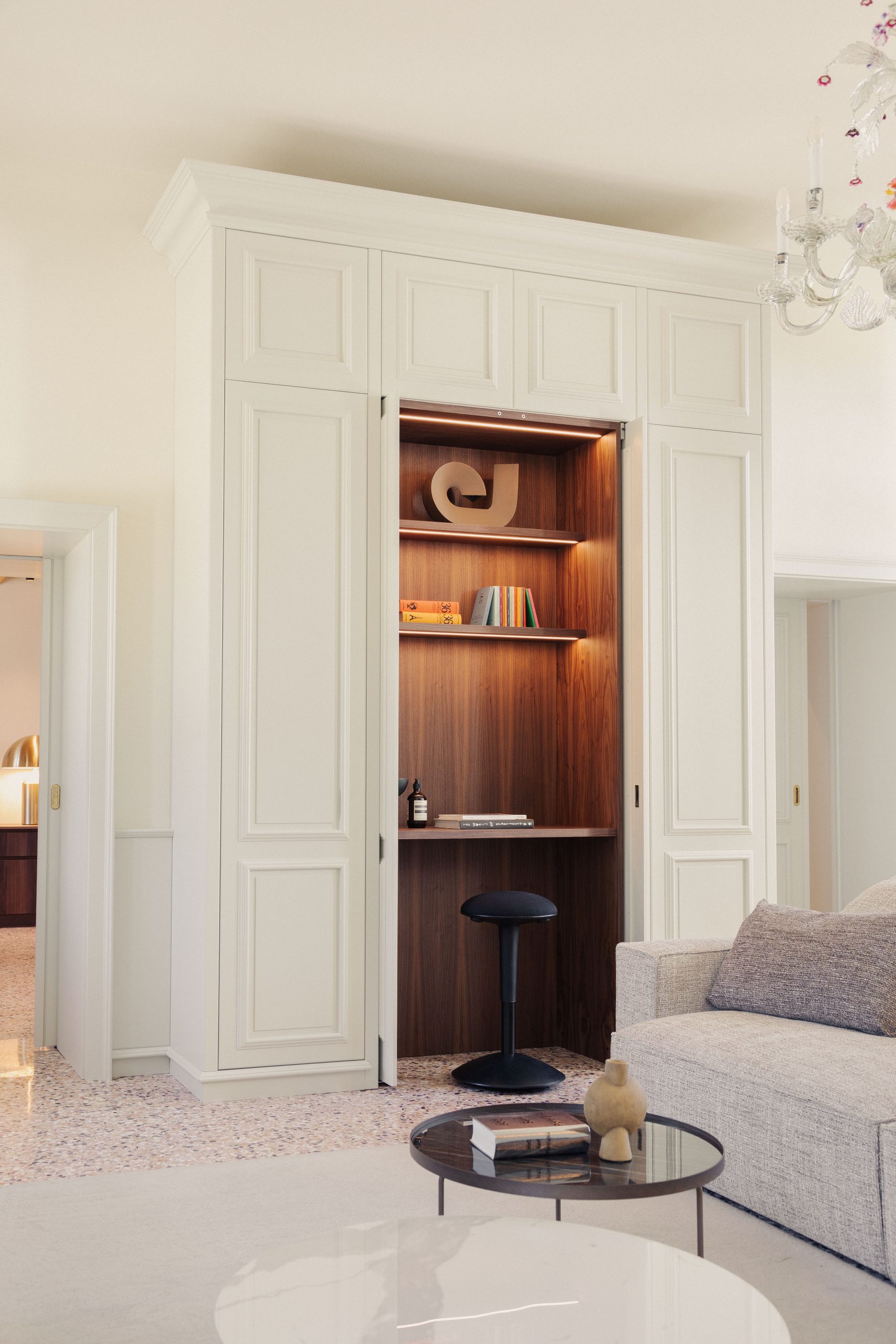 "L’esperienza e la capacità manifatturiera de L’Ottocento ci hanno permesso di pensare a soluzioni di interior completamente sartoriali, ma con lo stesso filo conduttore stilistico", spiegano gli architetti dello studio Russo Sgarbossa. "Gli arredi sono stati progettati in funzione delle esigenze abitative e del desiderio di creare armonia tra l’impianto architettonico esistente e una visione attuale dell’abitare. Le boiserie a tutta altezza sono state realizzate per conferire bellezza e fascino alle stanze ma anche, in alcuni ambienti, per ricreare delle quinte divisorie".